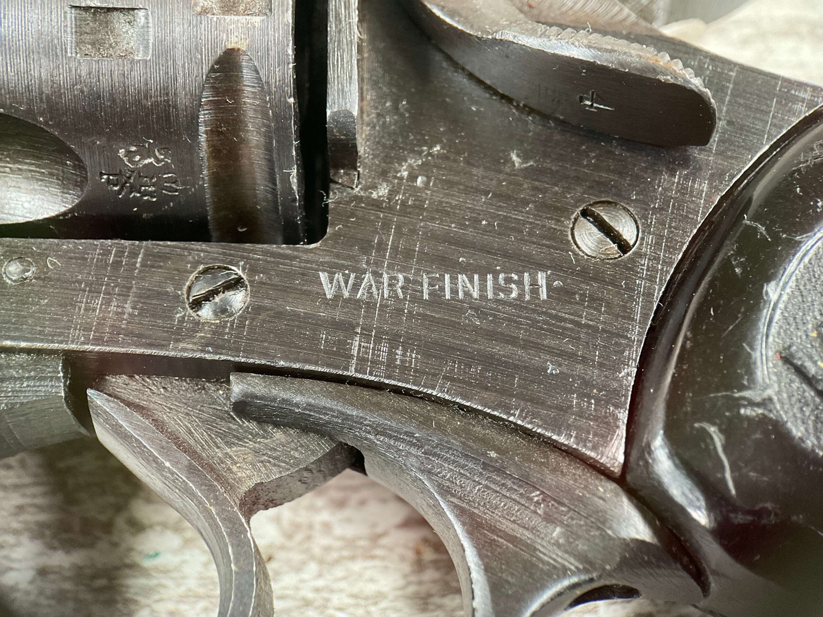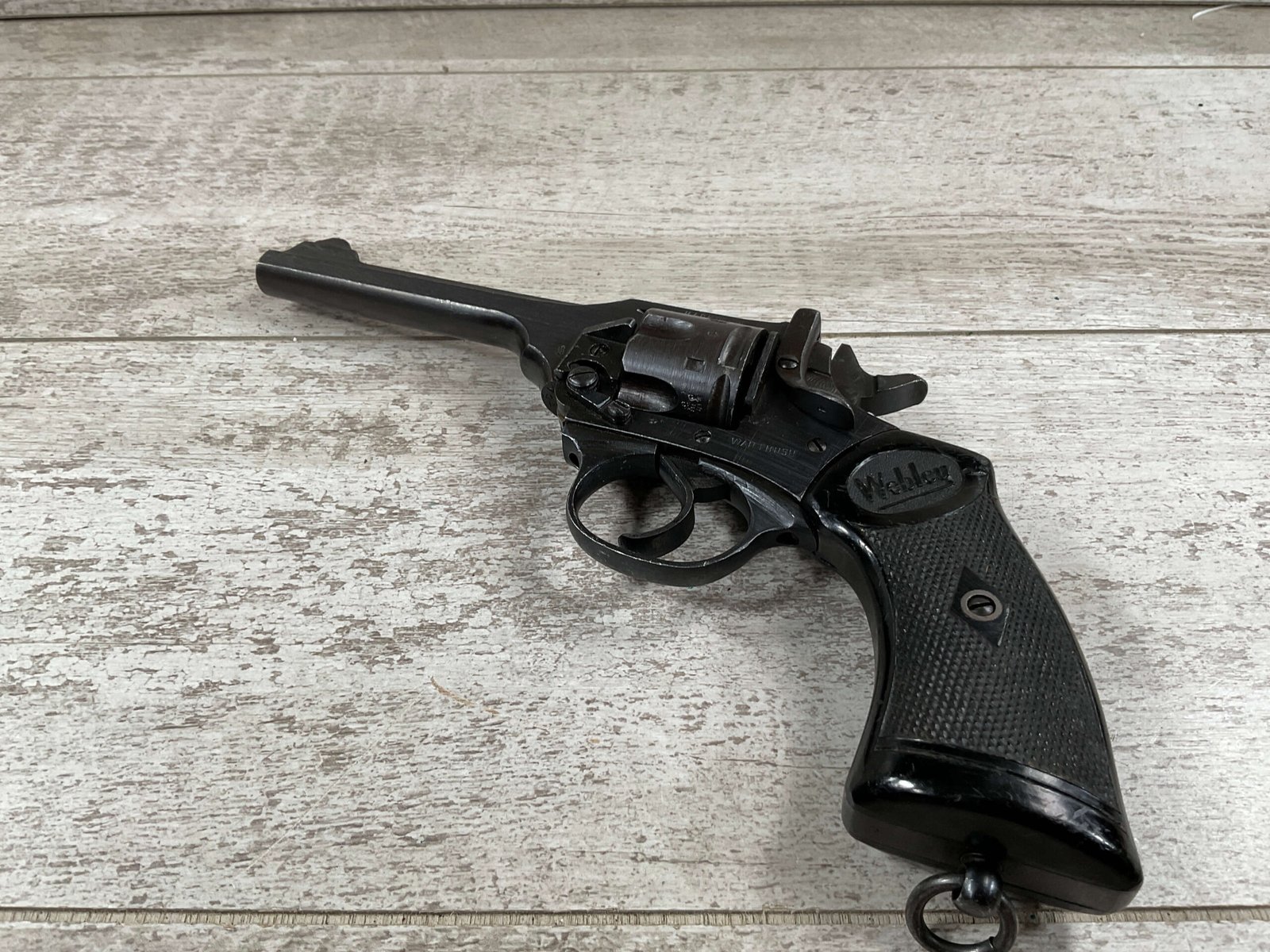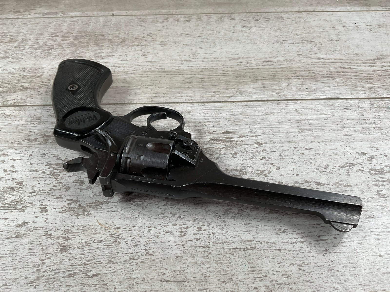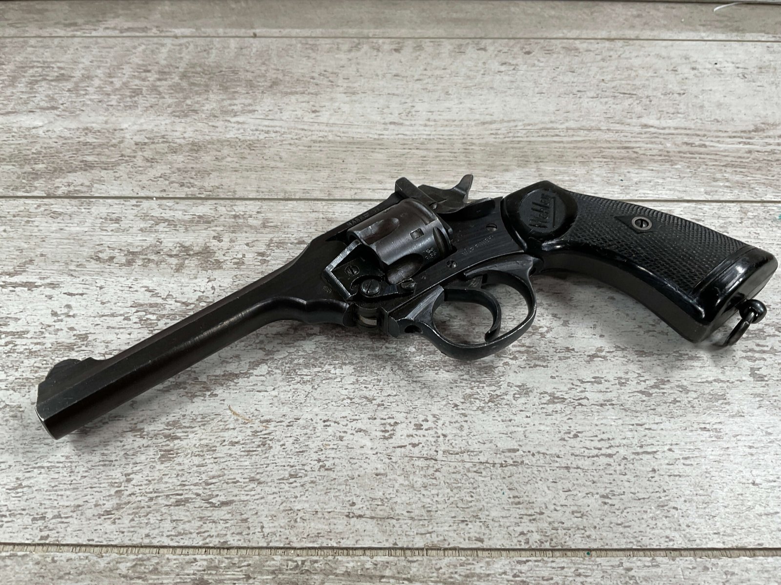 WEBLEY MKIV MARK IV .38-200 REVOLVER W/CANVAS HOLSTER, WAR FINISH #139354, DA, ALL MATCHING, 5″ BBL, EXC BRIGHT BORE & EXC STRONG RIFLING (10/10), EXC BLACK PLASTIC GRIPS MARKED “WEBLEY”, 97+% BLUE, VERY LIGHT HIGH EDGE WEAR, LANYARD RING PRESENT, NO IMPORT MARKS, EXC CANVAS HOLSTER MARKED “LL&T.LTD./1942” INSIDE FLAP, 98%