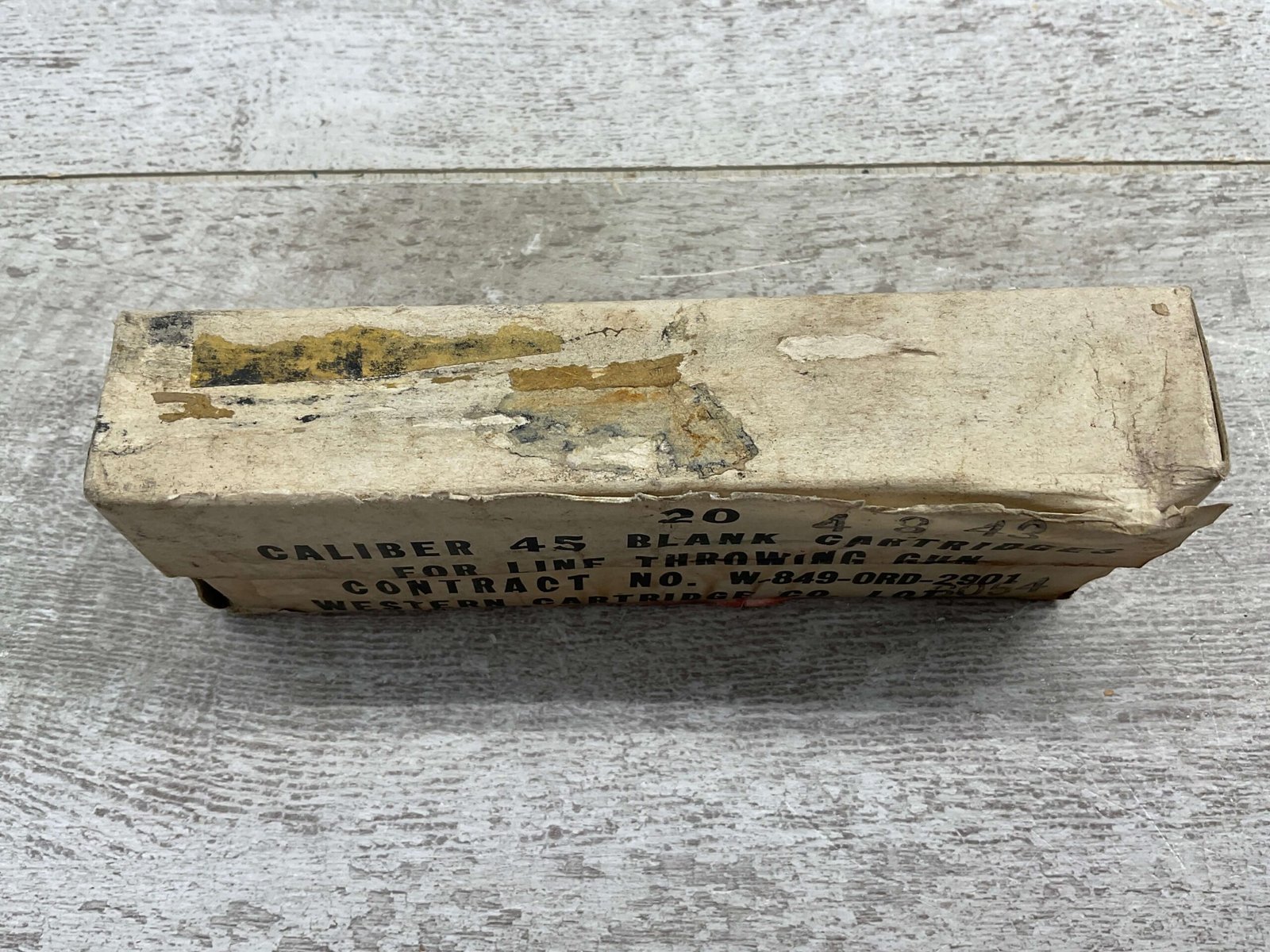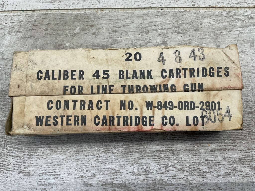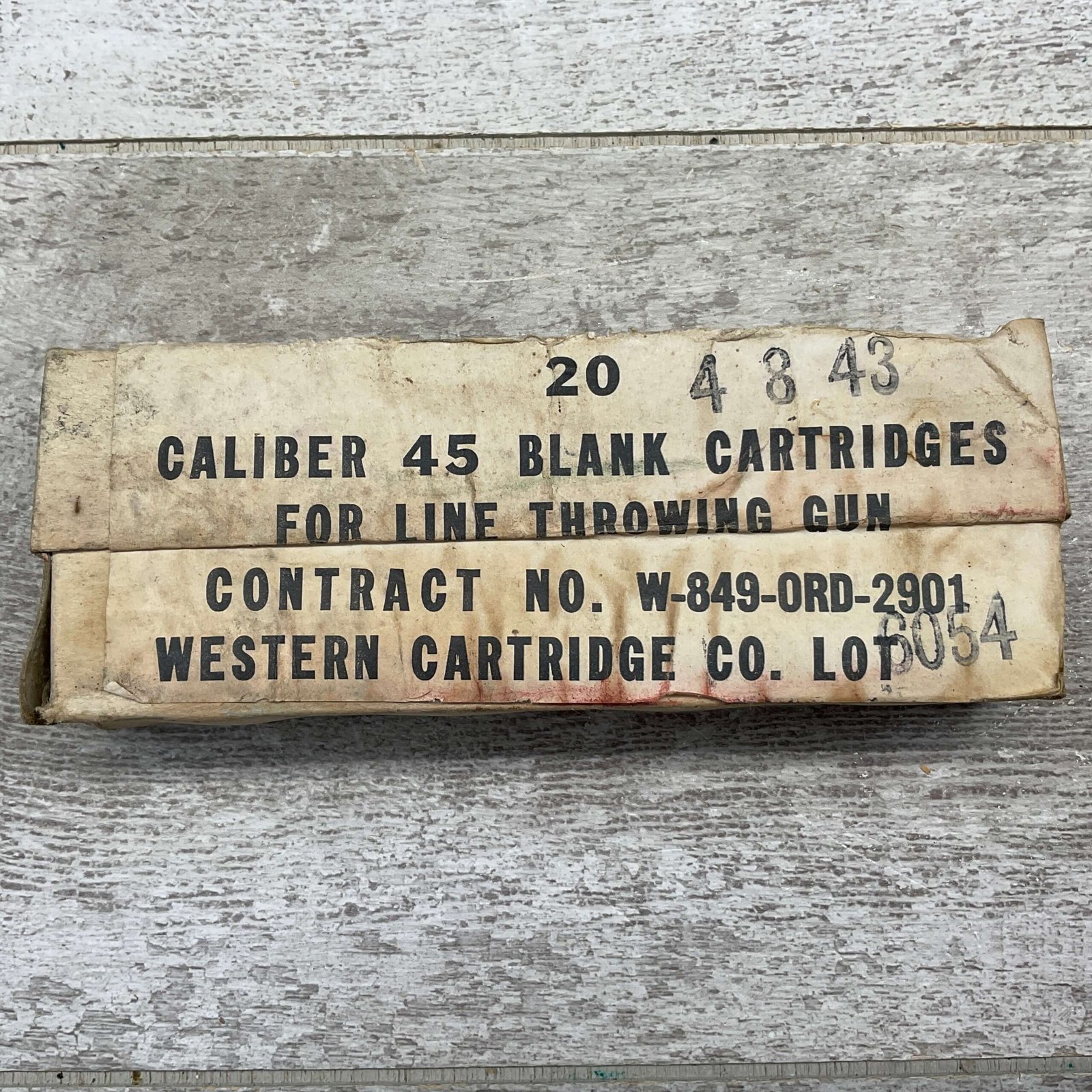 WESTERN CARTRIDGE CO. 45 CAL BLANK CARTRIDGES FOR LINE THROWING GUN, UNOPENED & NEW IN BOX, BOX IS A BIT WORN WITH SOME DAMAGE TO TOPS, BUT IN OVERALL GOOD CONDITION. DATES BACK TO 1950’S/60’S. 2 AVAILABLE.
