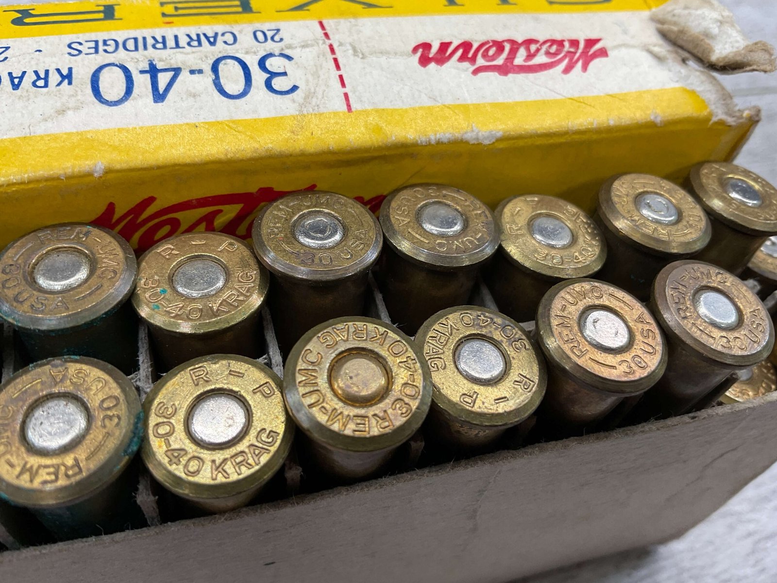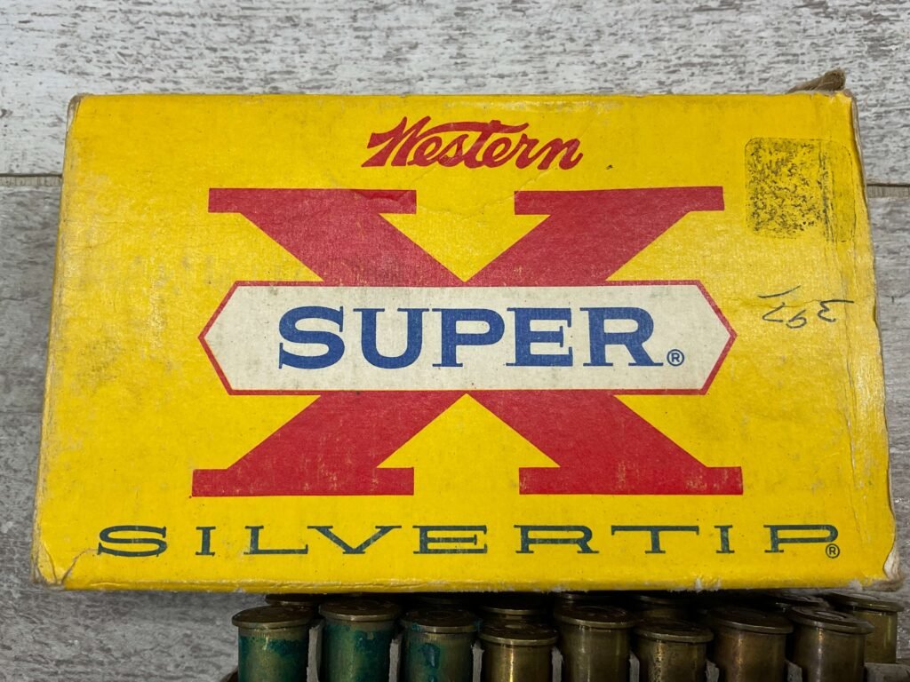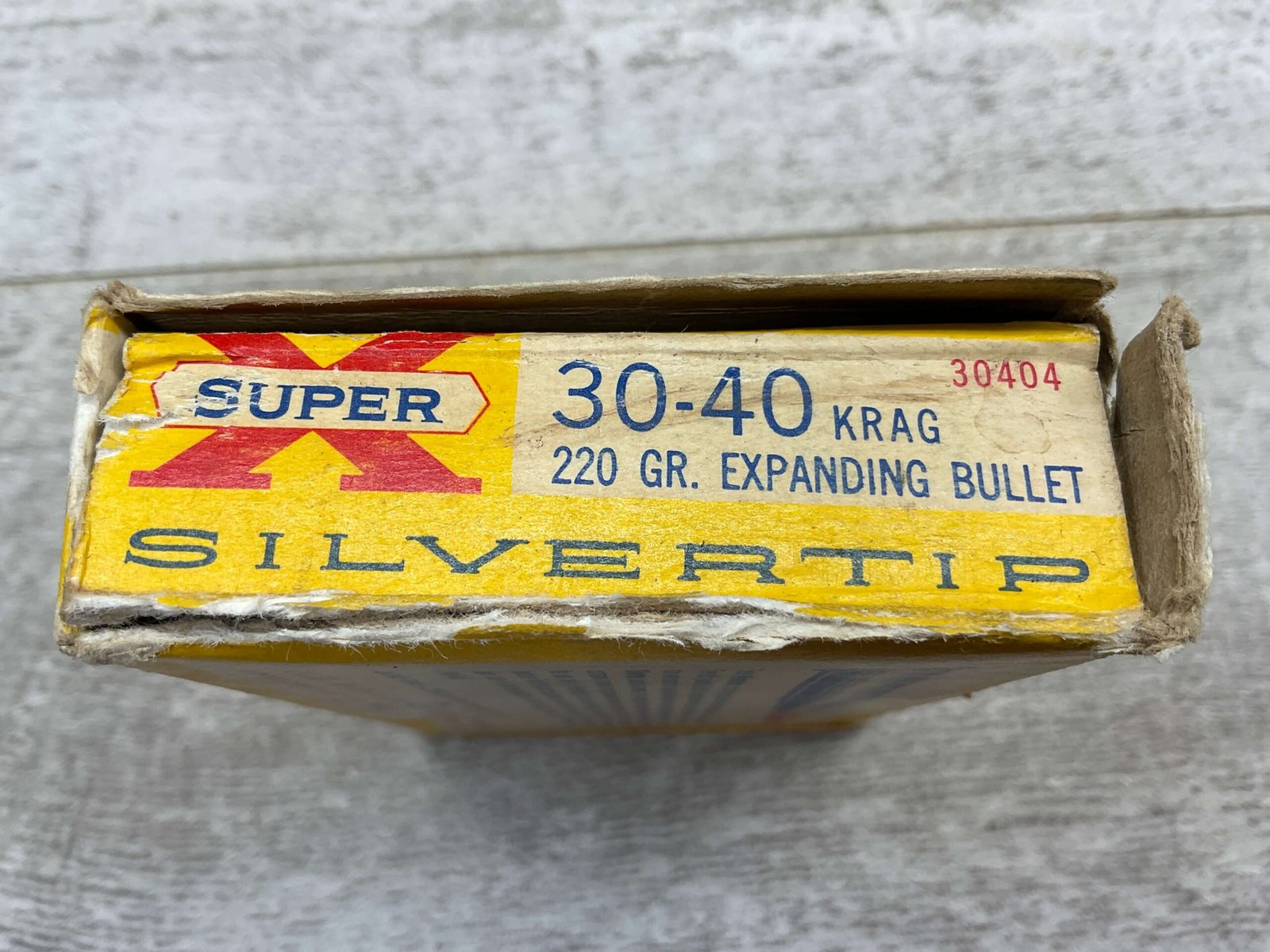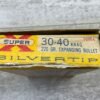 WESTERN SUPER X SILVERTIP 30-40 KRAG, 220 GR. EXPANDING BULLET, VINTAGE AMMO, #30404, 3 EMPTY SHELLS, 17 FULL. BOX IS IN GOOD CONDITION WITH SOME PEN WRITING ON FRONT “397” AND SMALL AMOUNTS OF RIPS EXPECTED FOR AGE.