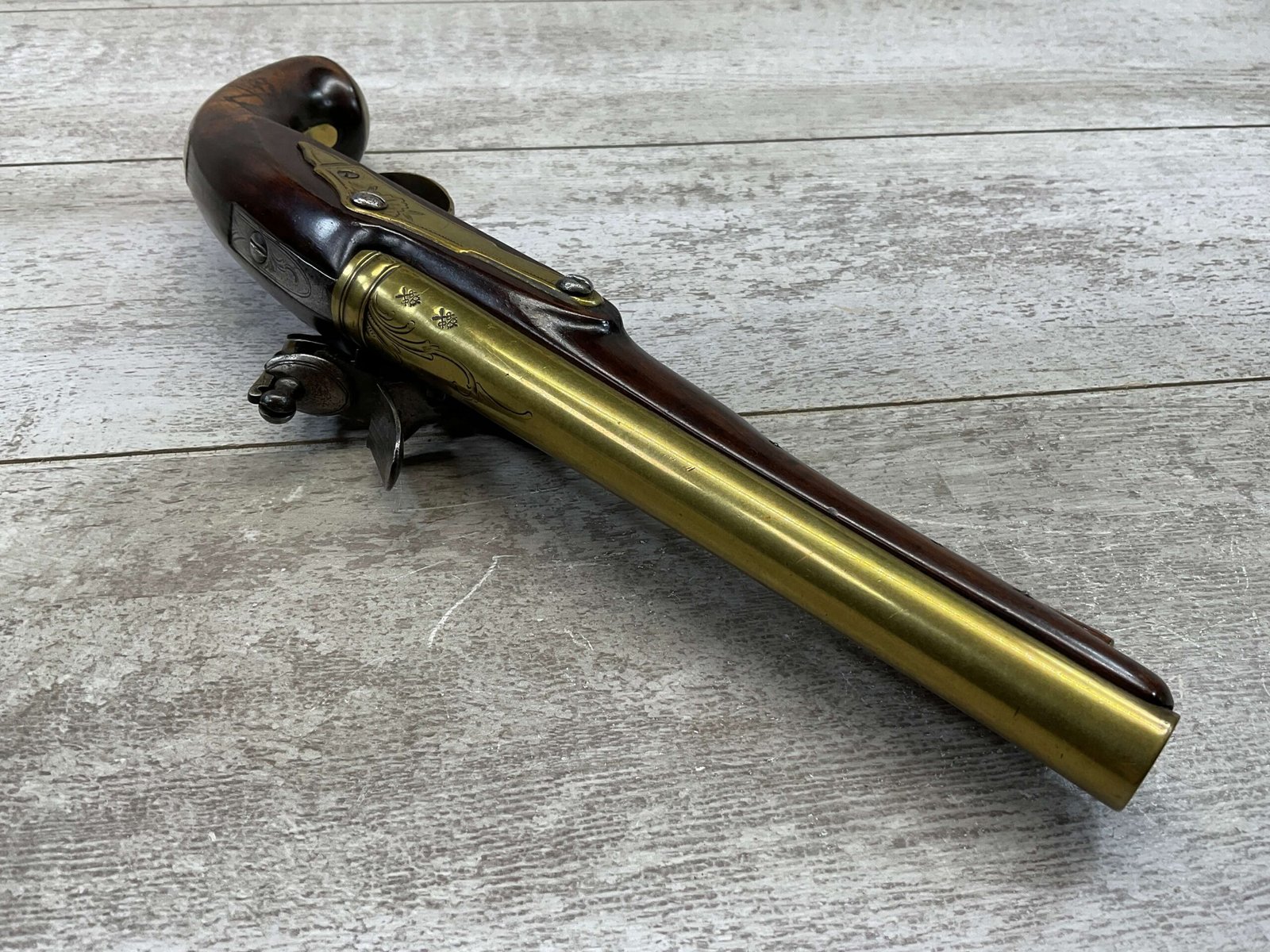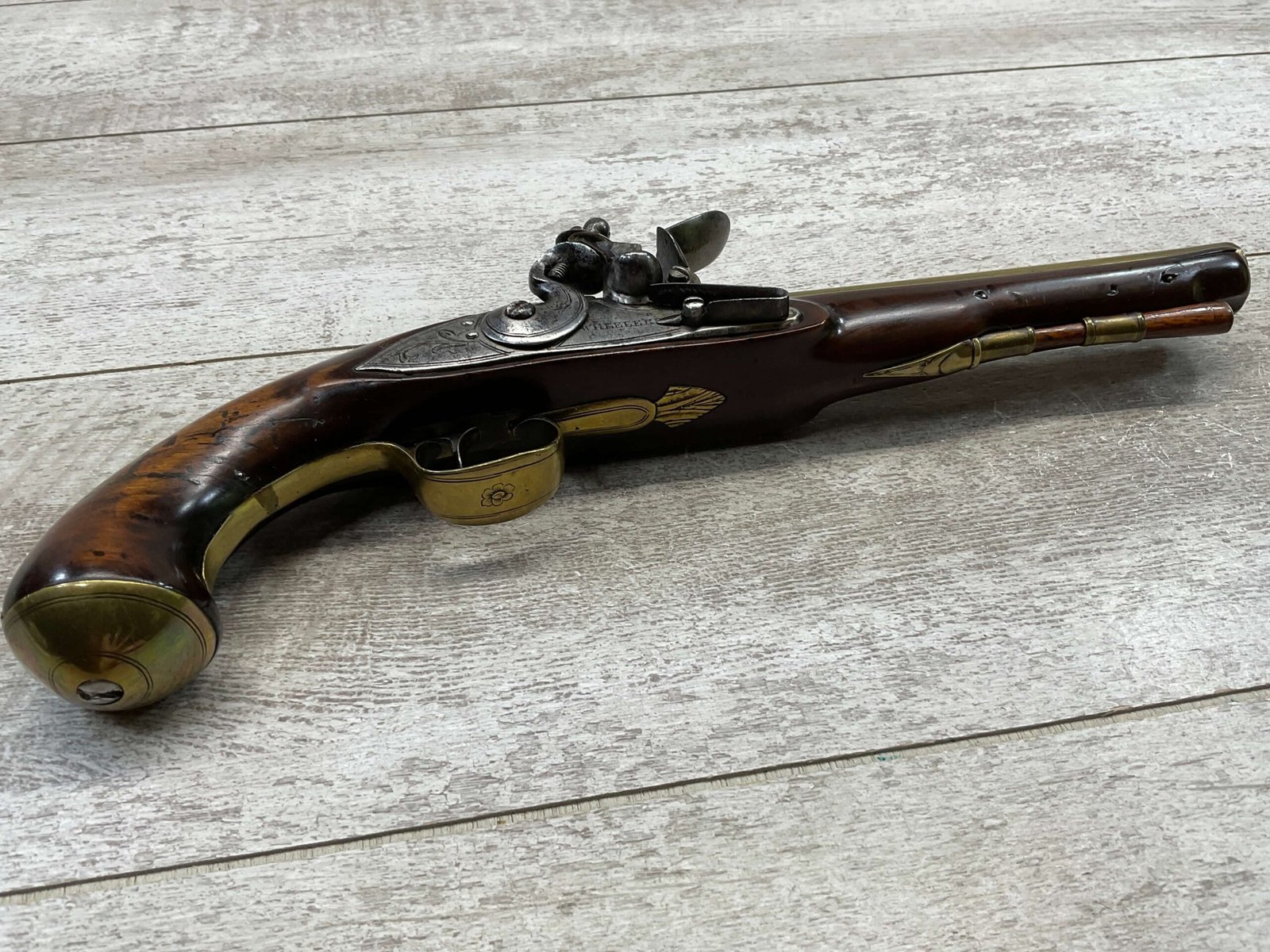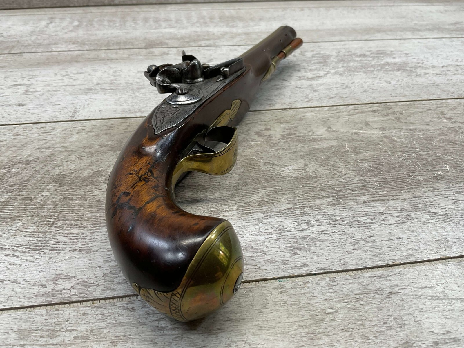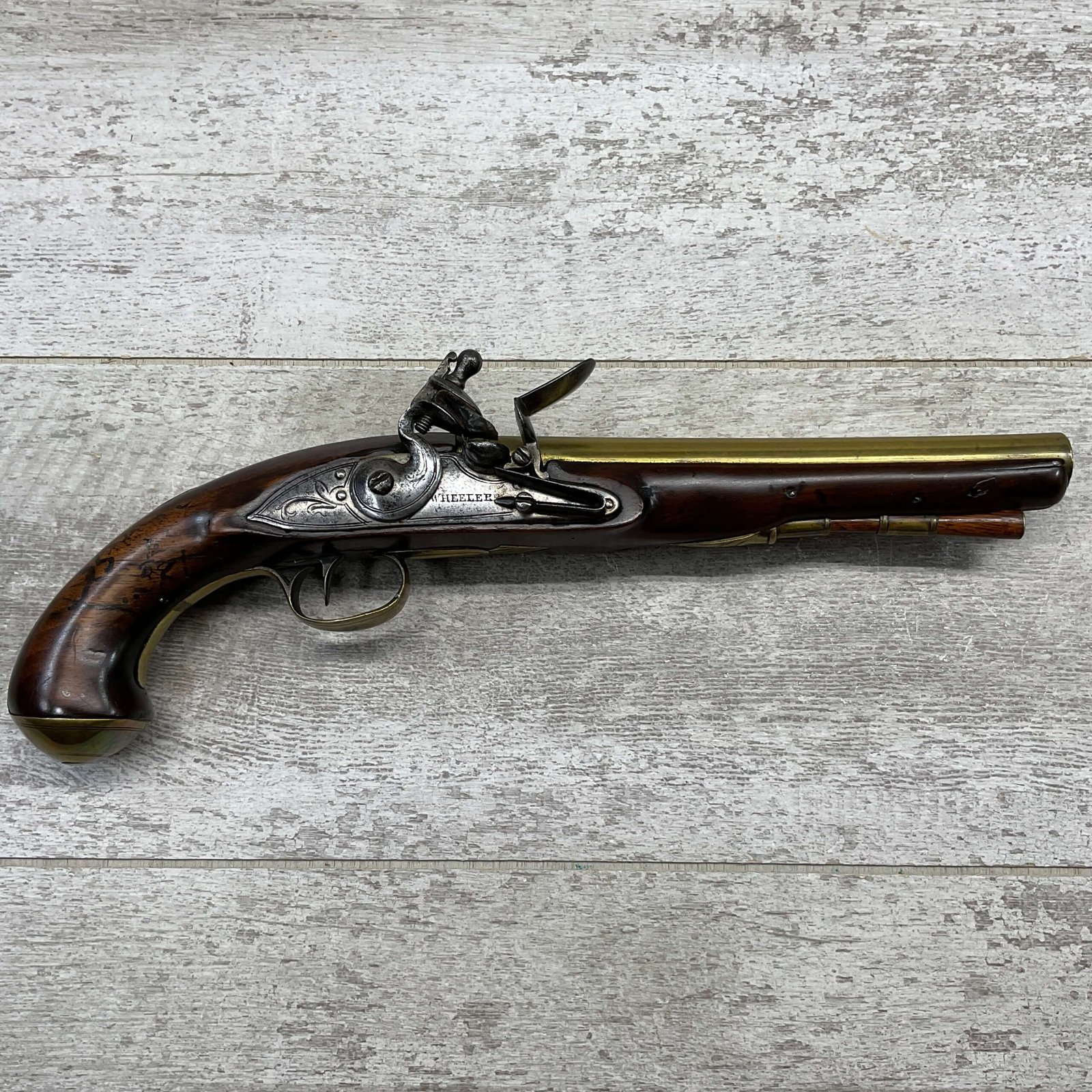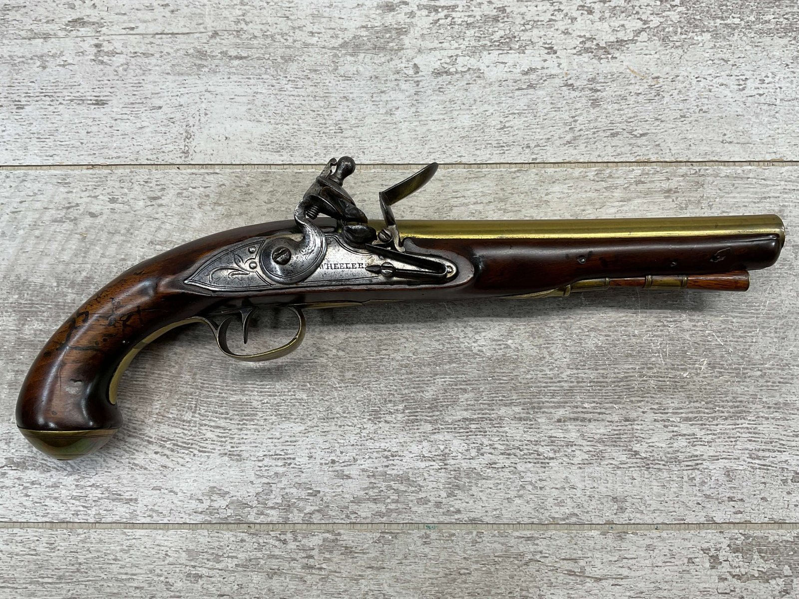 WHEELER ENGLISH FLINTLOCK .57 CAL PISTOL, ANTIQUE #NSN, BRASS FURNITURE & BBL, BIRMINGHAM ENGLAND??, 7″ BBL, BRITISH PROOFS, GOOD WOOD, RAM ROD, CONDITION AS SHOWN IN PICTURES