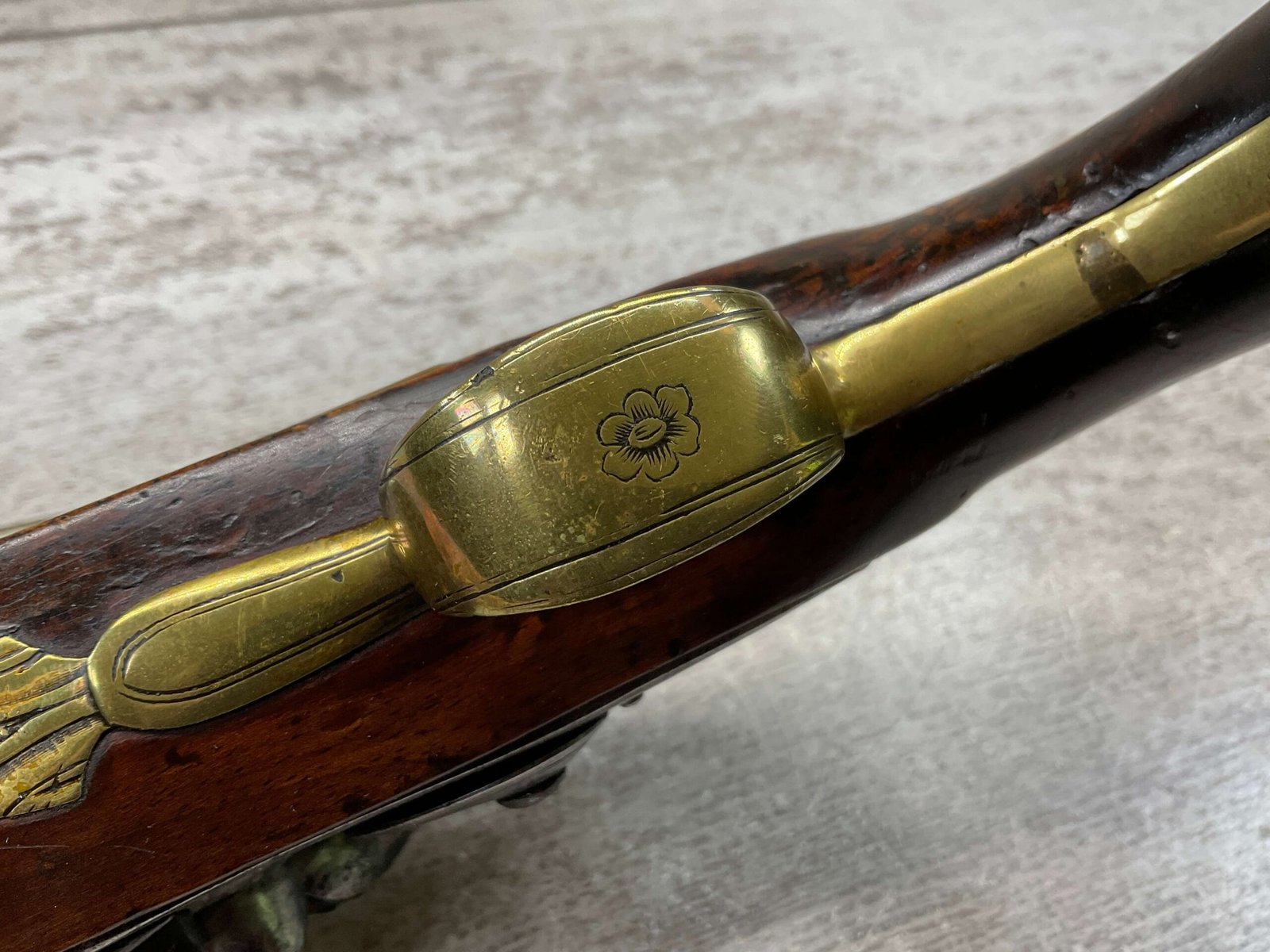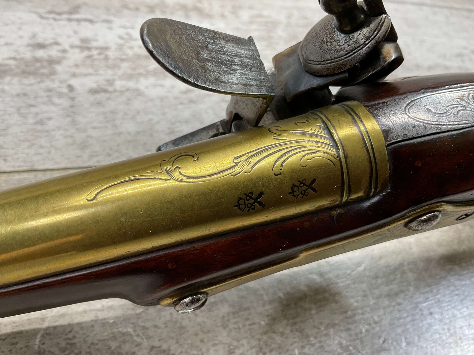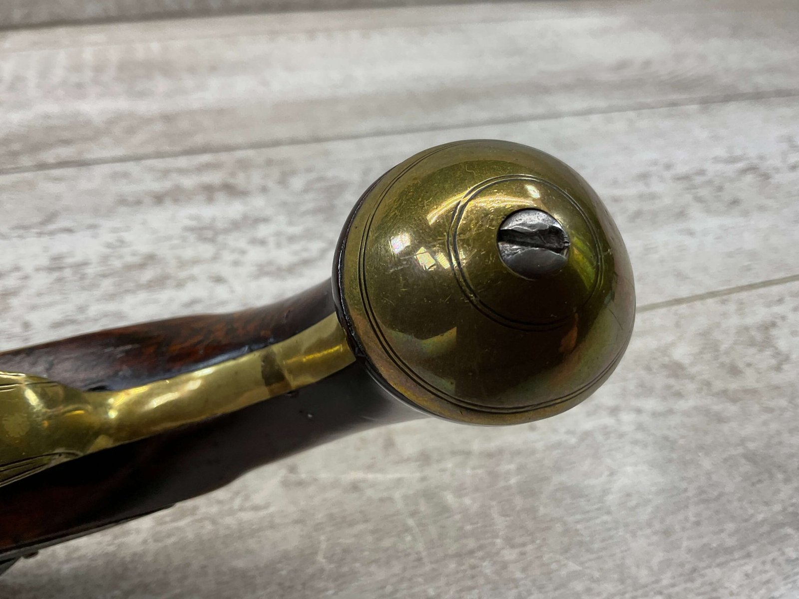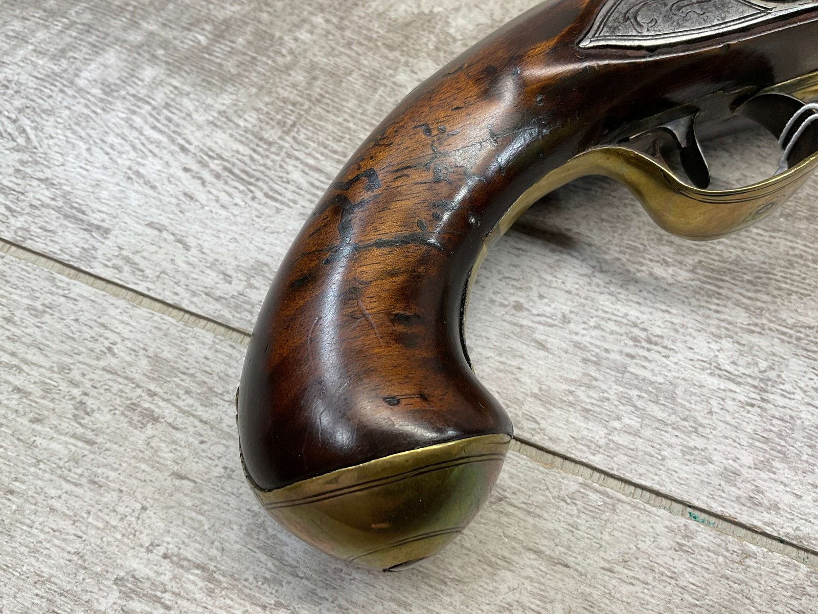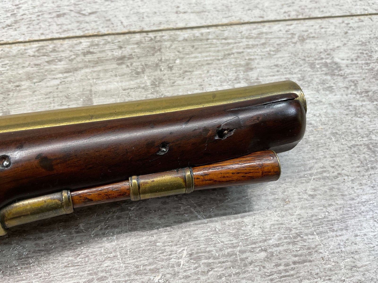 WHEELER ENGLISH FLINTLOCK .57 CAL PISTOL, ANTIQUE #NSN, BRASS FURNITURE & BBL, BIRMINGHAM ENGLAND??, 7″ BBL, BRITISH PROOFS, GOOD WOOD, RAM ROD, CONDITION AS SHOWN IN PICTURES