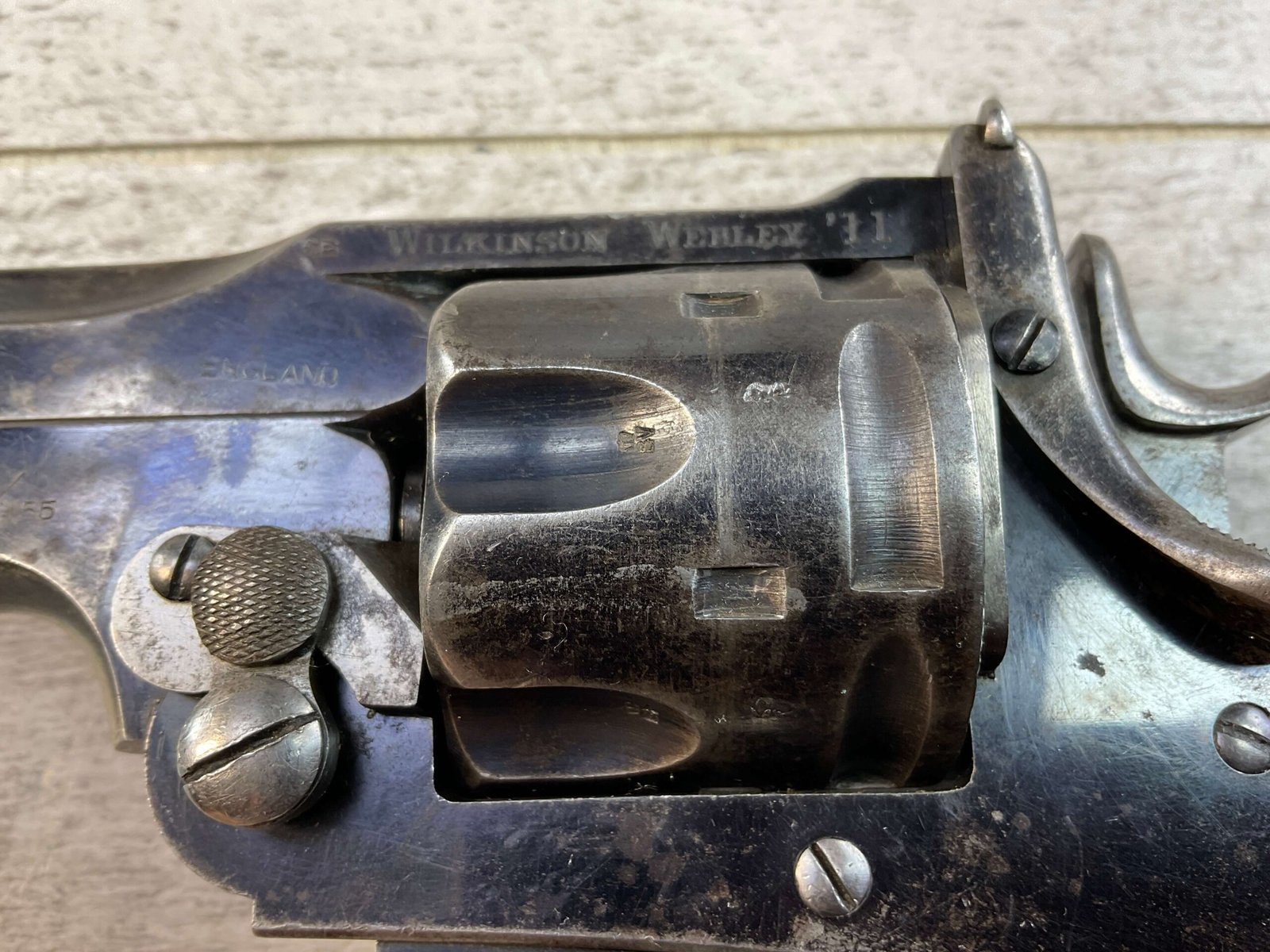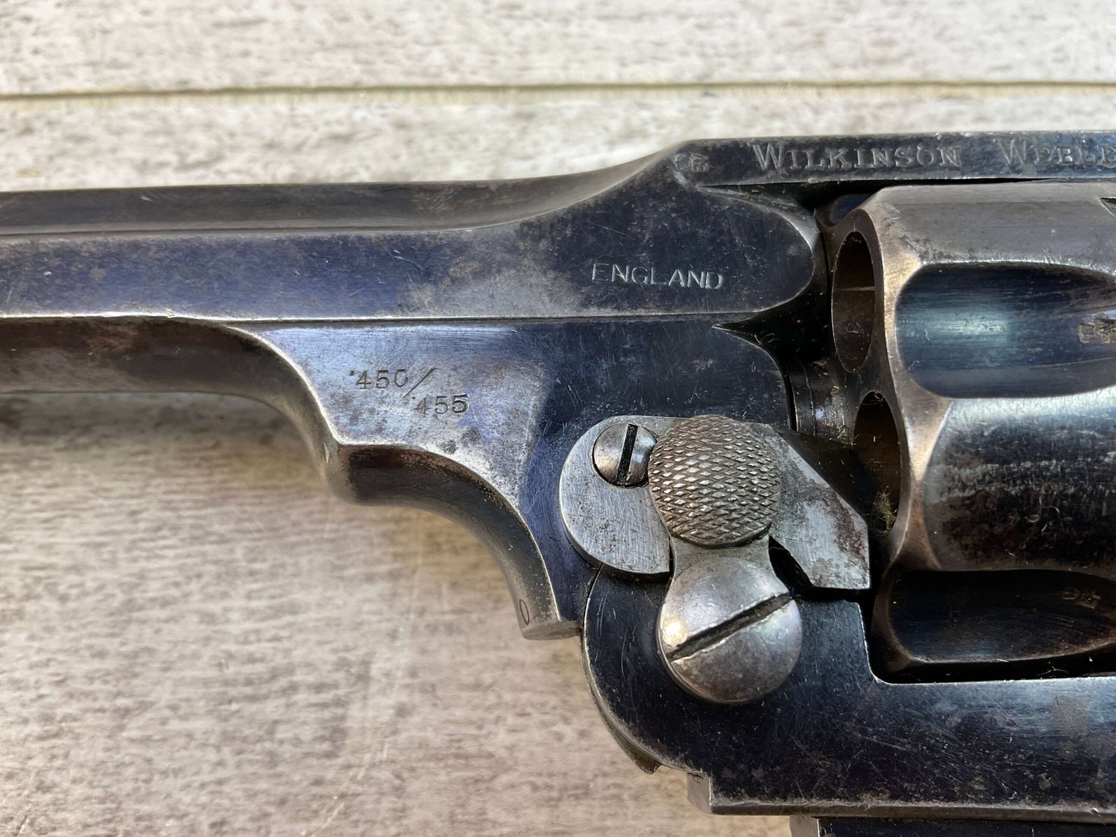 WILKINSON WEBLEY MODEL 1911 .450/.455 TARGET REVOLVER #128800, 7.5″ BARREL, ALL MATCHING INCLUDING THE GRIPS, 6 ROUND FLUTED CYLINDER, DRIFT ADJ REAR SIGHT, BLADE FRONT SIGHT, “WILKINSON WEBLEY MODEL 1911” ON TOP OF BARREL, “WILKINSON WEBLEY ’11” MARKED ABOVE CYLINDER ON TOP STRAP, VG ORIGINAL & MATCHING WALNUT GRIPS W/ WEAR & PIECES MISSING (SEE PHOTOS), TRIGGER GUARD MARKED “4115”, GRIP BACKSTRAP MARKED “J. FORSTER 60TH RIFLES” WHICH REFERS TO “JOHN FORSTER, 2ND LT KING’S ROYAL RIFLE CORPS 2ND BN” ATTACHED PROVINANCE, CONDITION AS SHOWN IN PICTURES, FROM THE JAMES EARL JONES “FAVORITES” COLLECTION W/ CERTIFICATE OF AUTHENTICITY.