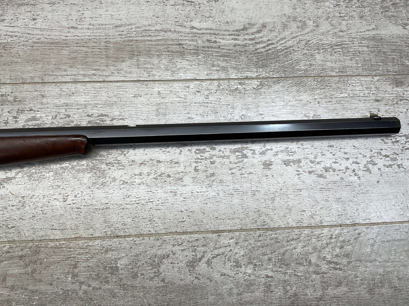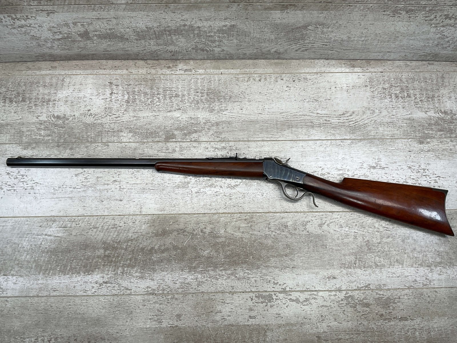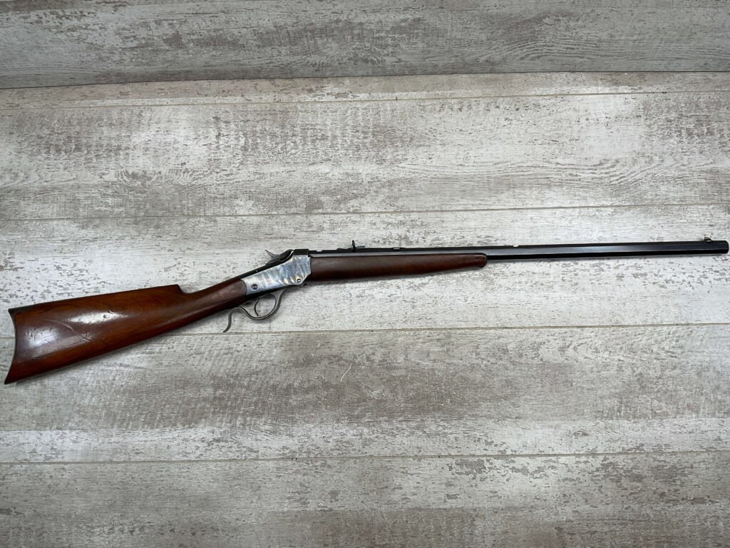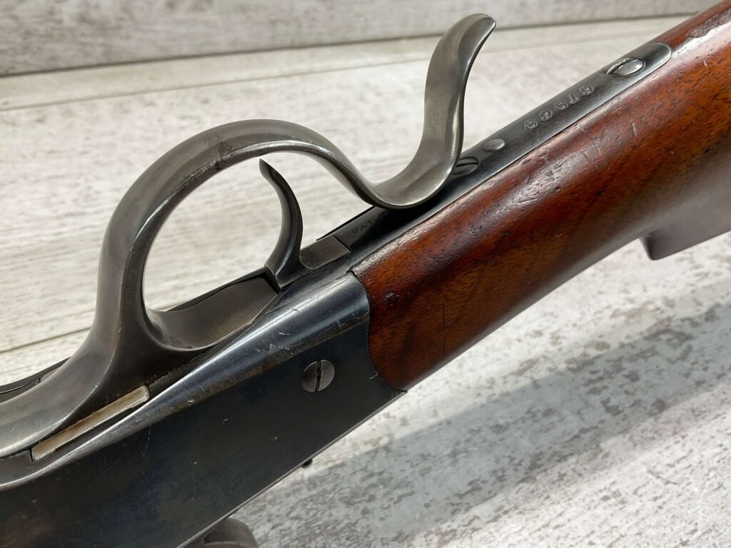 WINCHESTER 1885 LOW WALL SINGLE SHOT .22LR RIFLE, 1901 MFR #89819, 24 3/8″ OCTAGON BARREL, SINGLE SHOT FALLING BLOCK, 70%+ BLUE ON RECEIVER, VG WOOD STOCK W/ NORMAL DINGS NICKS FROM AGE / USE, EXC BORE & RIFLING (NEEDS CLEANING), CRESCENT BUTT STOCK W/ METAL PLATE, VG OVERALL NICE 100+YR OLD GUN!