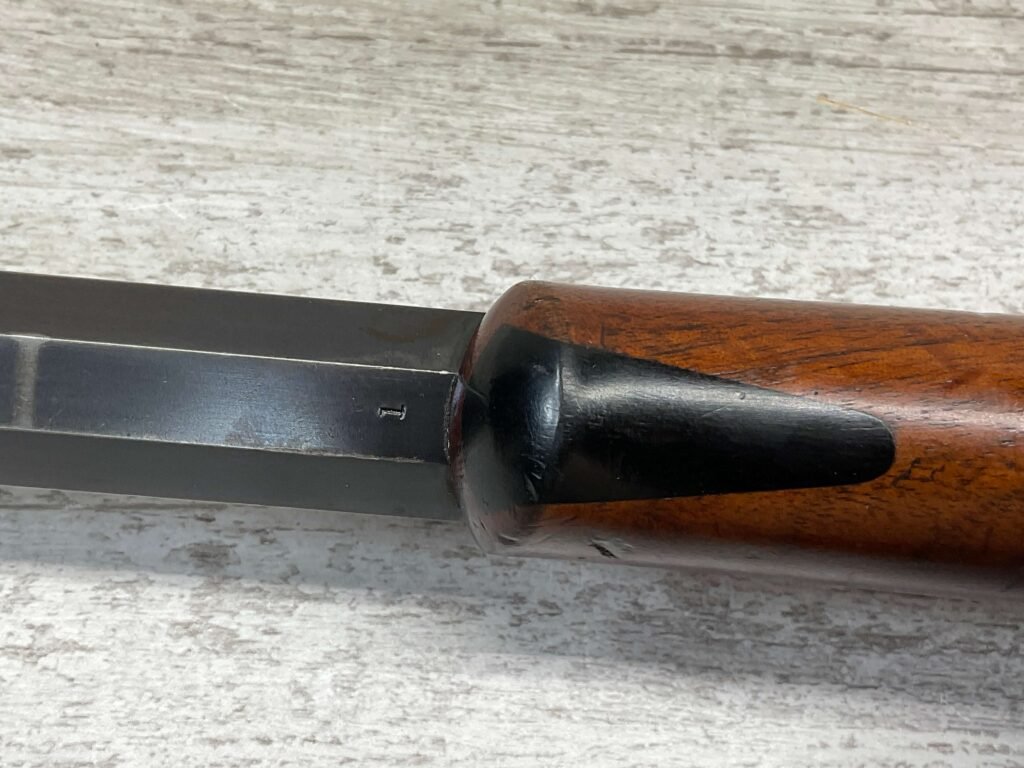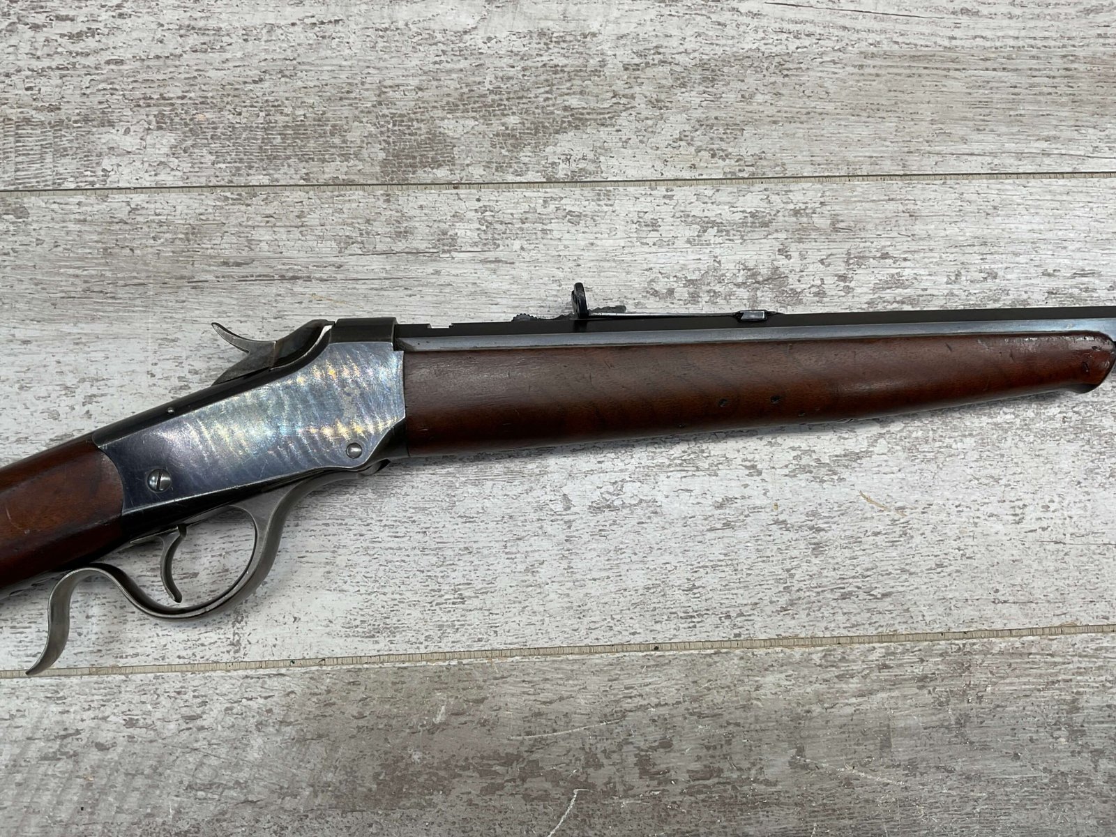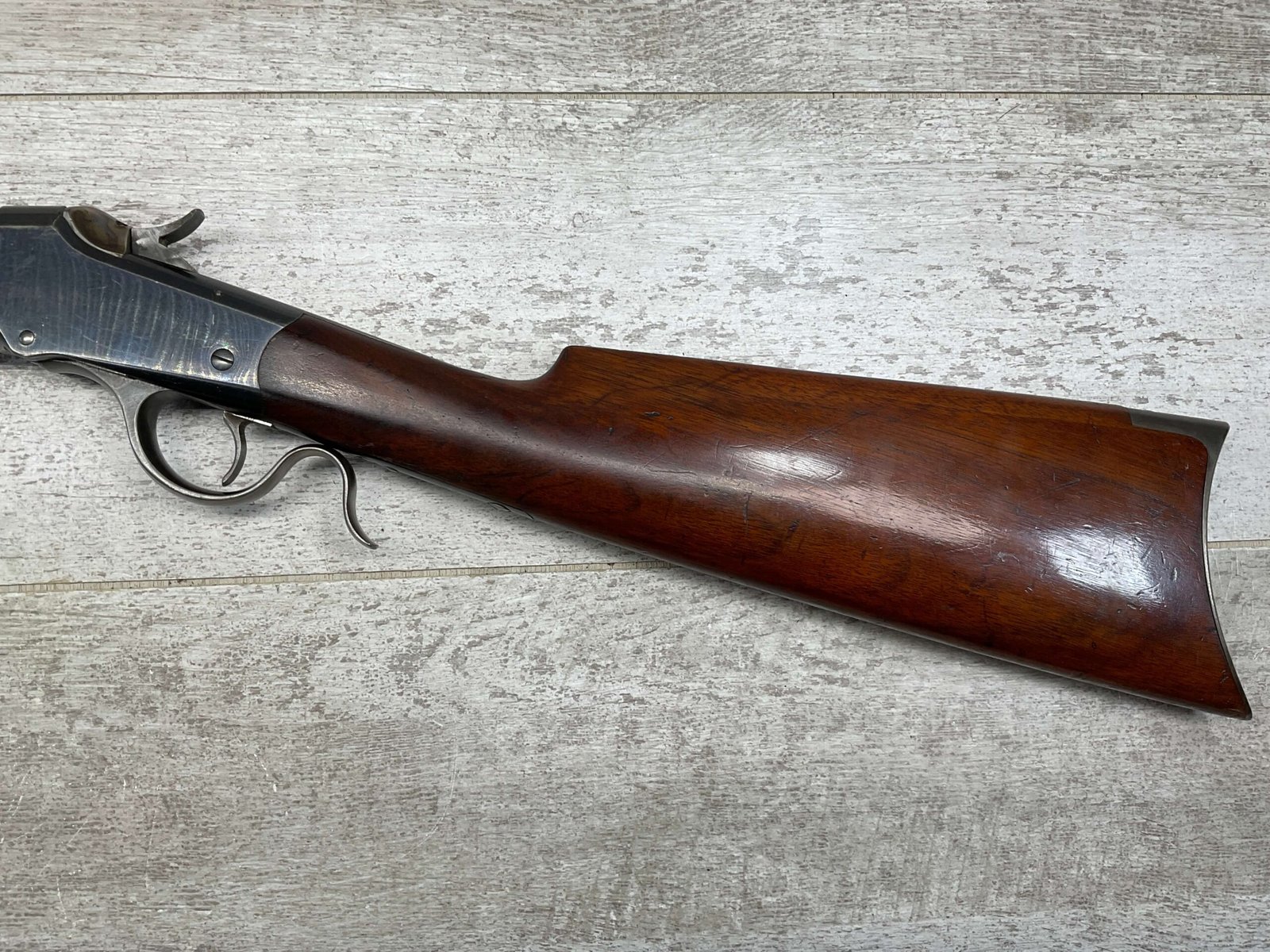 WINCHESTER 1885 LOW WALL SINGLE SHOT .22LR RIFLE, 1901 MFR #89819, 24 3/8″ OCTAGON BARREL, SINGLE SHOT FALLING BLOCK, 70%+ BLUE ON RECEIVER, VG WOOD STOCK W/ NORMAL DINGS NICKS FROM AGE / USE, EXC BORE & RIFLING (NEEDS CLEANING), CRESCENT BUTT STOCK W/ METAL PLATE, VG OVERALL NICE 100+YR OLD GUN!