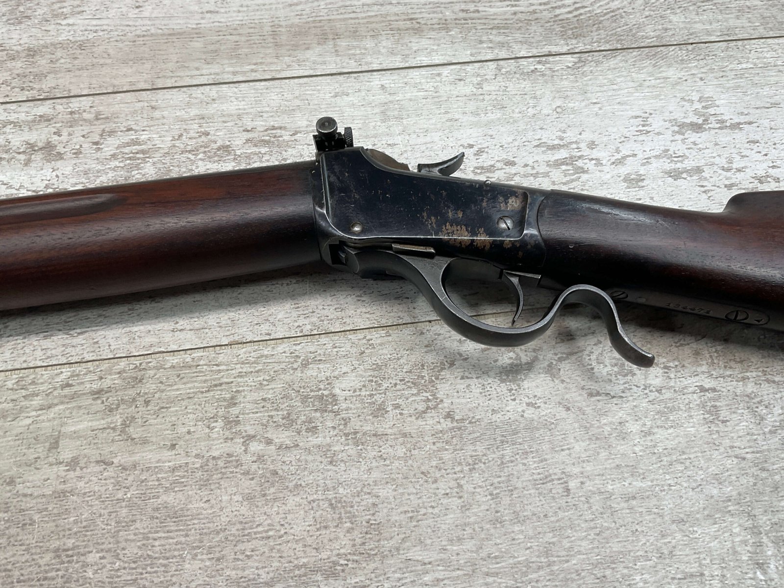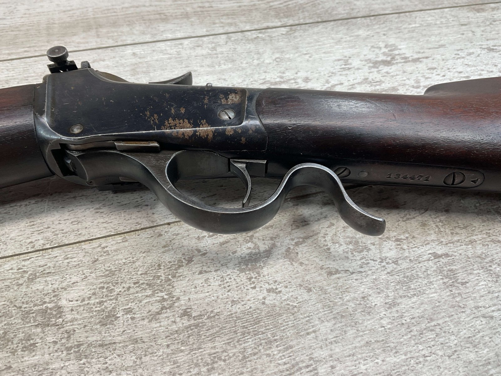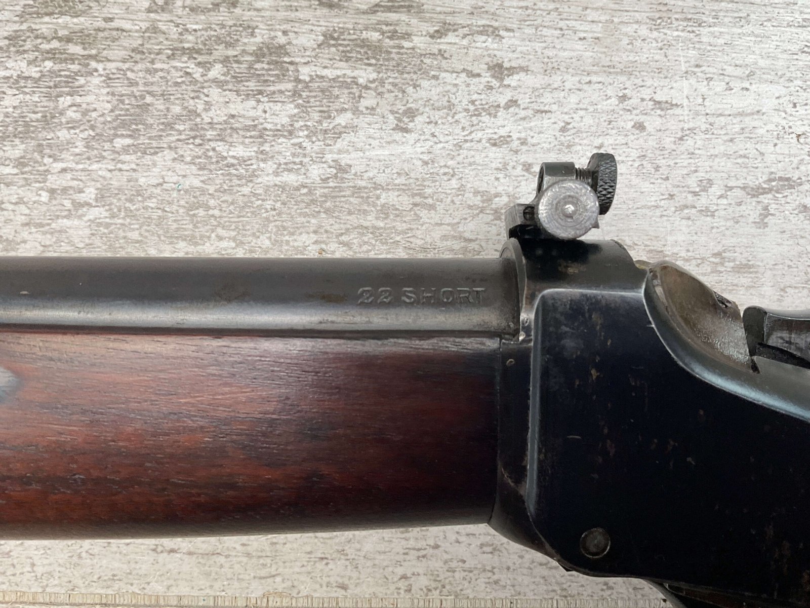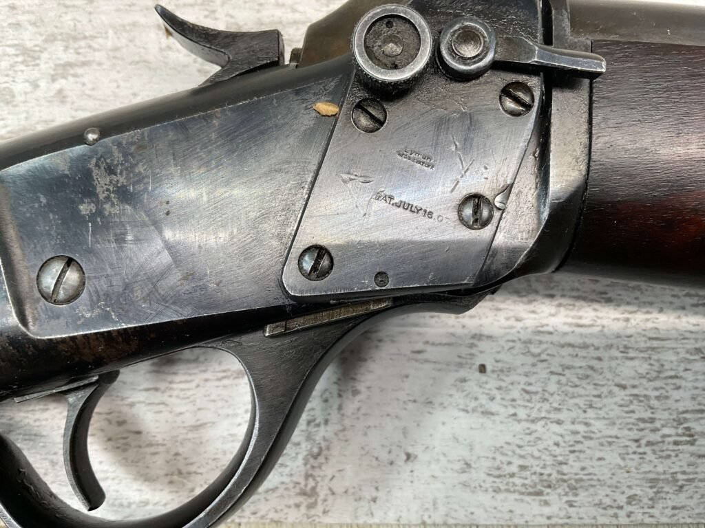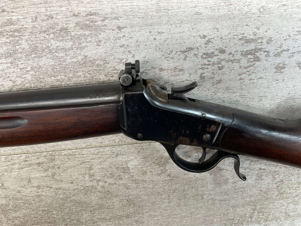 WINCHESTER 1885 LOW WALL MUSKET (WINDER MUSKET) SINGLE SHOT .22 SHORT, 1919 MFR #134471, 28″ ROUND BARREL, FRONT SIGHT FIXED DOVETAIL W/ADJ RECEIVER PEEP SIGHT, GOOD RIFLING W/LIGHT FROSTING THROUGH OUT, ORIGINAL BLUED FINISH IS WORN AT THE HAND GRIP; THE REST OF THE FINISH IS VG/EXC TURING A LIGHT RUST BROWN PATINA, FURNITURE IS IN VG/EXC, METAL END CAP, SWIVEL SLING LOOP & METAL BUTT PLATE, OVERALL 90+