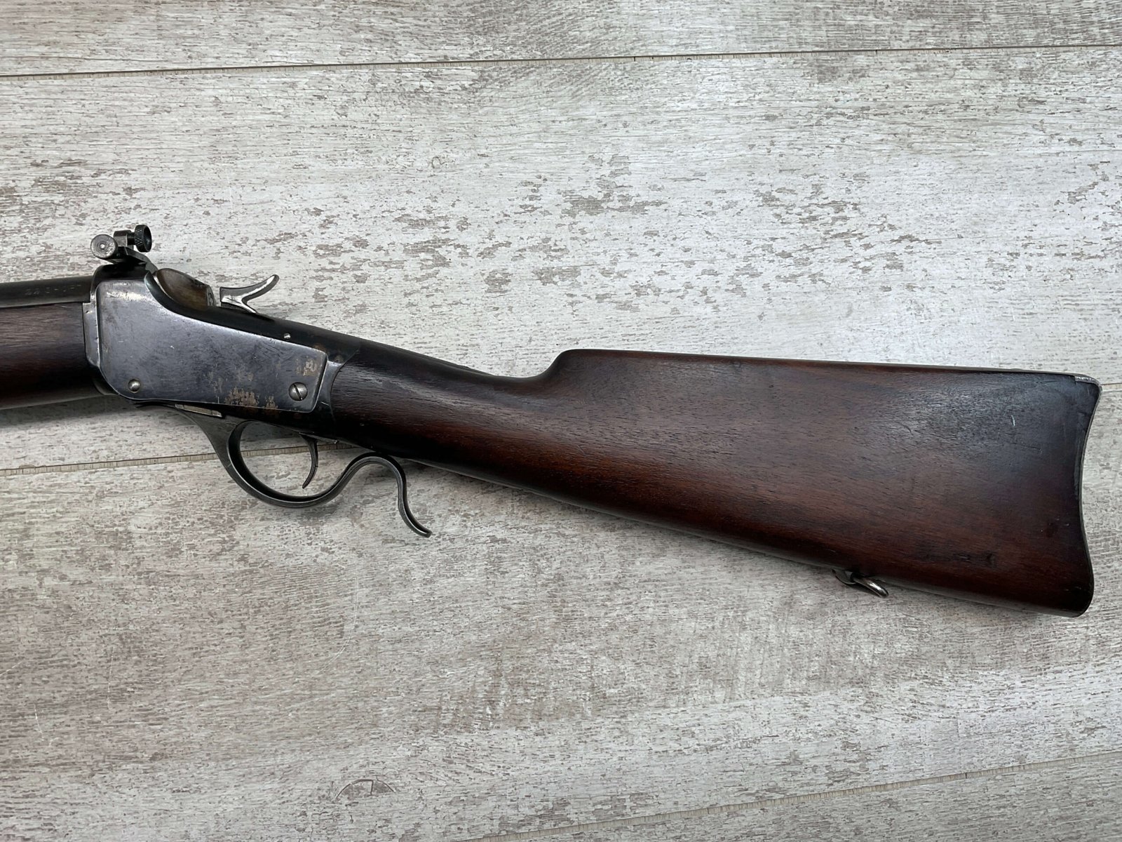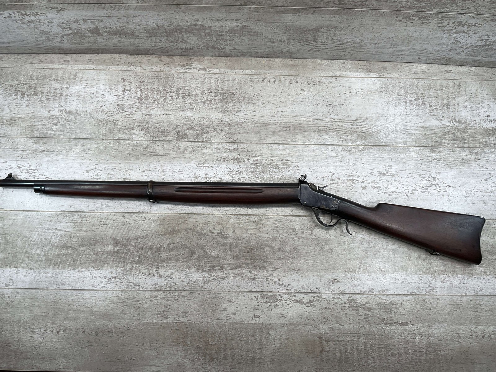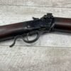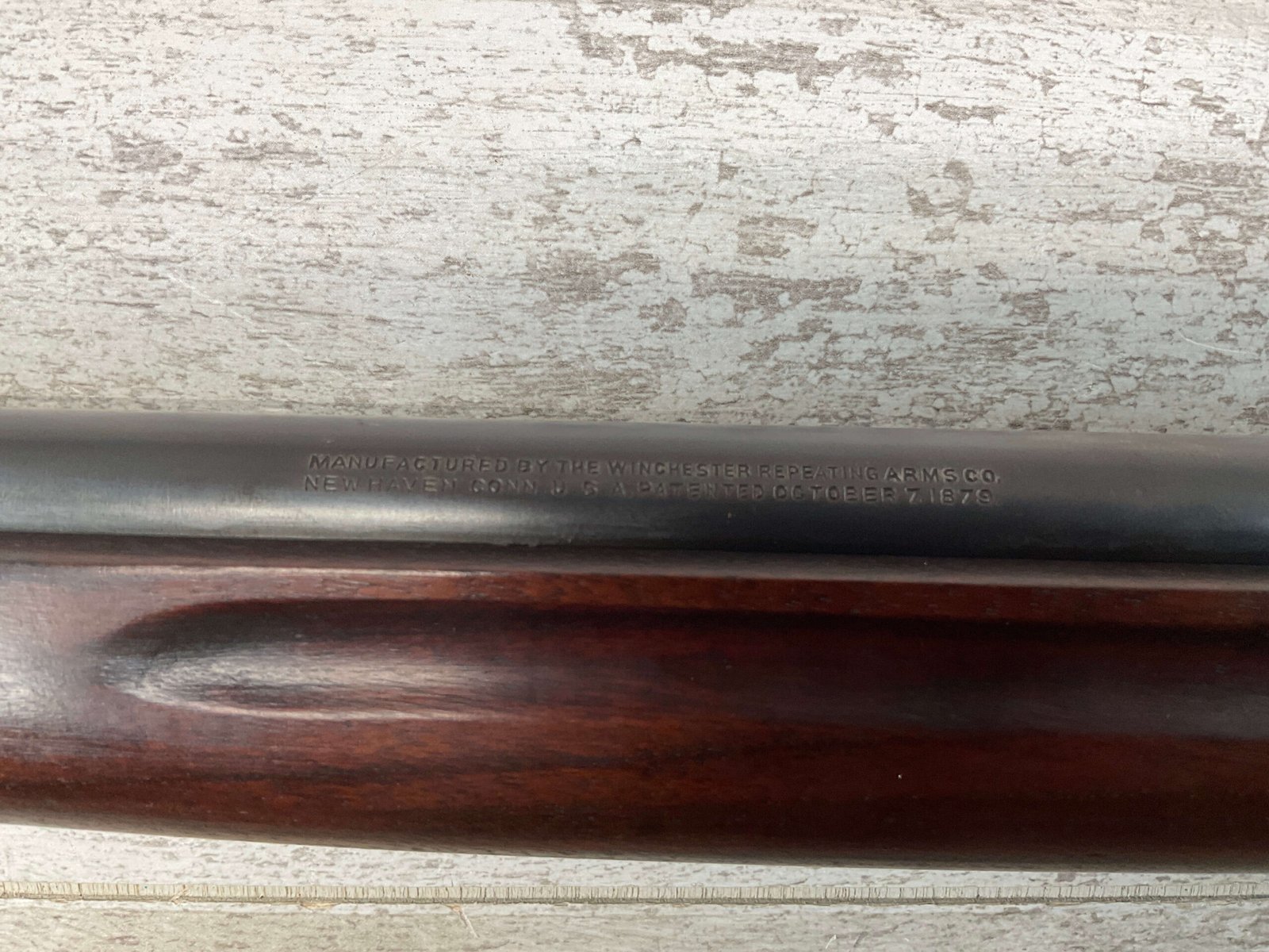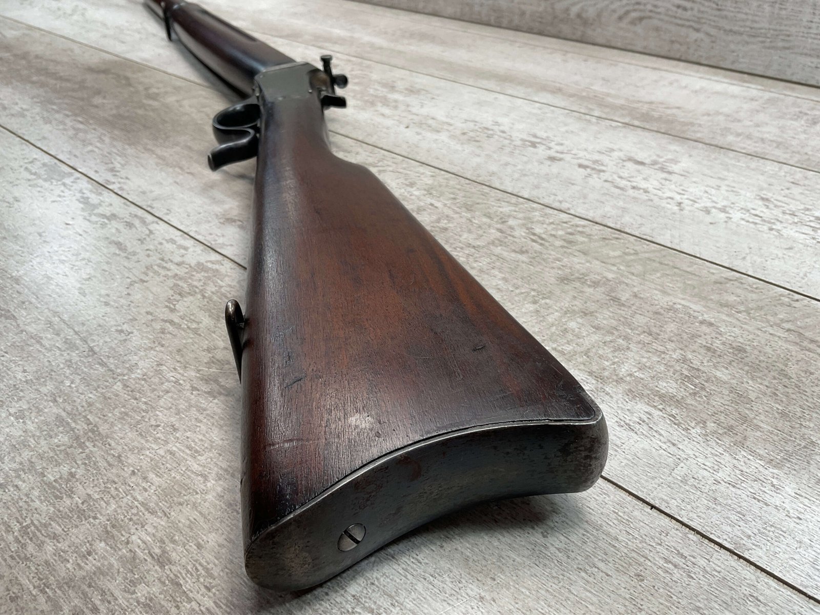 WINCHESTER 1885 LOW WALL MUSKET (WINDER MUSKET) SINGLE SHOT .22 SHORT, 1919 MFR #134471, 28″ ROUND BARREL, FRONT SIGHT FIXED DOVETAIL W/ADJ RECEIVER PEEP SIGHT, GOOD RIFLING W/LIGHT FROSTING THROUGH OUT, ORIGINAL BLUED FINISH IS WORN AT THE HAND GRIP; THE REST OF THE FINISH IS VG/EXC TURING A LIGHT RUST BROWN PATINA, FURNITURE IS IN VG/EXC, METAL END CAP, SWIVEL SLING LOOP & METAL BUTT PLATE, OVERALL 90+
