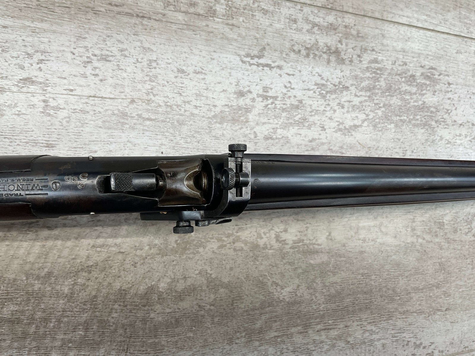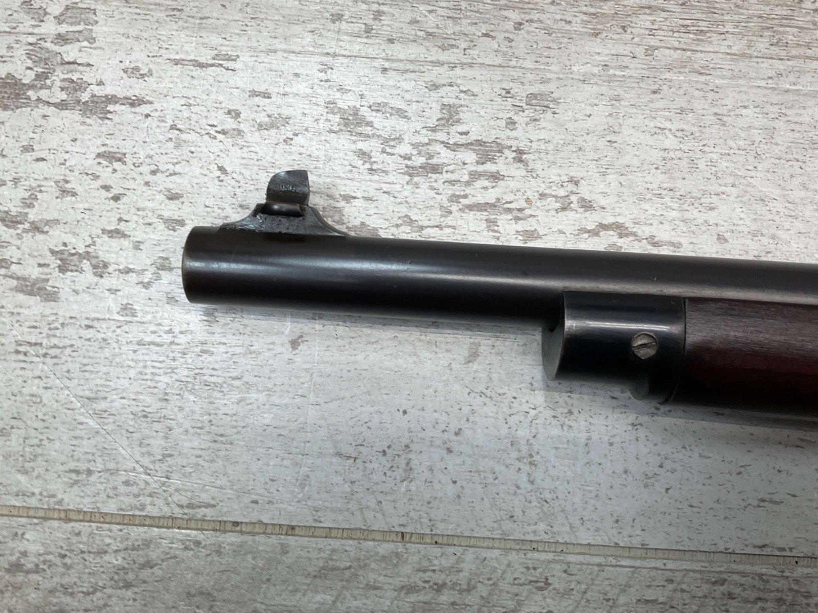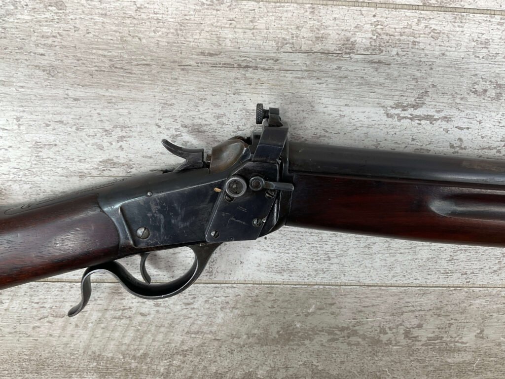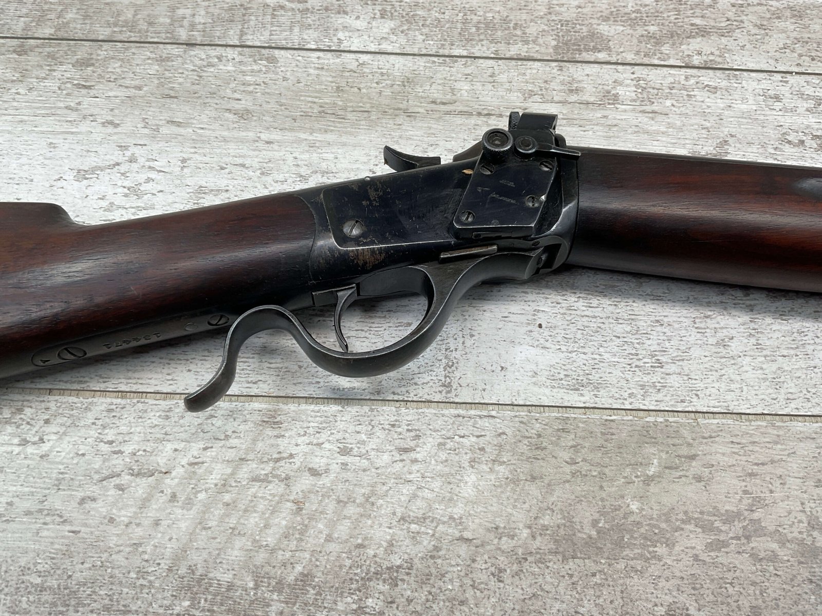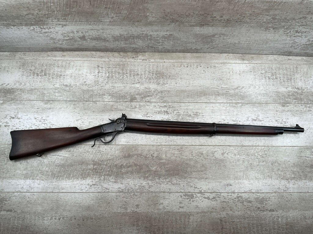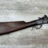 WINCHESTER 1885 LOW WALL MUSKET (WINDER MUSKET) SINGLE SHOT .22 SHORT, 1919 MFR #134471, 28″ ROUND BARREL, FRONT SIGHT FIXED DOVETAIL W/ADJ RECEIVER PEEP SIGHT, GOOD RIFLING W/LIGHT FROSTING THROUGH OUT, ORIGINAL BLUED FINISH IS WORN AT THE HAND GRIP; THE REST OF THE FINISH IS VG/EXC TURING A LIGHT RUST BROWN PATINA, FURNITURE IS IN VG/EXC, METAL END CAP, SWIVEL SLING LOOP & METAL BUTT PLATE, OVERALL 90+