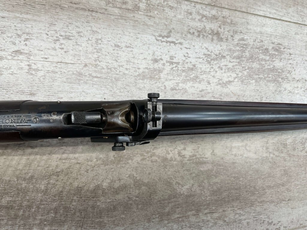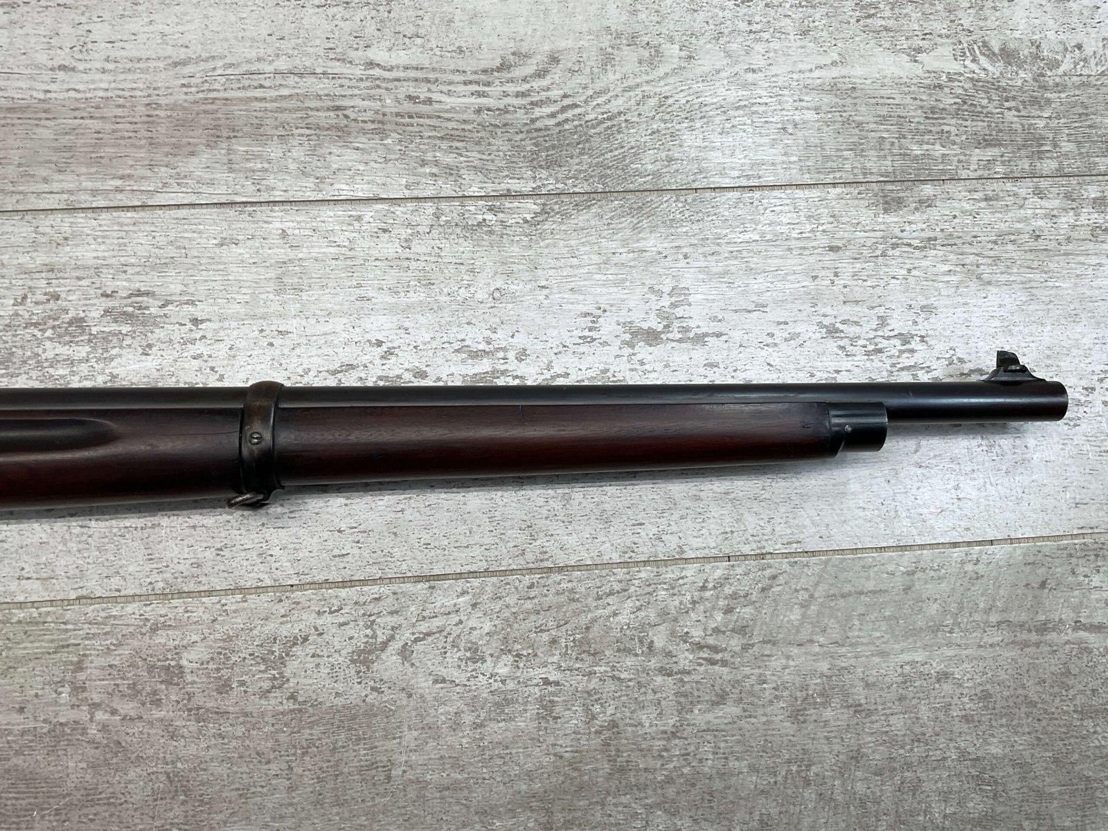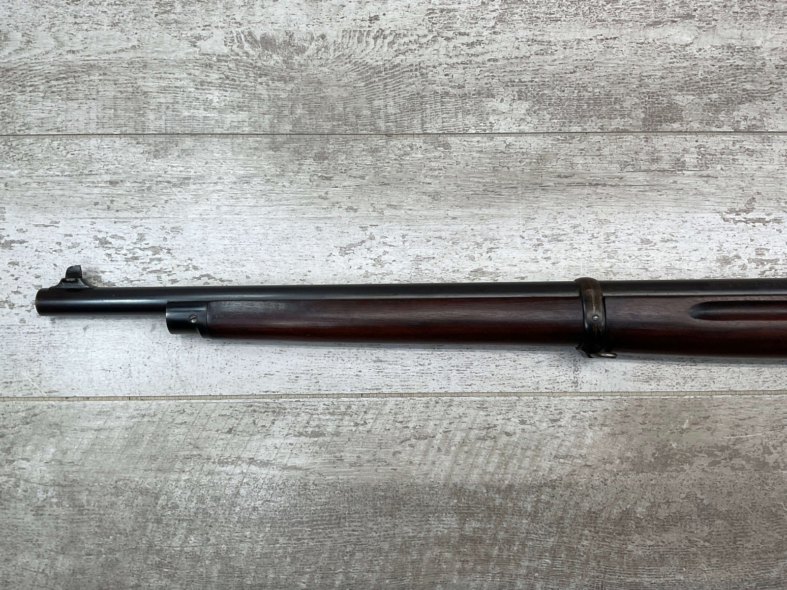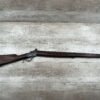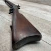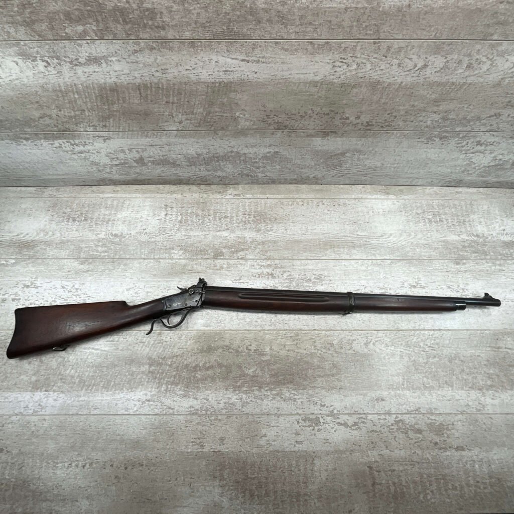WINCHESTER 1885 LOW WALL MUSKET (WINDER MUSKET) SINGLE SHOT .22 SHORT, 1919 MFR #134471, 28″ ROUND BARREL, FRONT SIGHT FIXED DOVETAIL W/ADJ RECEIVER PEEP SIGHT, GOOD RIFLING W/LIGHT FROSTING THROUGH OUT, ORIGINAL BLUED FINISH IS WORN AT THE HAND GRIP; THE REST OF THE FINISH IS VG/EXC TURING A LIGHT RUST BROWN PATINA, FURNITURE IS IN VG/EXC, METAL END CAP, SWIVEL SLING LOOP & METAL BUTT PLATE, OVERALL 90+
