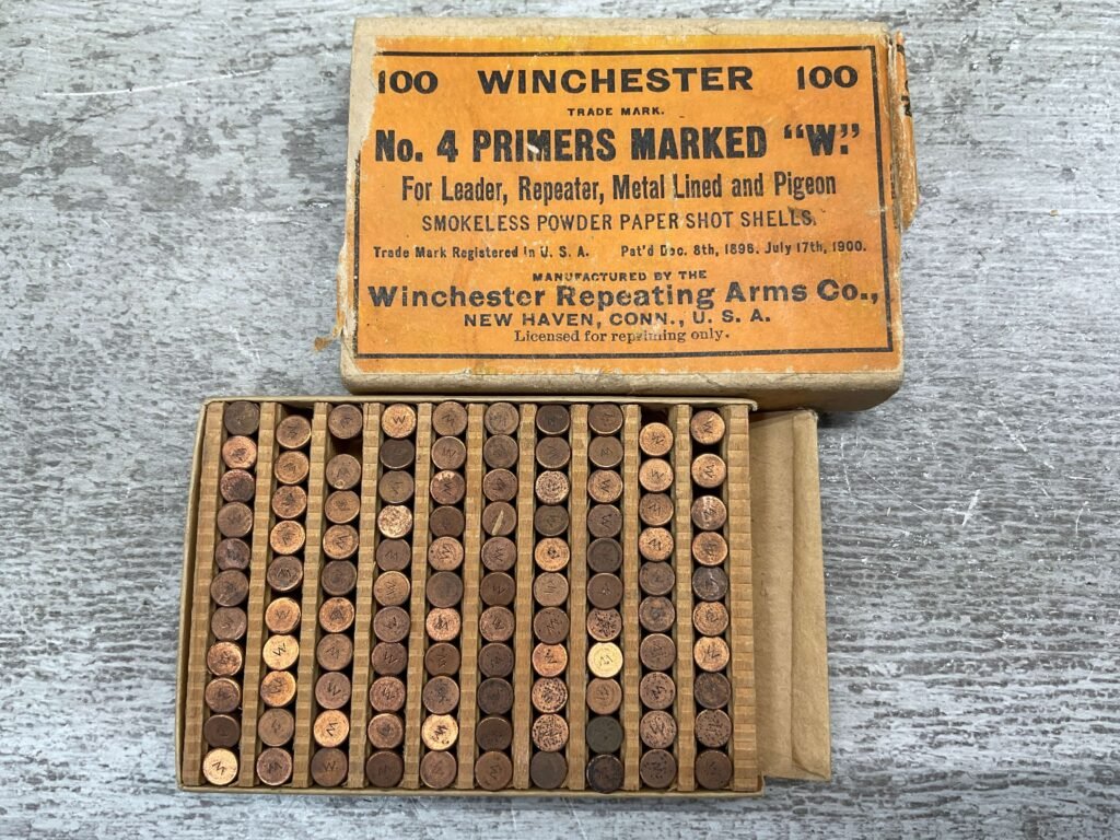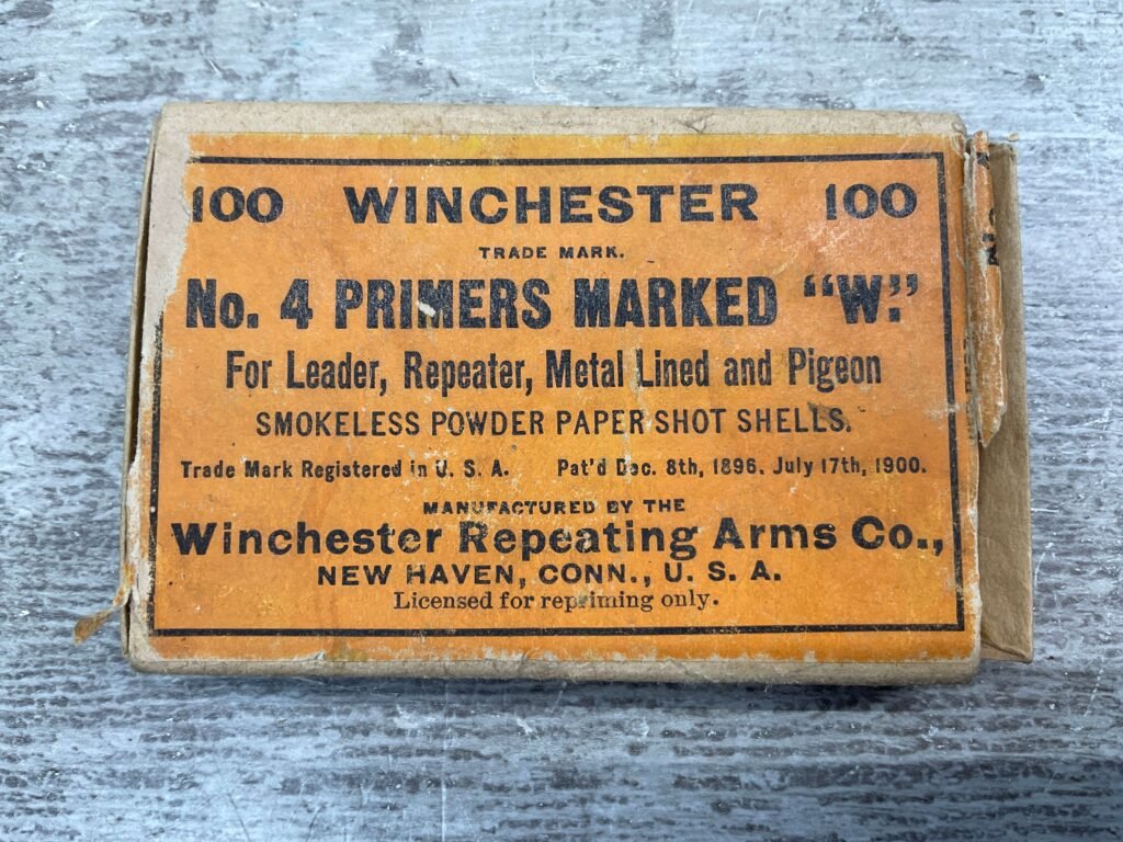 WINCHESTER 1900 NO.4 PRIMERS MARKED “W”, FULL BOX, RARE, VINTAGE, BOX IS SLIGHTLY DAMAGED, BUT FRONT IS CLEAR AND READABLE, BOX IS IN GREAT CONDITION FOR AGE