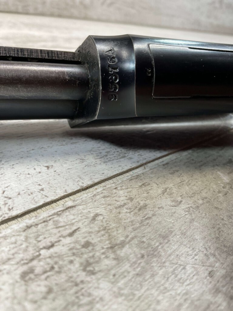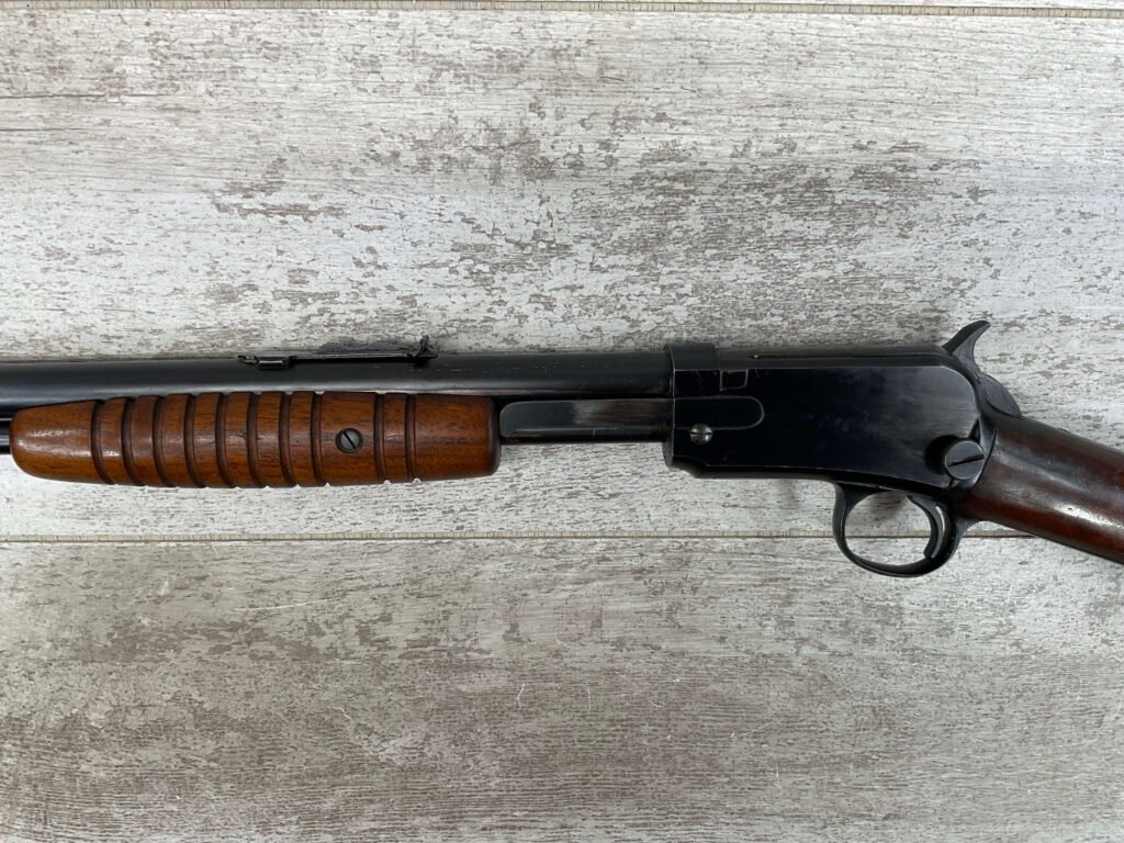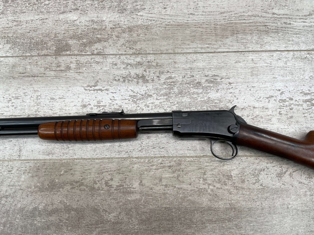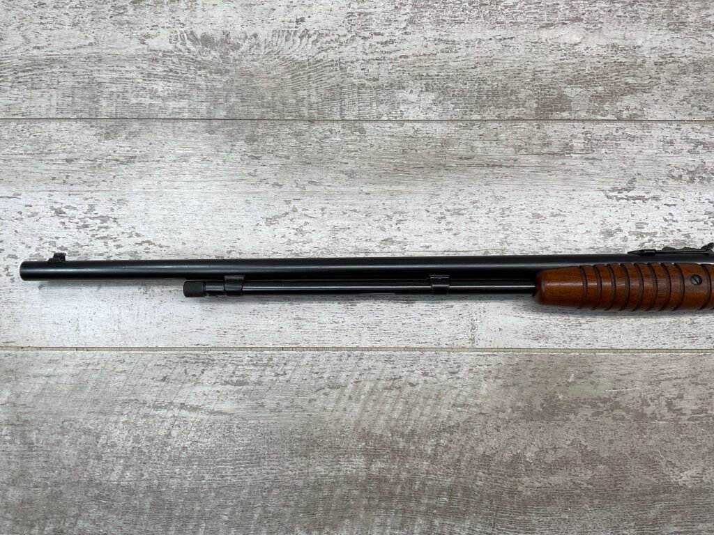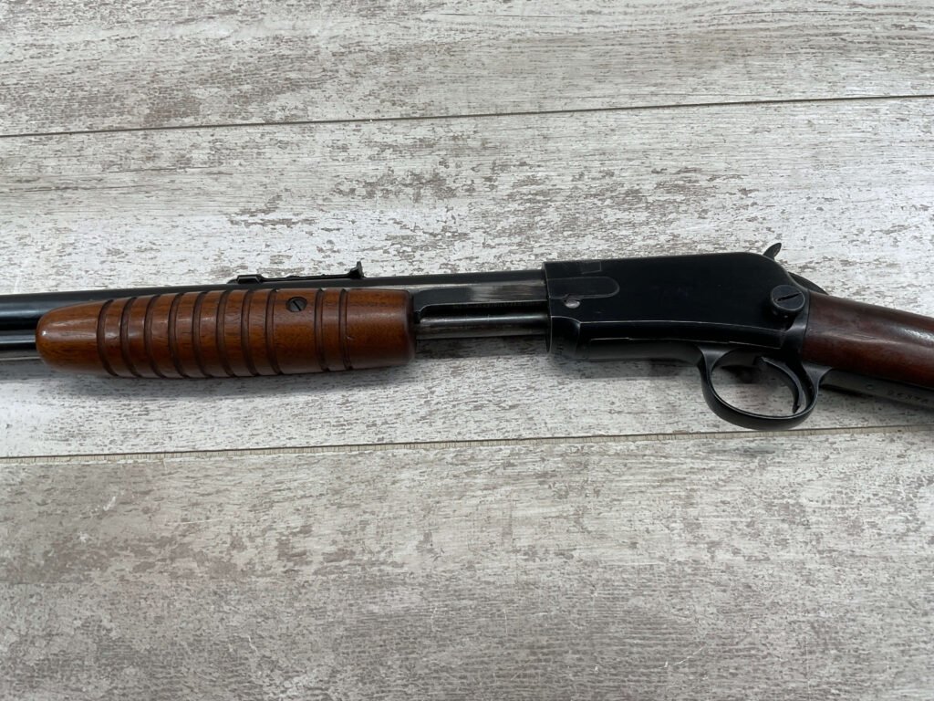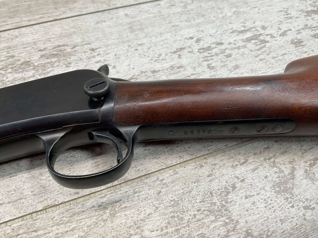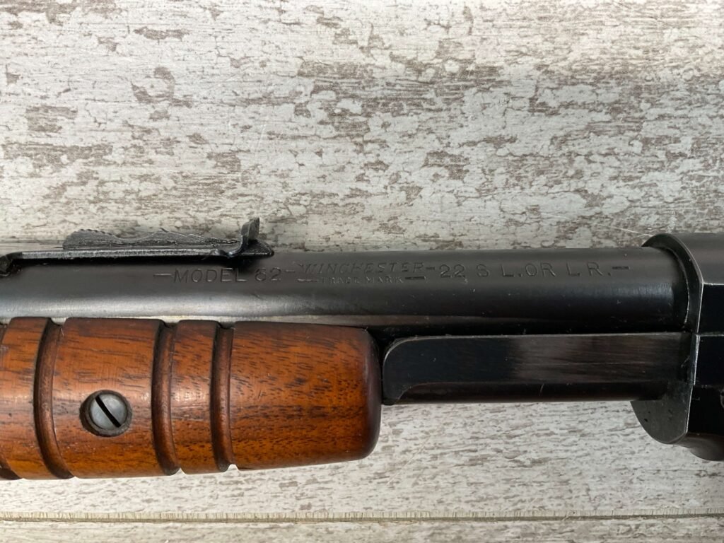 WINCHESTER MODEL 62 .22 SLIDE ACTION RIFLE #95376, .22 SHORT/LONG/LONG RIFLE, 23″ ROUND BARREL, EXC BRIGHT MIRROR BORE & RIFLING (10/10), GROOVED FOREND & EXC WOOD W/NORMAL DINGS/NICKS DUE TO AGE & USE, IRON FRONT & REAR SIGHTS, EXC ORIGINAL BLUE (9.5/10), SINGLE SHOT, ORIGINAL PLASTIC BUTT PLATE, 95+% OVERALL