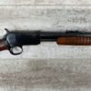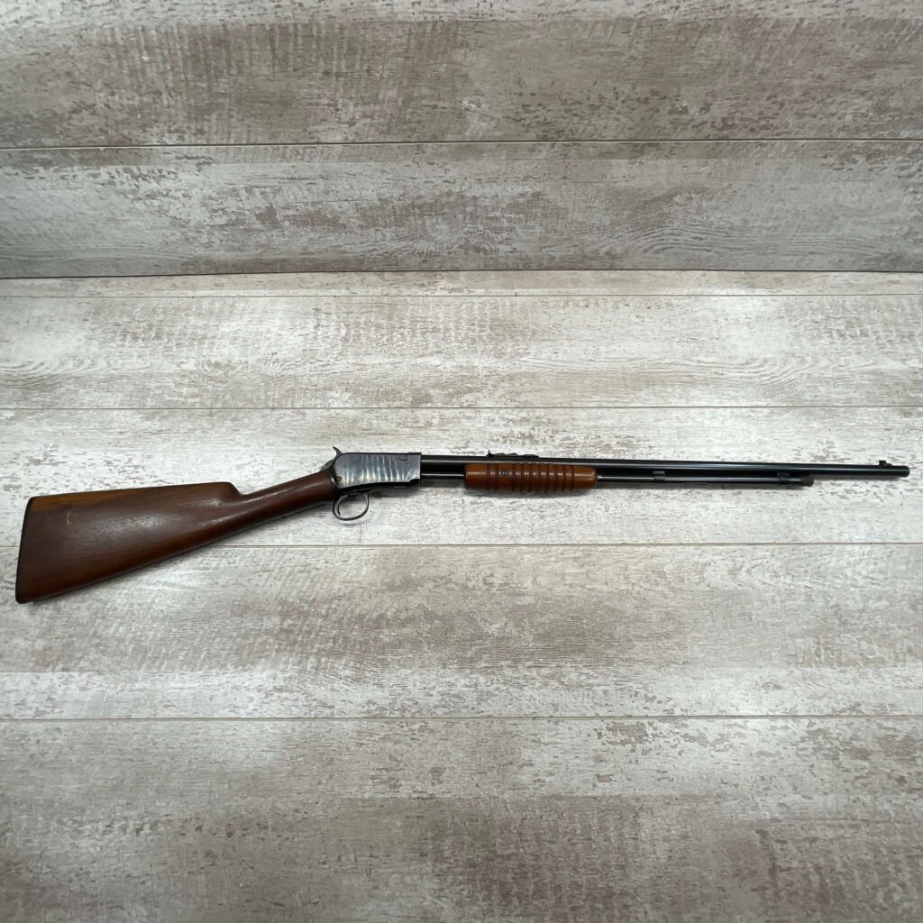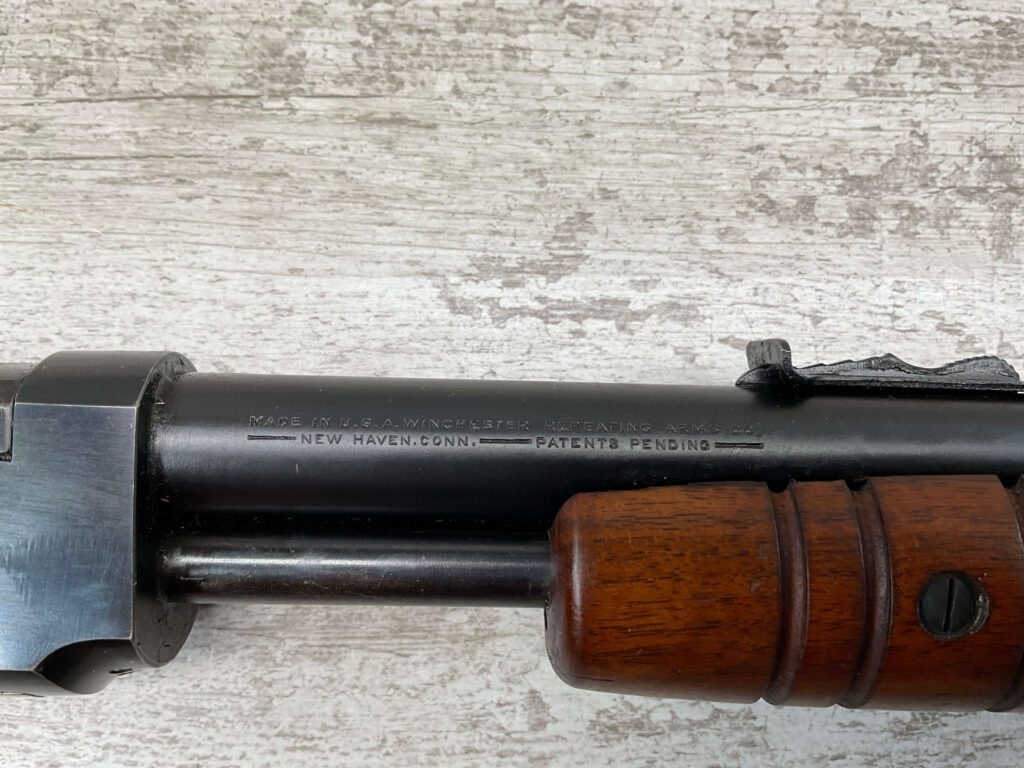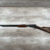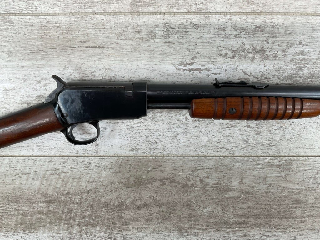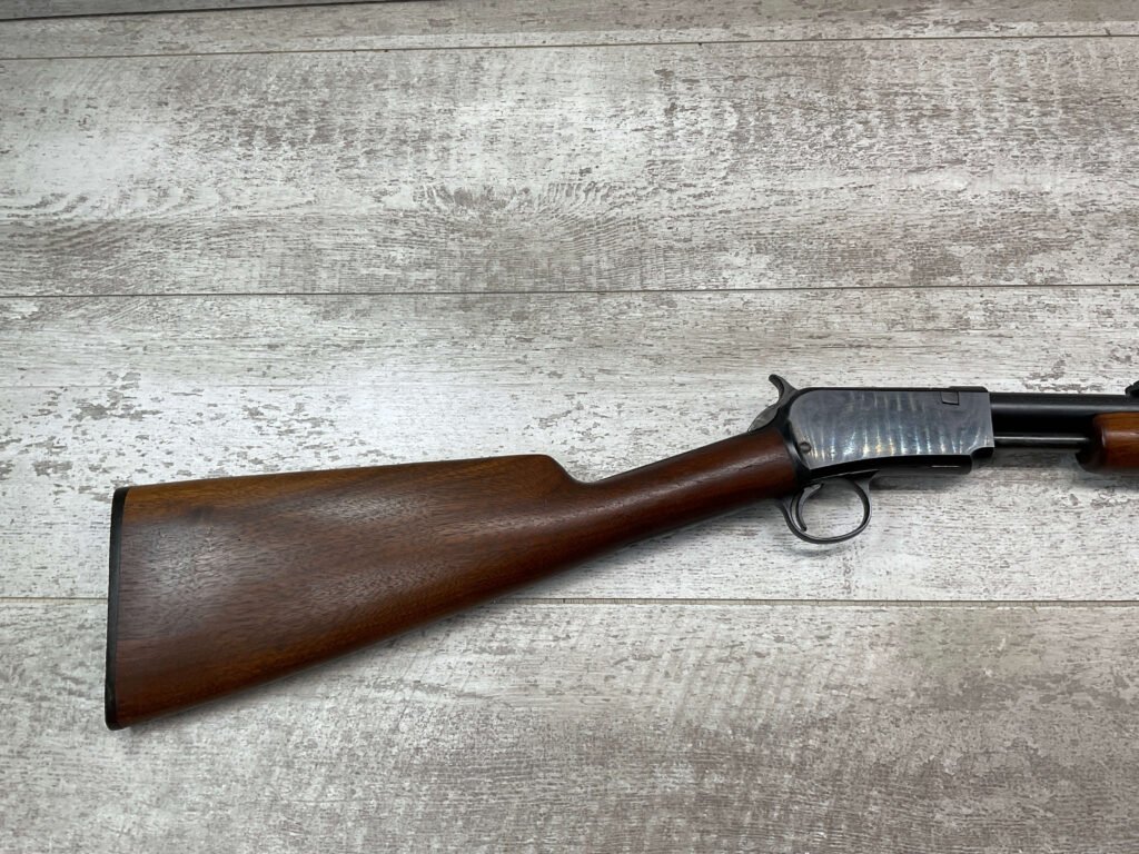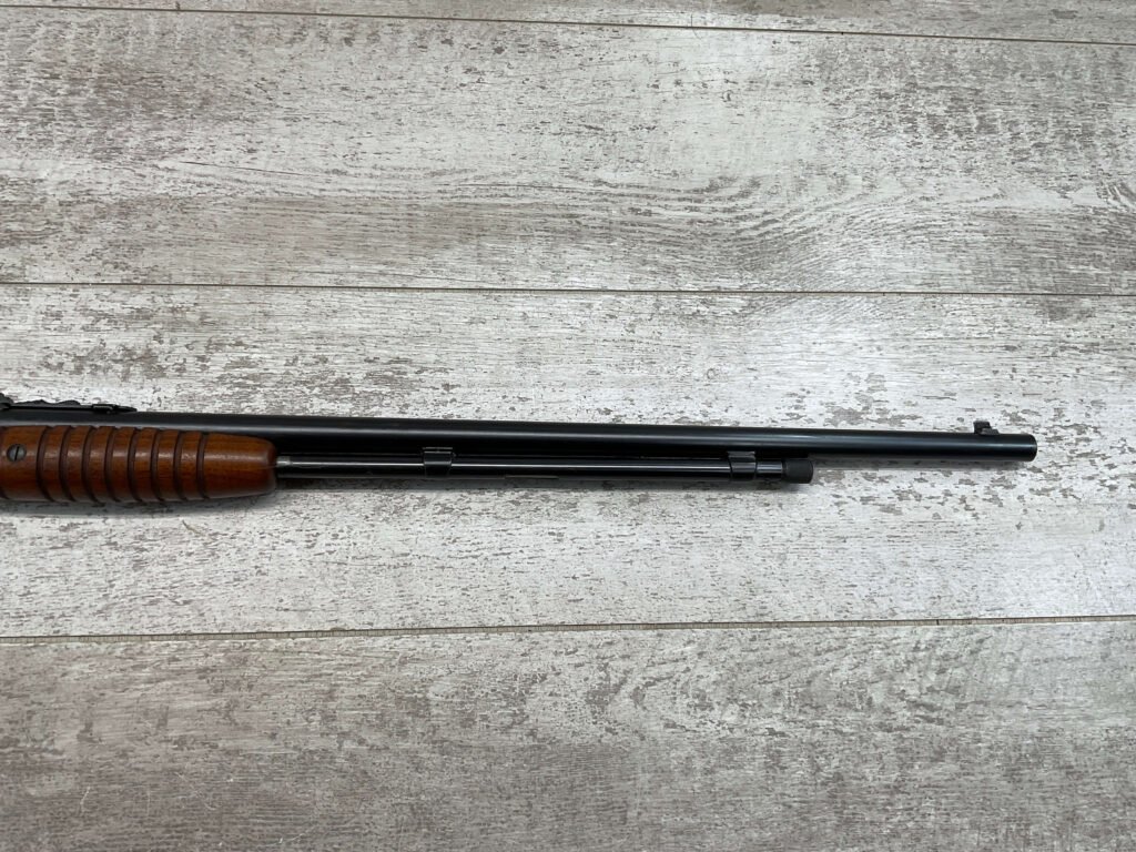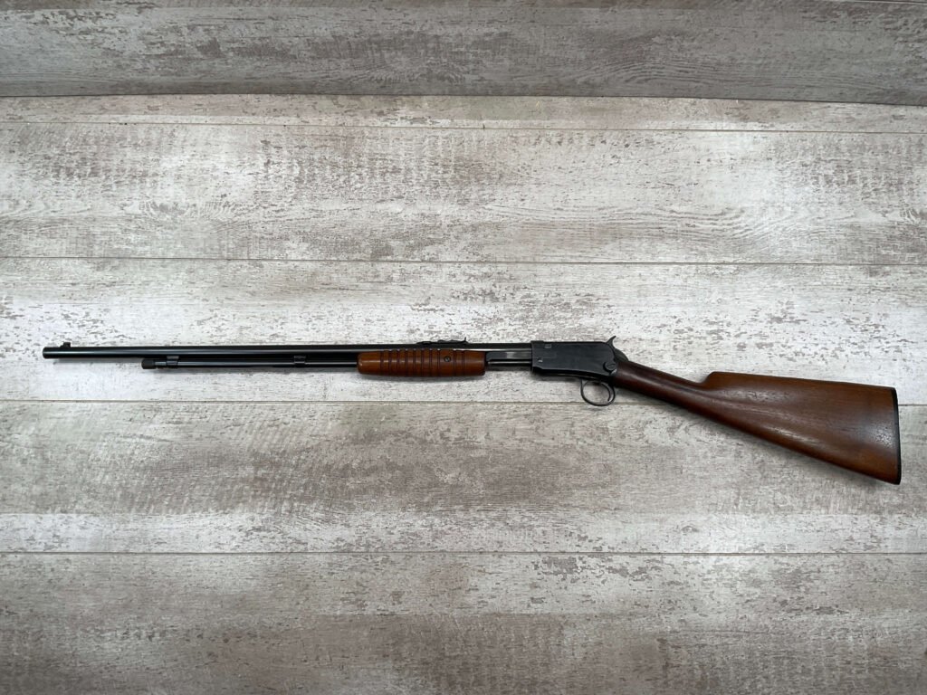 WINCHESTER MODEL 62 .22 SLIDE ACTION RIFLE #95376, .22 SHORT/LONG/LONG RIFLE, 23″ ROUND BARREL, EXC BRIGHT MIRROR BORE & RIFLING (10/10), GROOVED FOREND & EXC WOOD W/NORMAL DINGS/NICKS DUE TO AGE & USE, IRON FRONT & REAR SIGHTS, EXC ORIGINAL BLUE (9.5/10), SINGLE SHOT, ORIGINAL PLASTIC BUTT PLATE, 95+% OVERALL