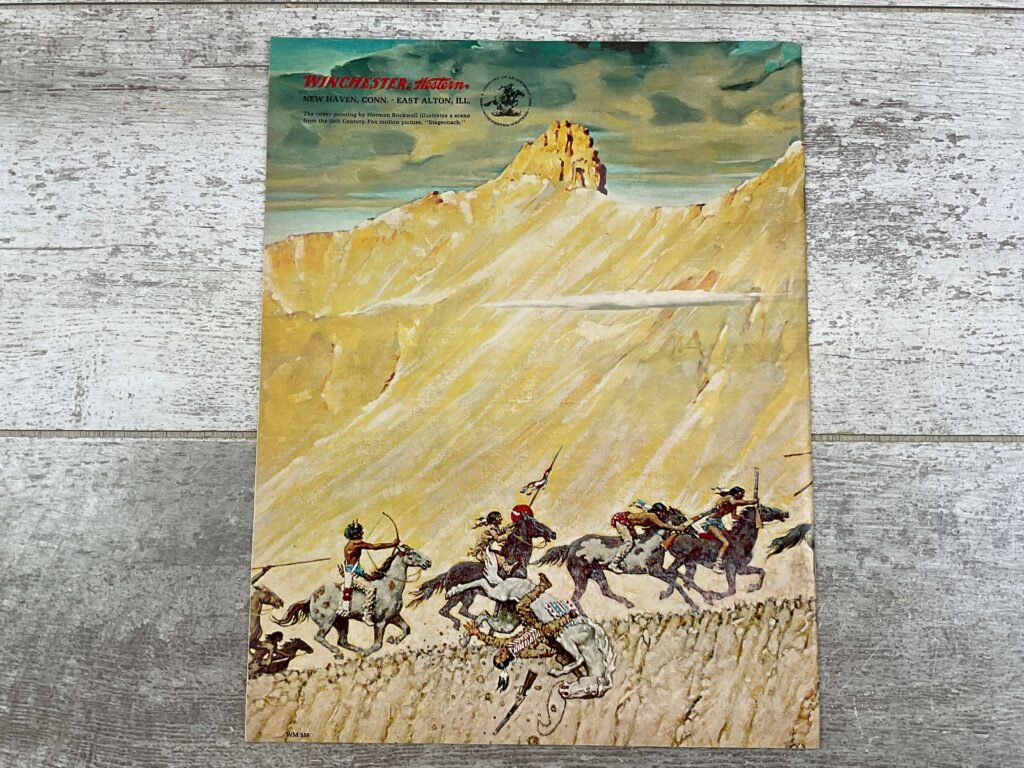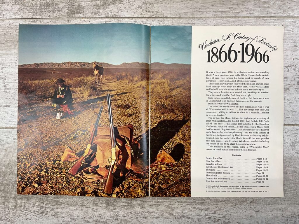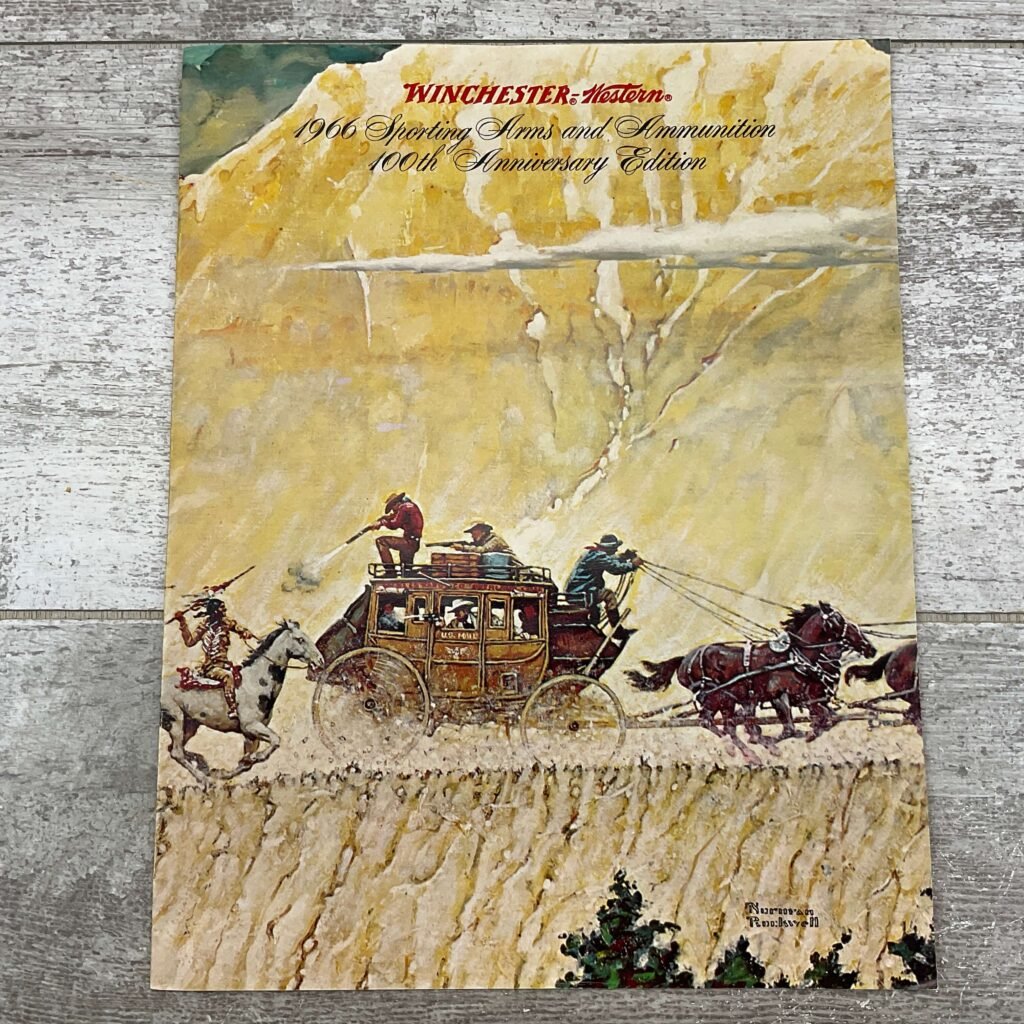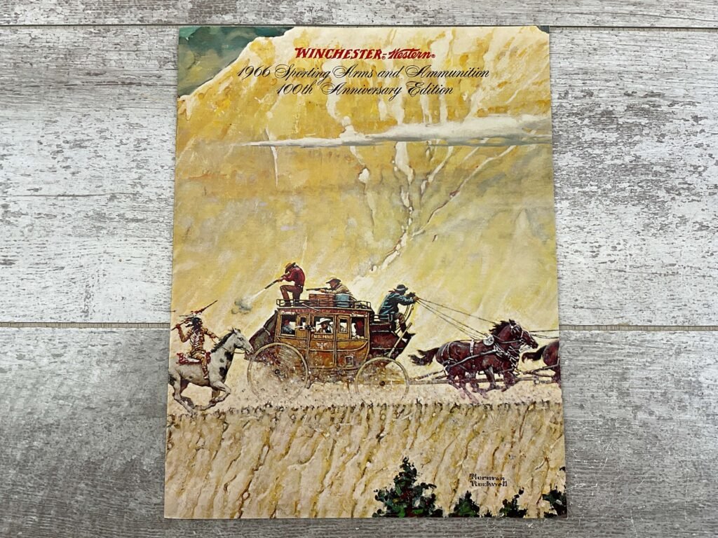 WINCHESTER WESTERN 1966 SPORTING ARMS AND AMMUNITION MAGAZINE, 1OOTH ANNIVERSARY EDITION. FEATURES COVER ART BY NORMAN ROCKWELL. BRILLIANT ORIGINAL COLORS WITHOUT FADING, WATER DAMAGE OR TEARS. MAGAZINES ARE IN PRISTINE CONDITION.