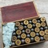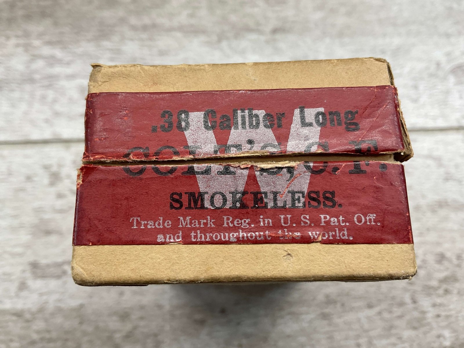 WINCHESTER 38 CAL LONG CENTER FIRE AMMUNITION, COVER FEATURES CARTRIDGE WITH “38 LONG COLT DA” PRINTED ON IT, PARTIAL BOX 38 RNDS, TWO PIECE BOX IN VG CONDITION, LIGHT EDGE WEAR, OBSOLETE ANTIQUE PARTIAL BOX OF AMMUNITION