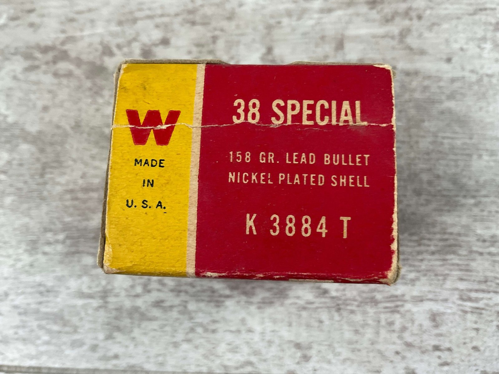 WINCHESTER 38 SPECIAL 158GRAIN VINTAGE AMMO, 5O/BOX, STAYNLESS, NON-MERCURIC, OIL PROOF, MADE IN USA, NICKEL PLATED SHELL, MODEL K 3884 T