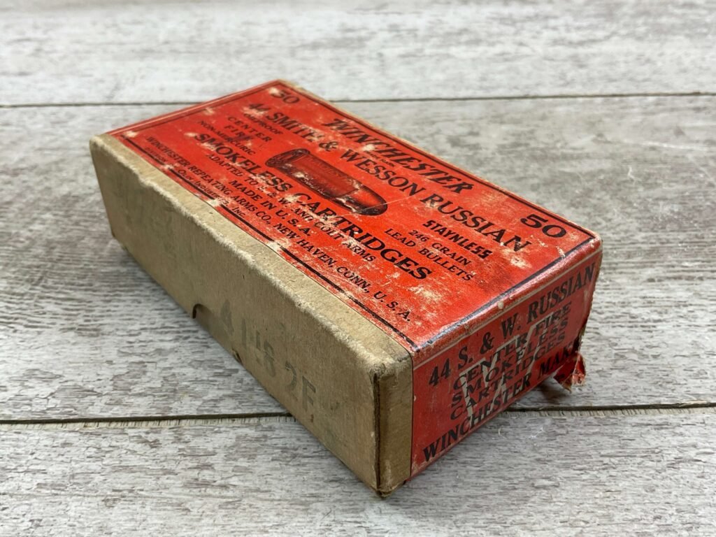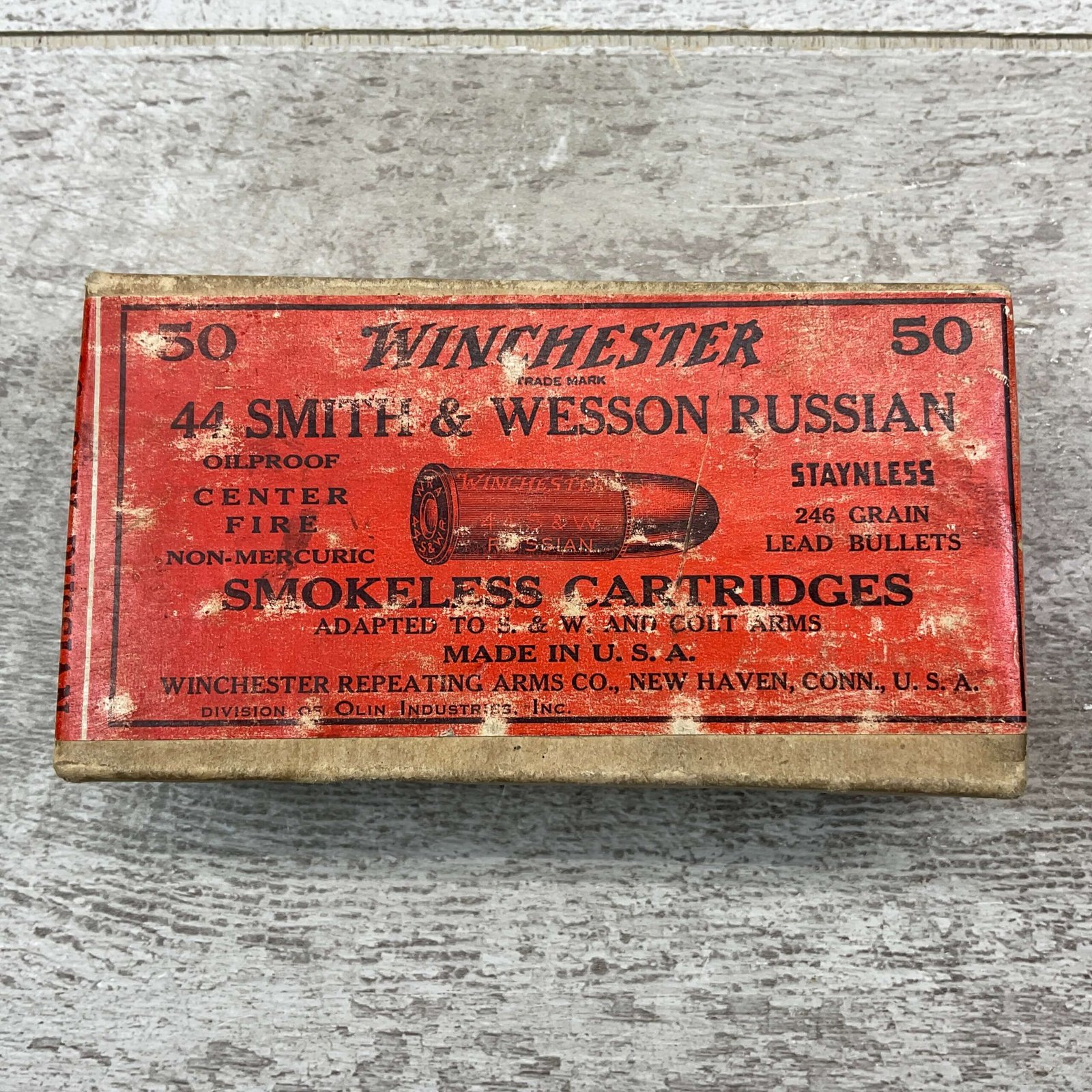 WINCHESTER 44 SMITH & WESSON RUSSIAN 246GR SMOKELESS AMMO UNOPENED BOX OF 50, FULL BOX, THE BOX IS STILL PAPER SEALED, VG-EXC CONDITION, RARE AND HIGHLY COLLECTIBLE!