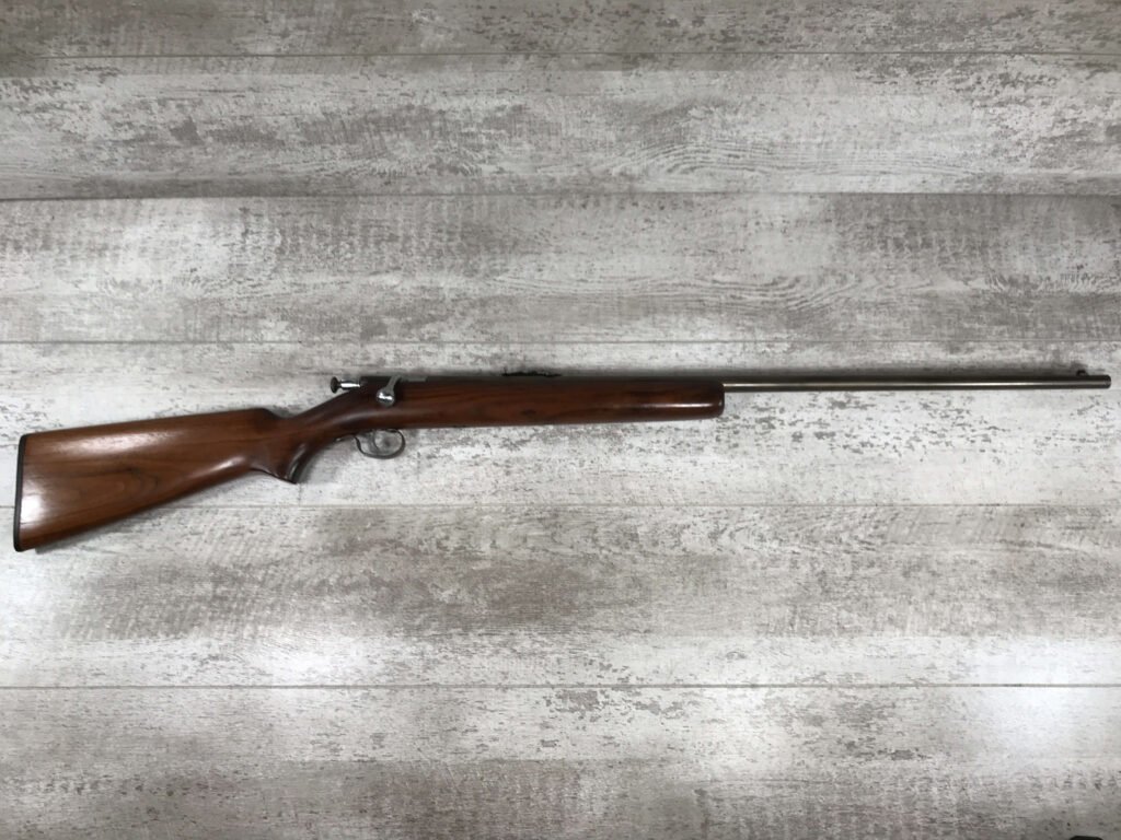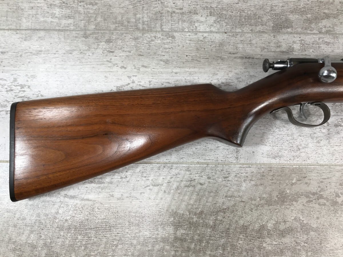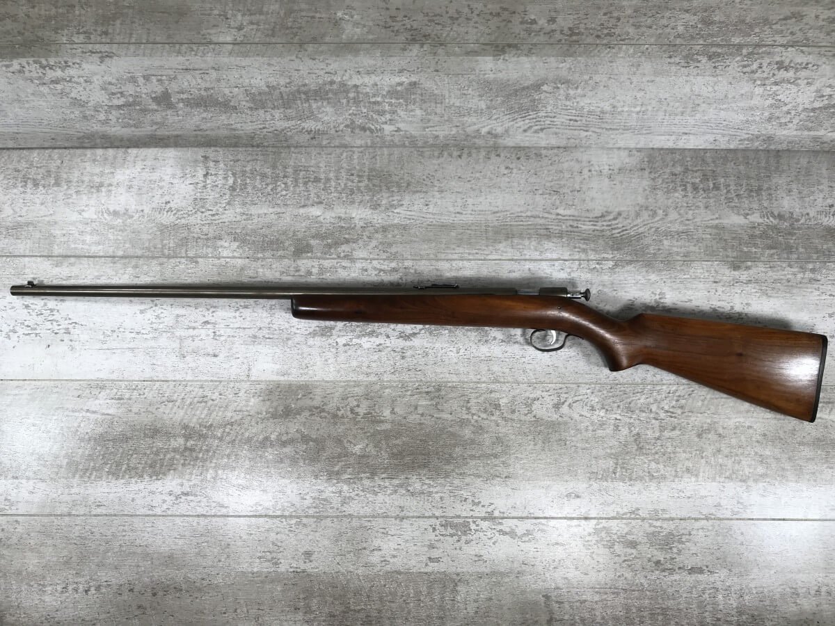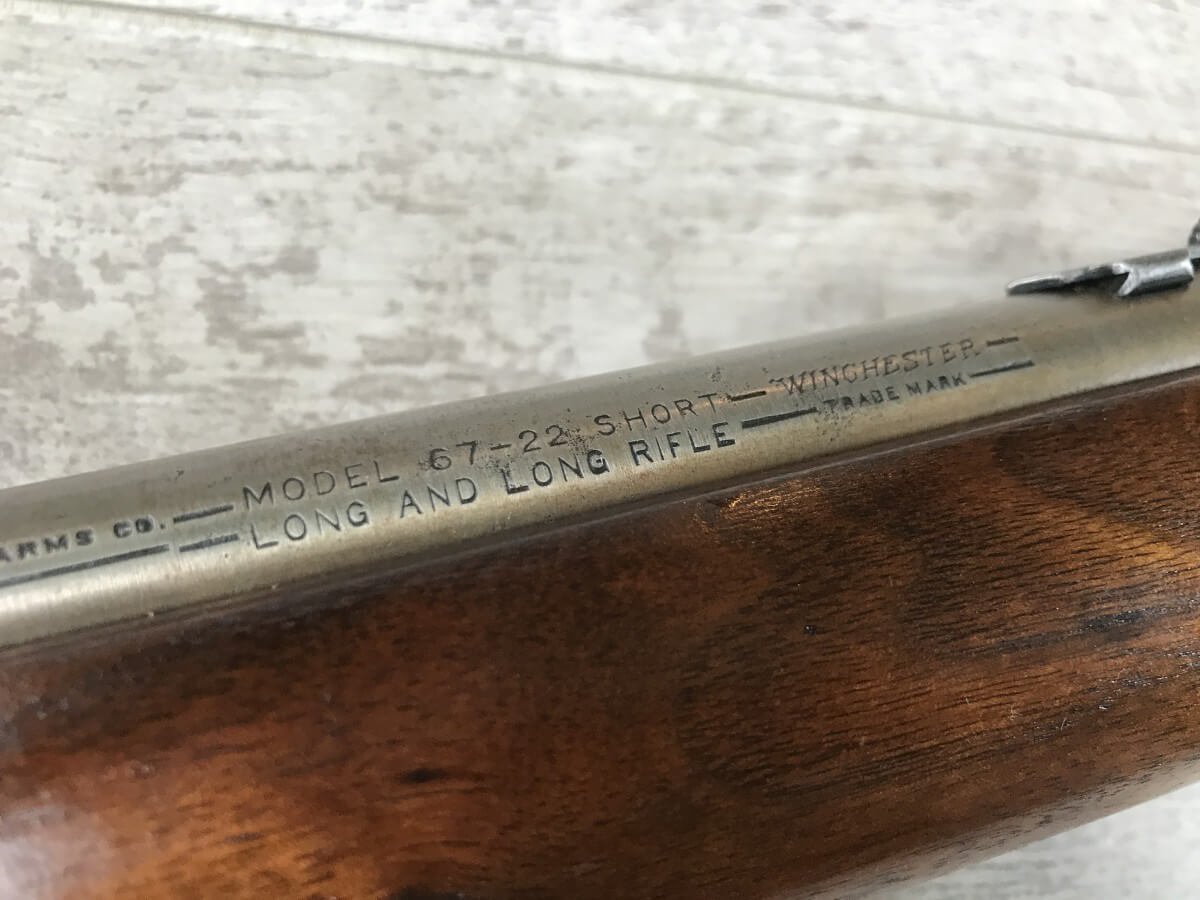 WINCHESTER 67 .22 SHORT/LONG OR LR BOLT ACTION SINGLE SHOT RIFLE #NSN, SINGLE SHOT, EXC WOOD W/PLASTIC BUTT PLATE, BLUE HAS TURNED TO A “STRAW” PATINA, BRIGHT BORE W/VG RIFLING, GREAT LITTLE SHOOTER!! 80%