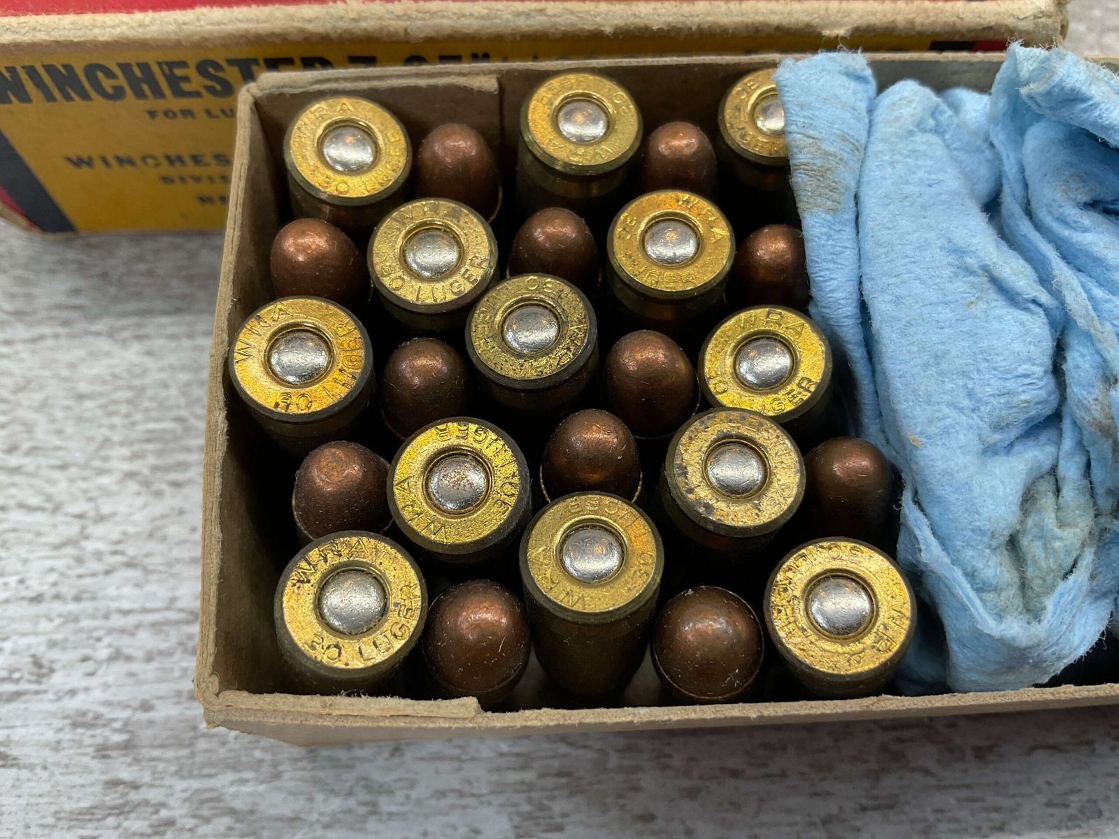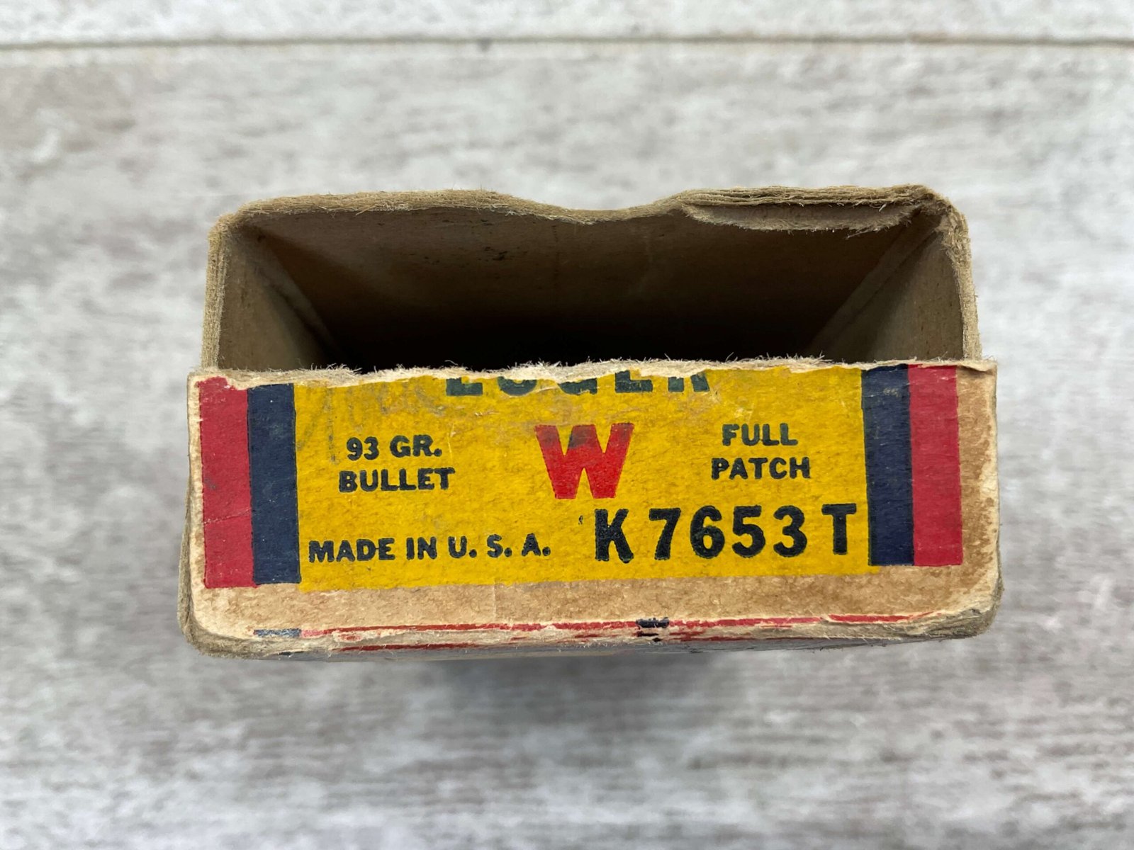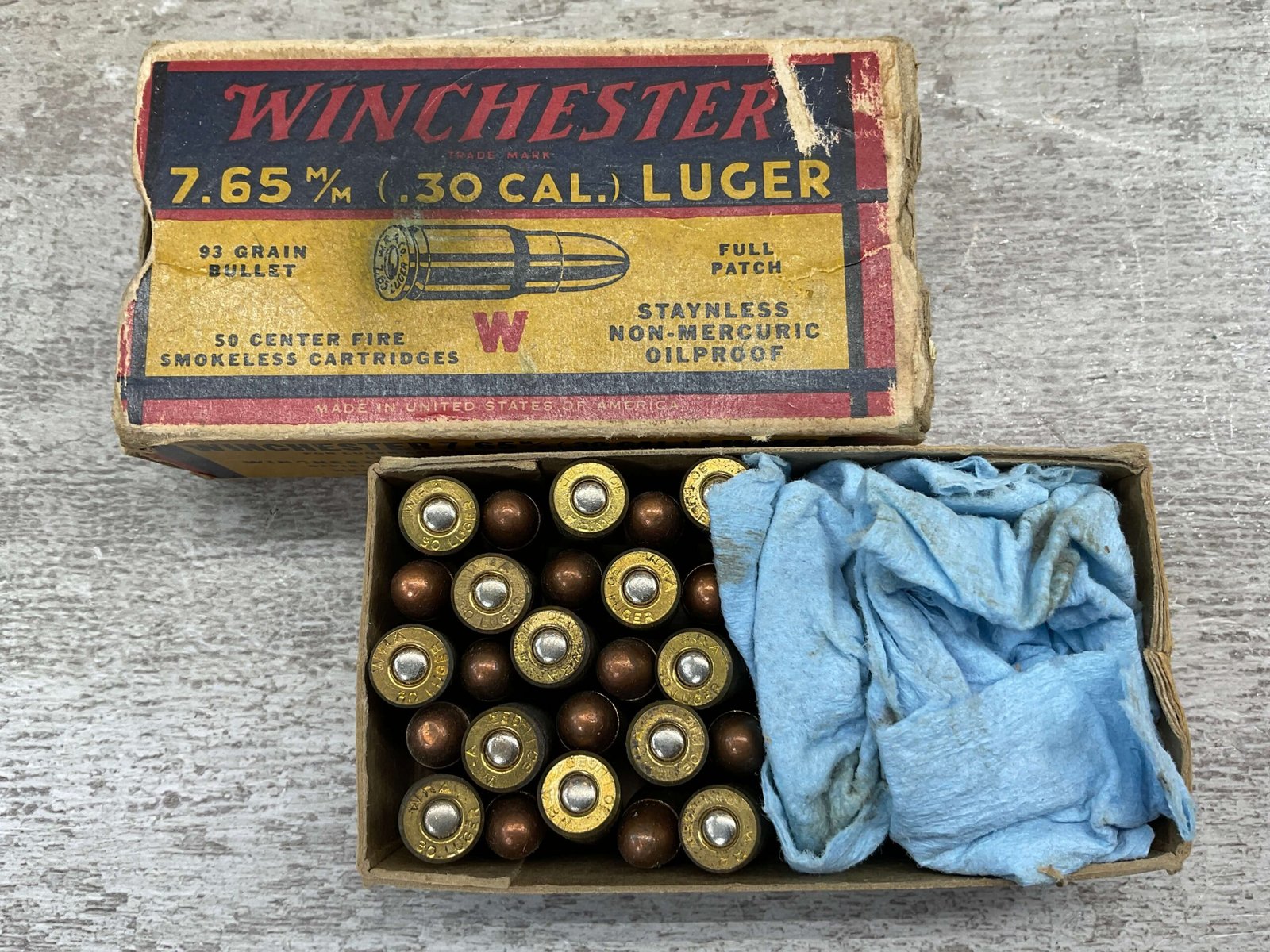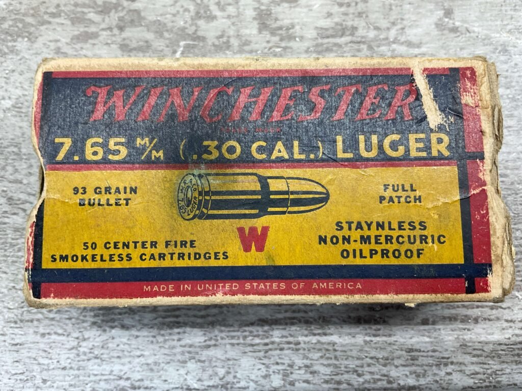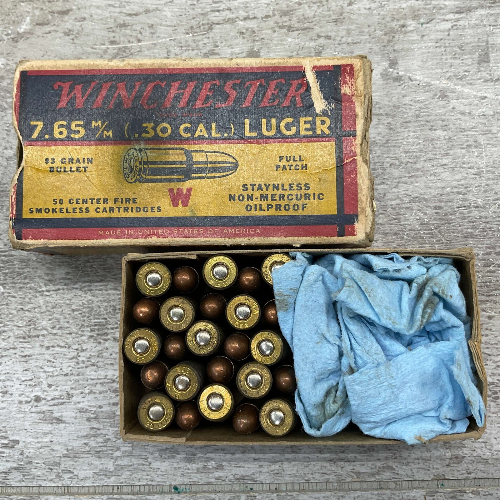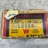 WINCHESTER 7.65mm (.30 LUGER) 93 GR BRASS CASE, 25/BOX VINTAGE, 25 FULL CARTRIDGES, GOOD VINTAGE BOX