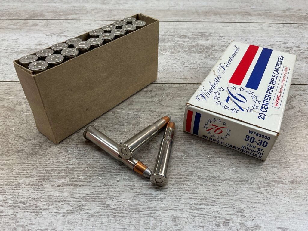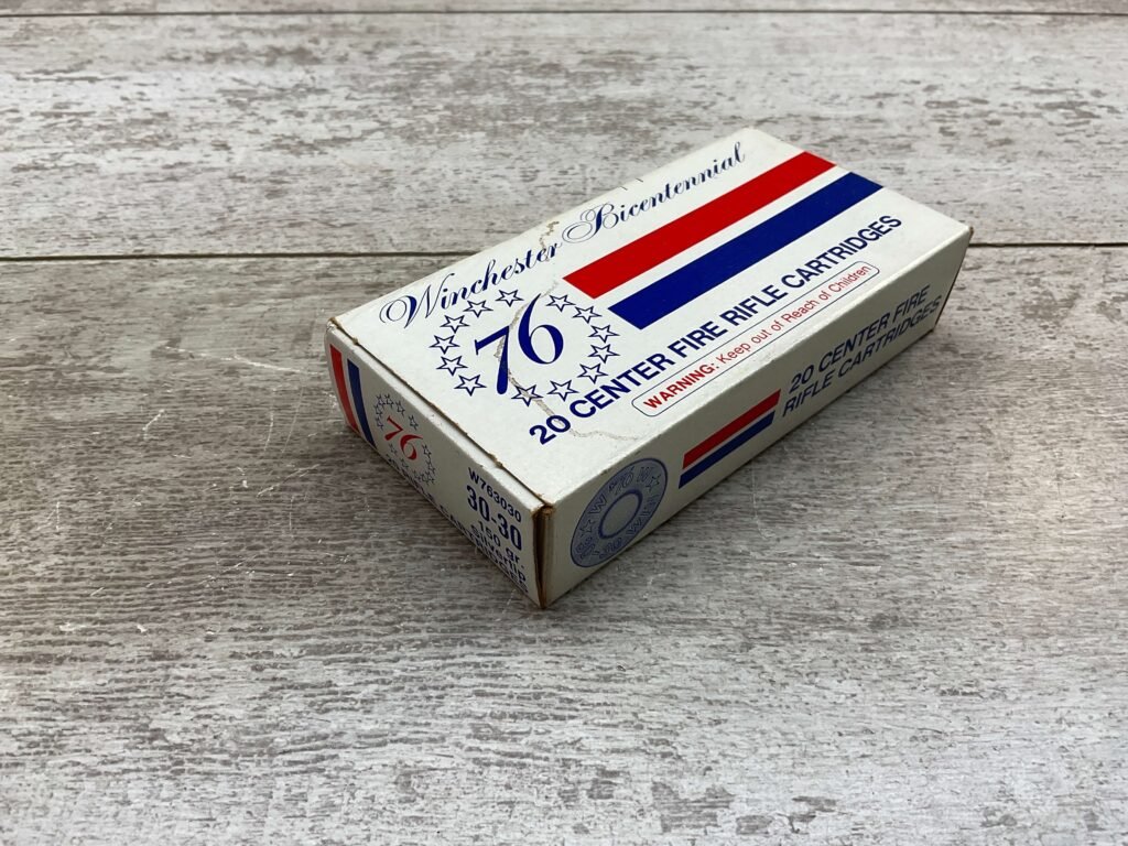 WINCHESTER BICENTENNIAL 30-30 WIN. 150GR. SILVERTIP AMMO, BOX HAS SHARP EDGES & TIGHT FOLDS, LIGHT DISCOLORATION ON THE BOX FACE, QTY 20, FULL BOX