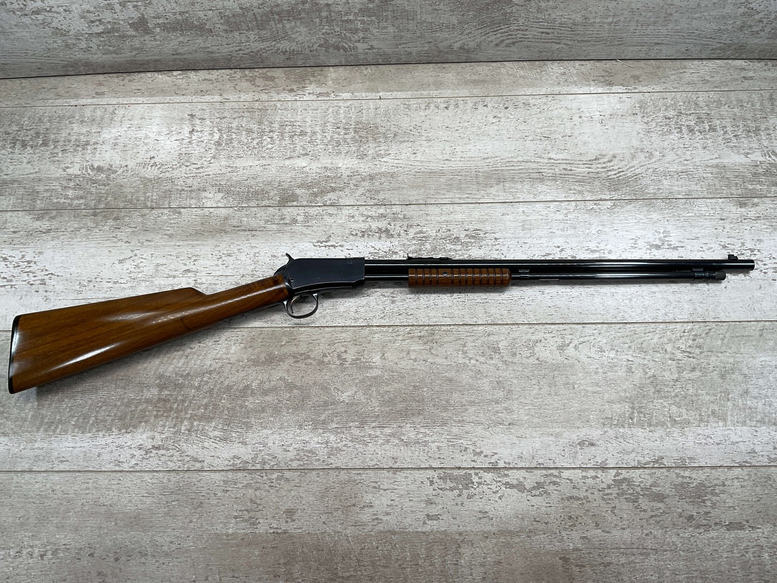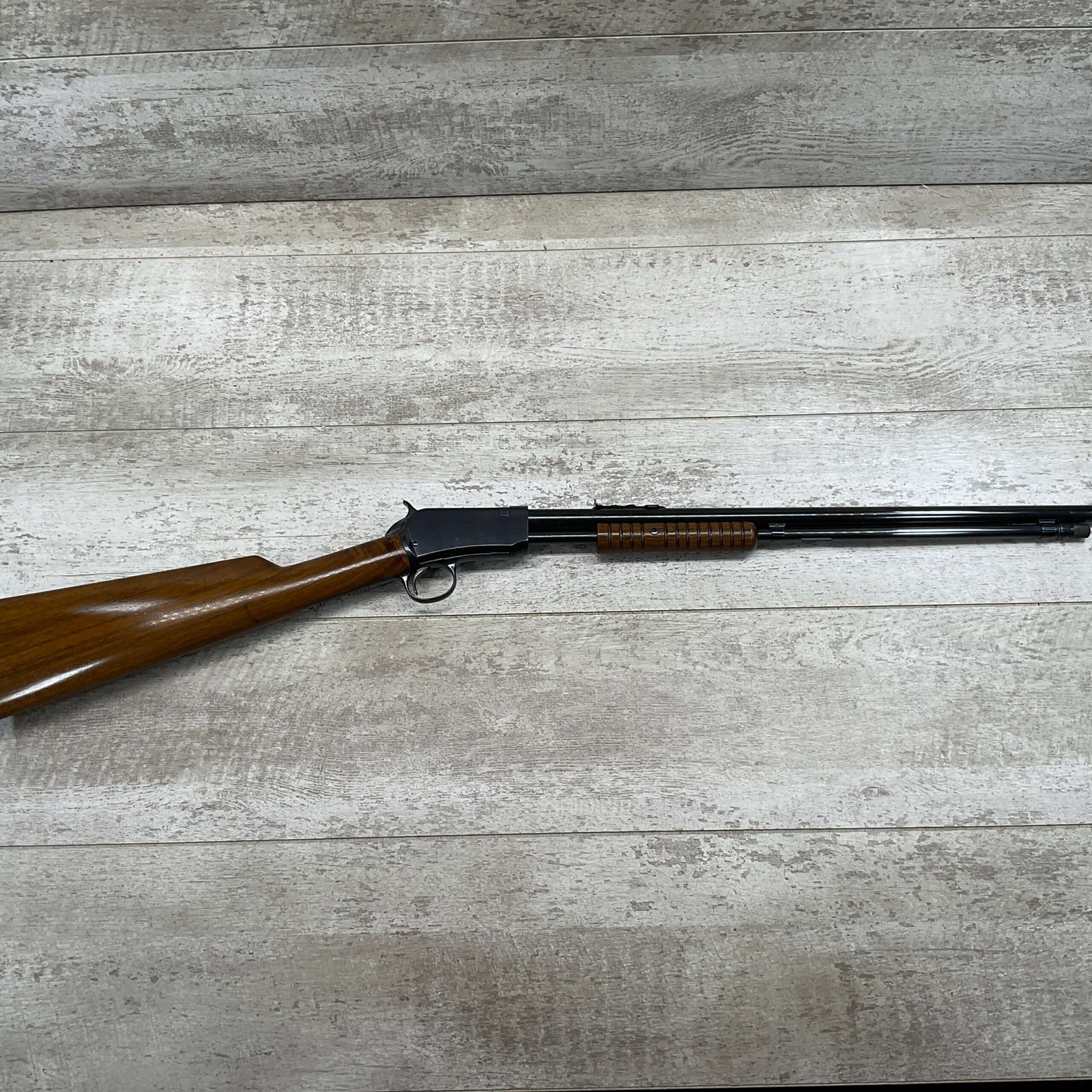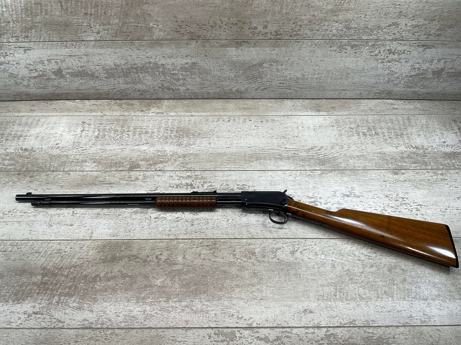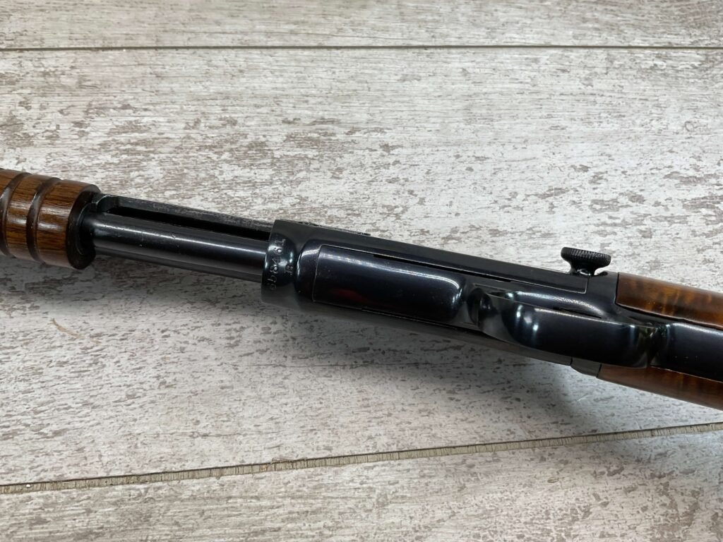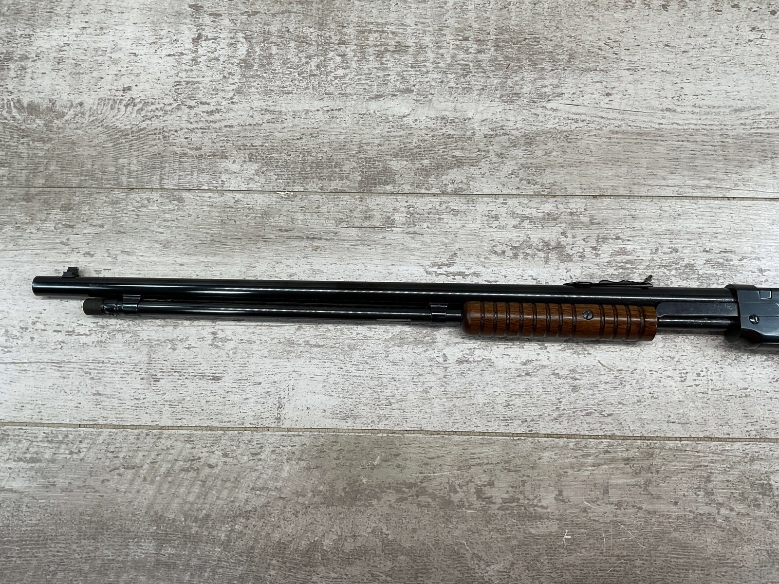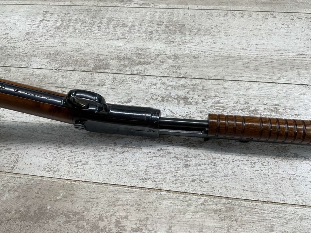 WINCHESTER MODEL 1906 .22 S/L/LR SLIDE ACTION RIFLE #658461, TAKEDOWN, 1923 MFR, 20″ ROUND BARREL, EXC MIRROR BORE & RIFLING (BARREL RELINED BY HOLMES), EXC MINTY STOCK W/NO HANDLING MARKS, ORIGINAL PLASTIC BUTT PLATE, ALL WORK PROFESSIONALLY COMPLETED BY BOB & DICK HOLMES, MINTY CONDITION