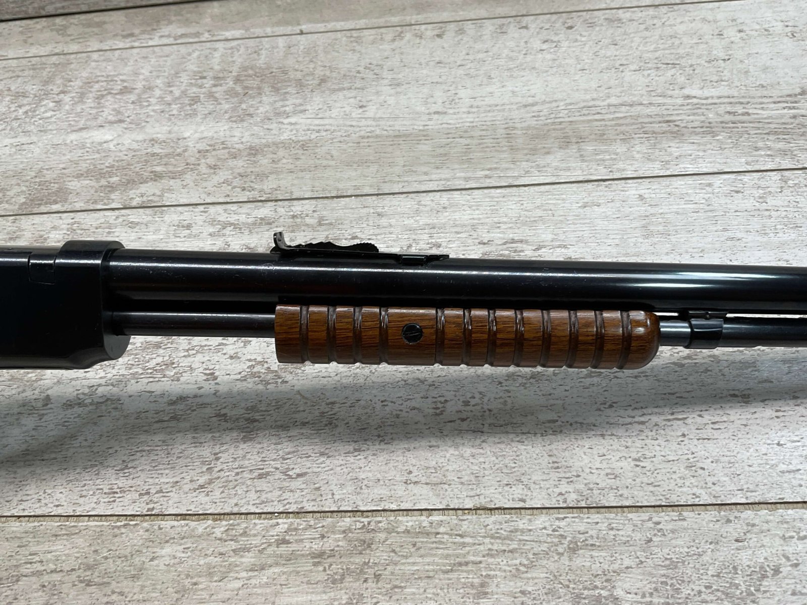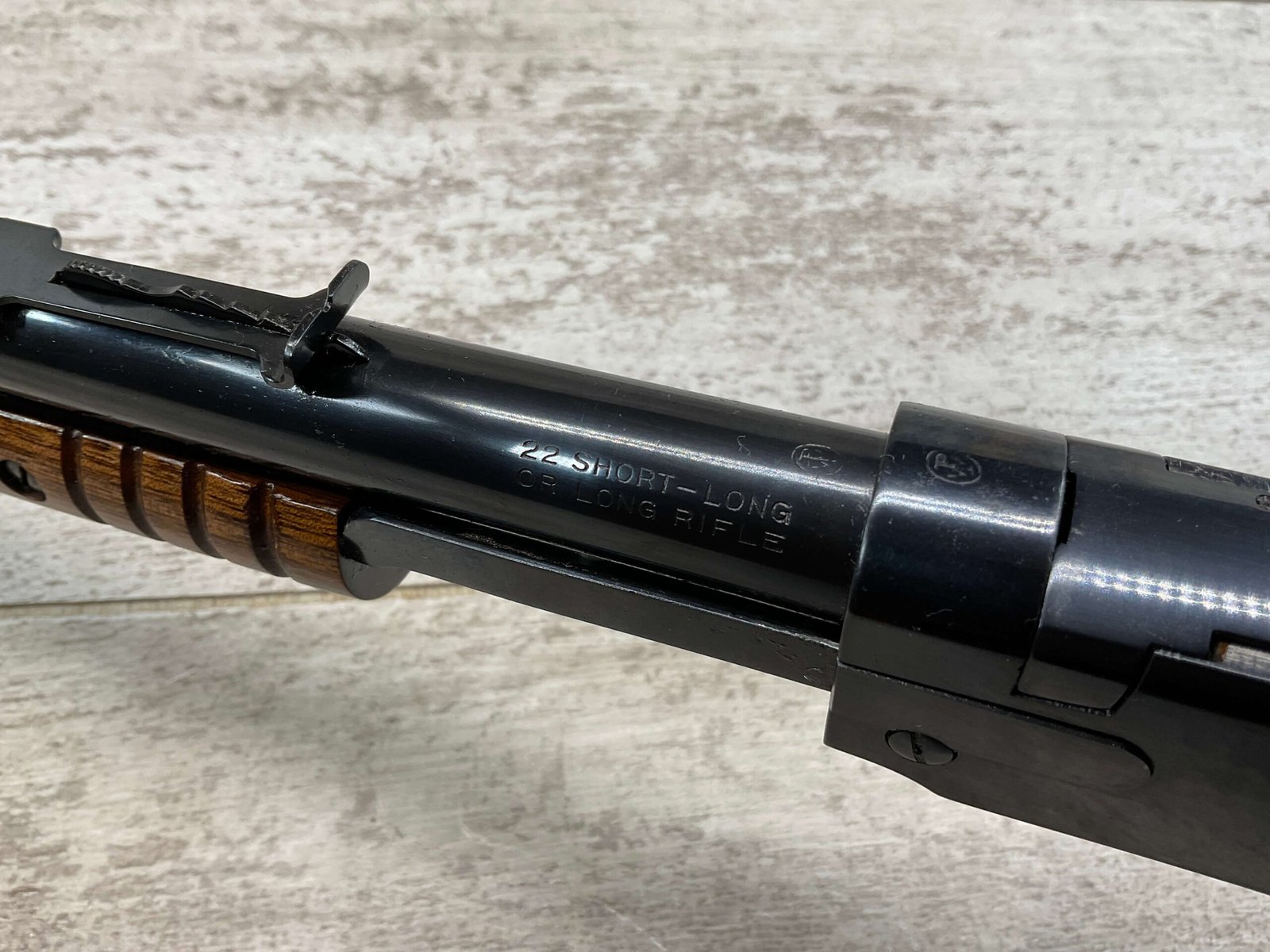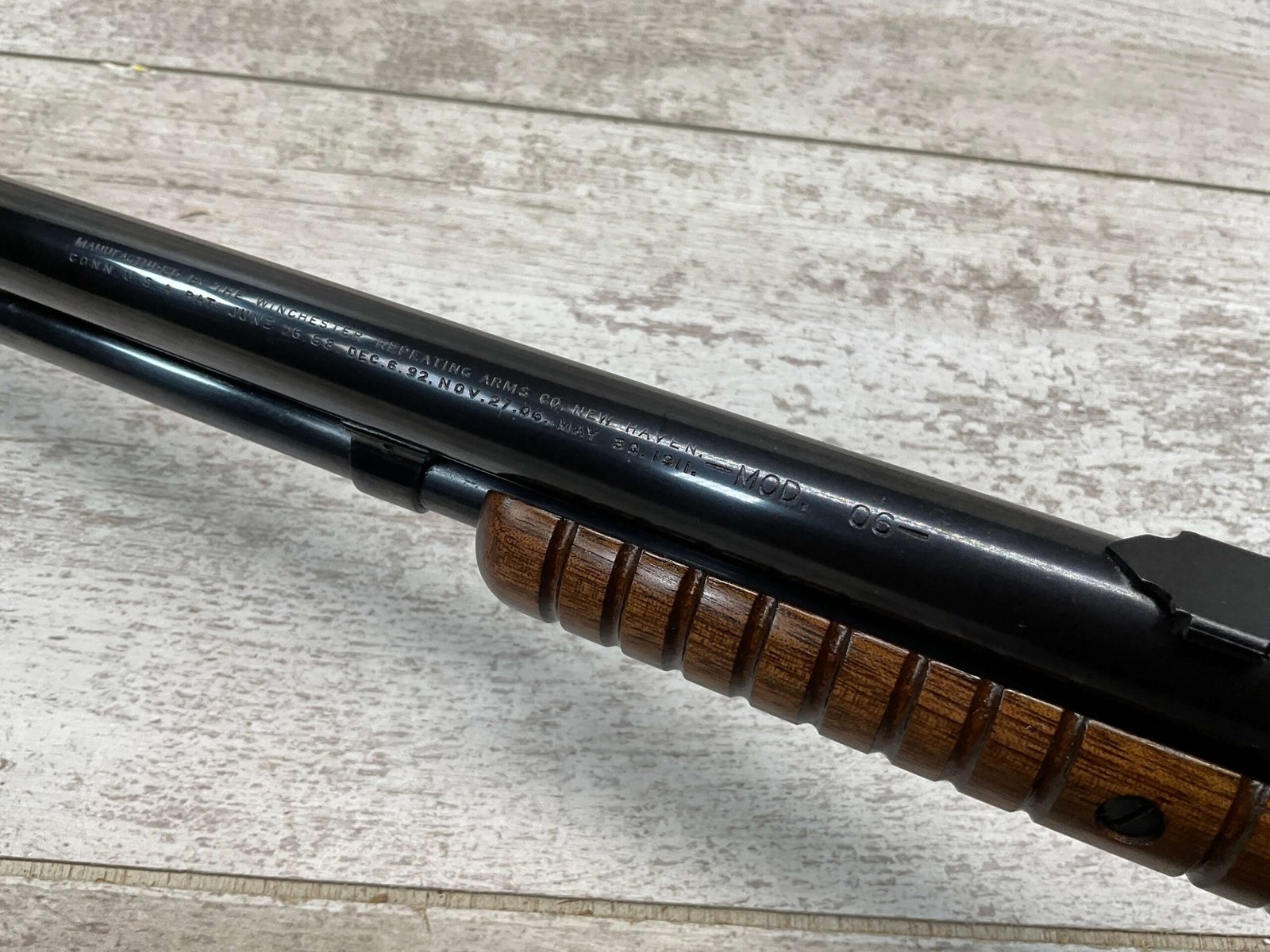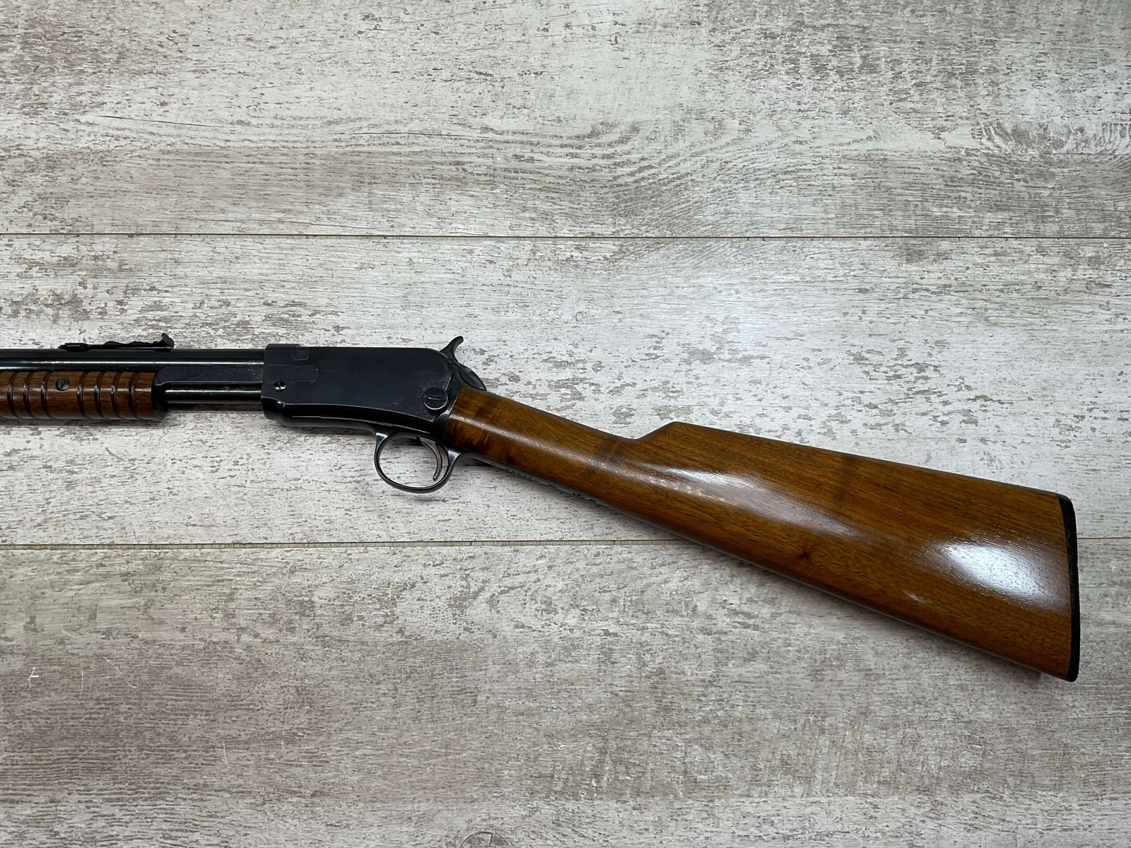 WINCHESTER MODEL 1906 .22 S/L/LR SLIDE ACTION RIFLE #658461, TAKEDOWN, 1923 MFR, 20″ ROUND BARREL, EXC MIRROR BORE & RIFLING (BARREL RELINED BY HOLMES), EXC MINTY STOCK W/NO HANDLING MARKS, ORIGINAL PLASTIC BUTT PLATE, ALL WORK PROFESSIONALLY COMPLETED BY BOB & DICK HOLMES, MINTY CONDITION