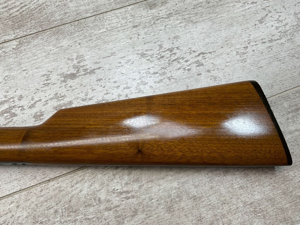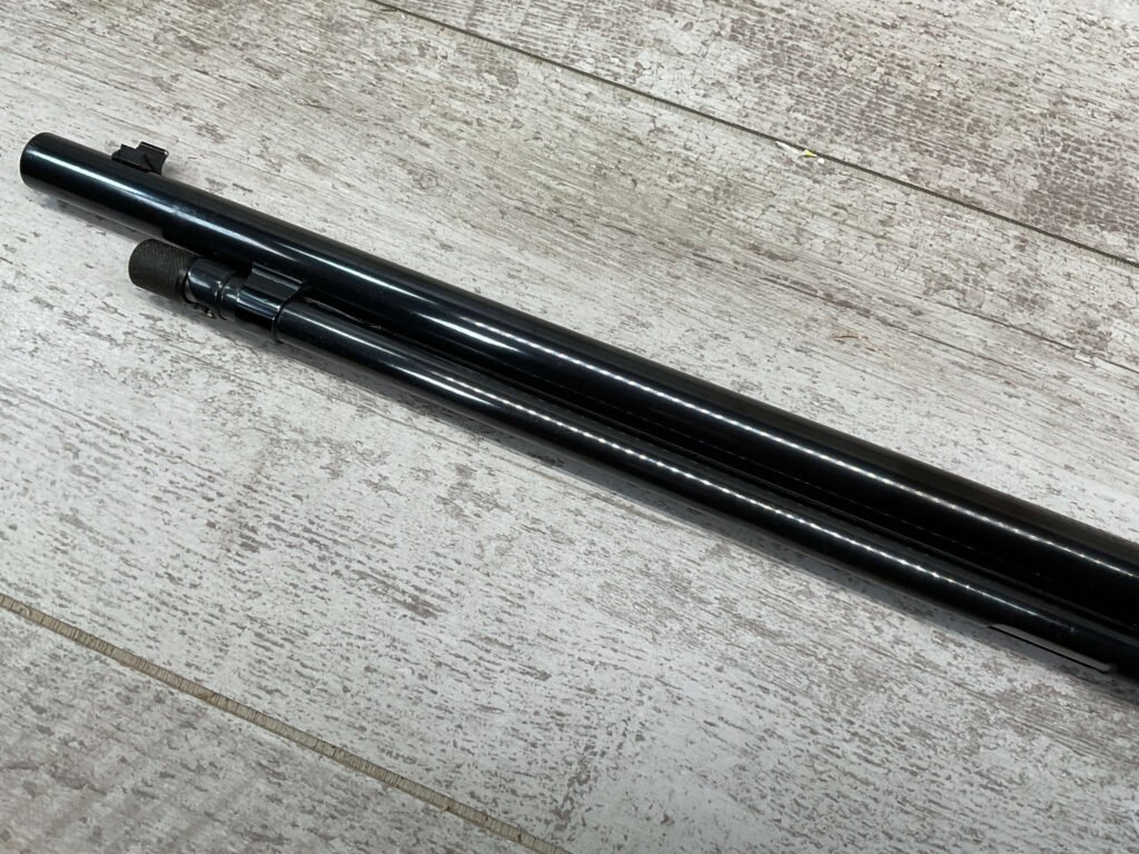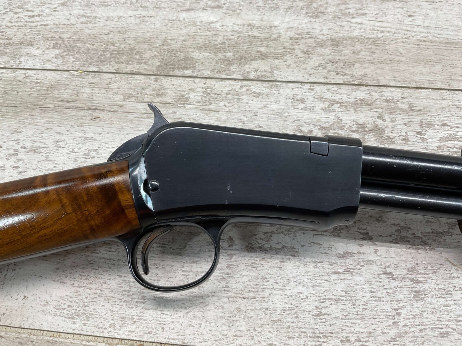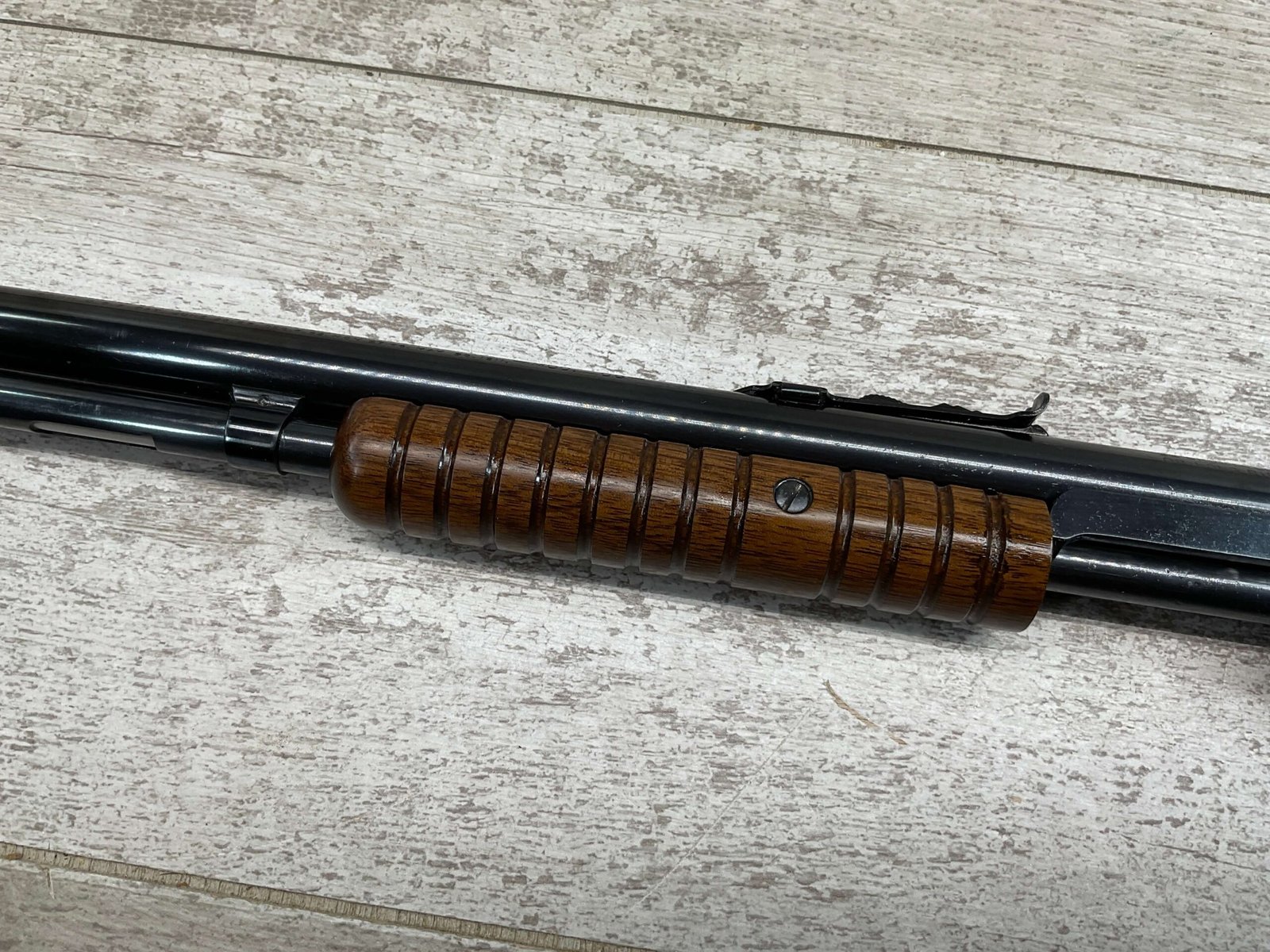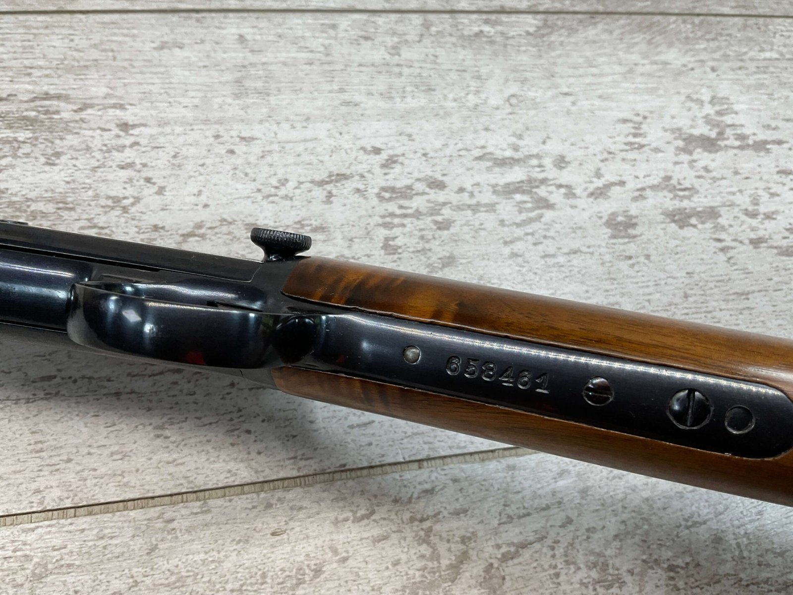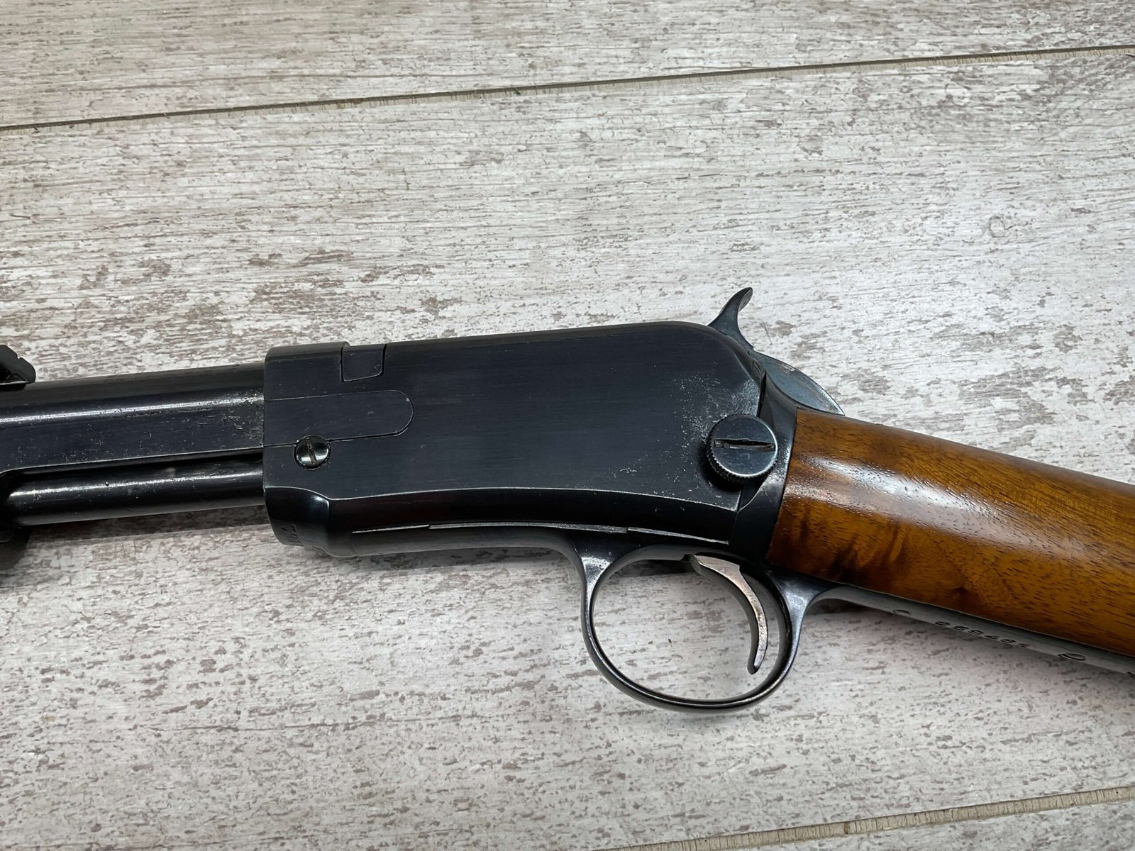 WINCHESTER MODEL 1906 .22 S/L/LR SLIDE ACTION RIFLE #658461, TAKEDOWN, 1923 MFR, 20″ ROUND BARREL, EXC MIRROR BORE & RIFLING (BARREL RELINED BY HOLMES), EXC MINTY STOCK W/NO HANDLING MARKS, ORIGINAL PLASTIC BUTT PLATE, ALL WORK PROFESSIONALLY COMPLETED BY BOB & DICK HOLMES, MINTY CONDITION