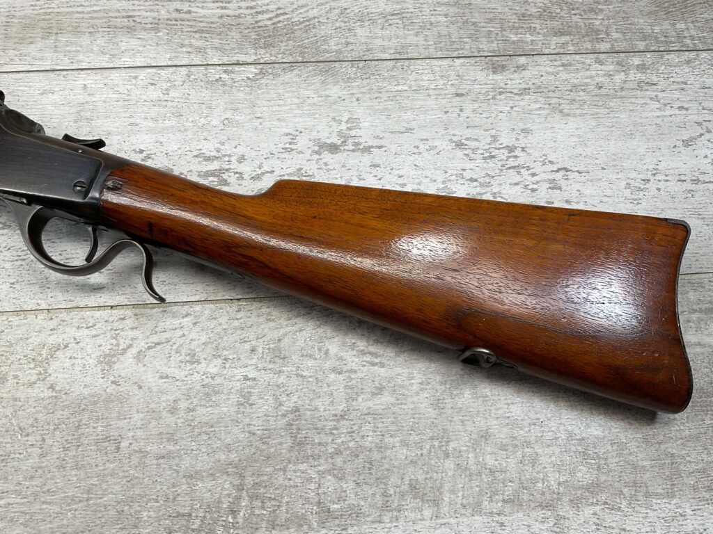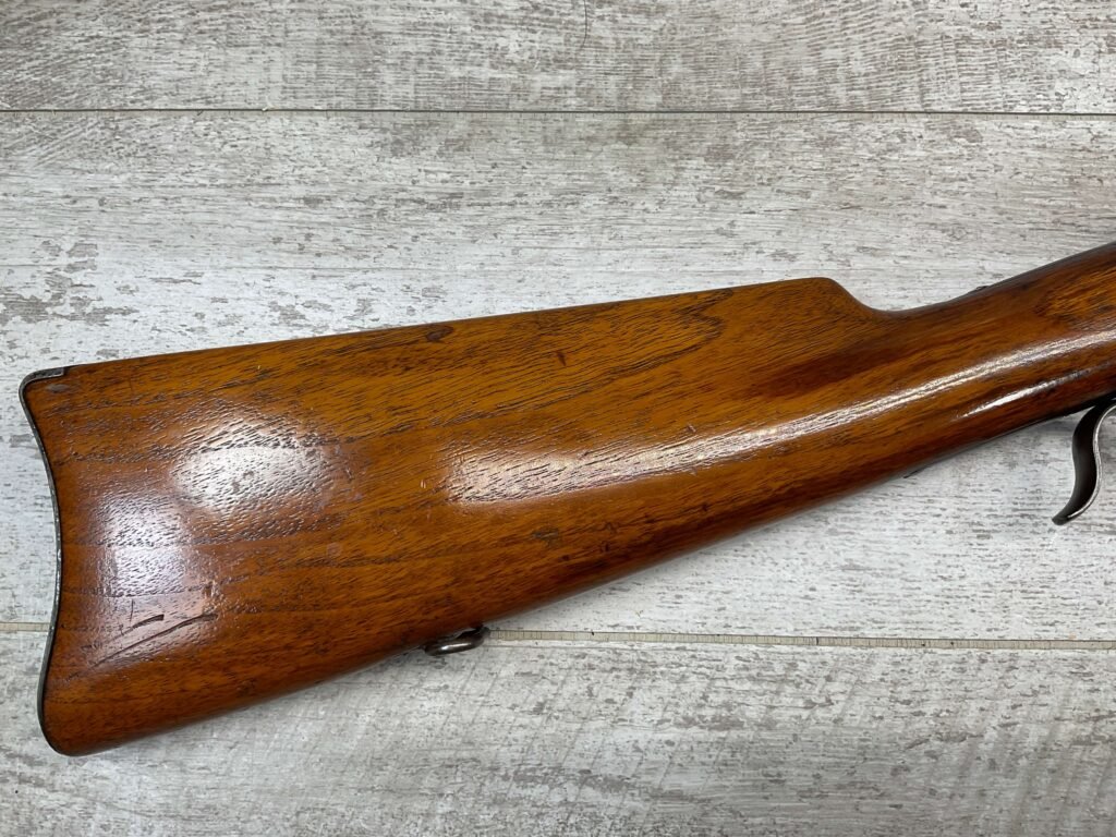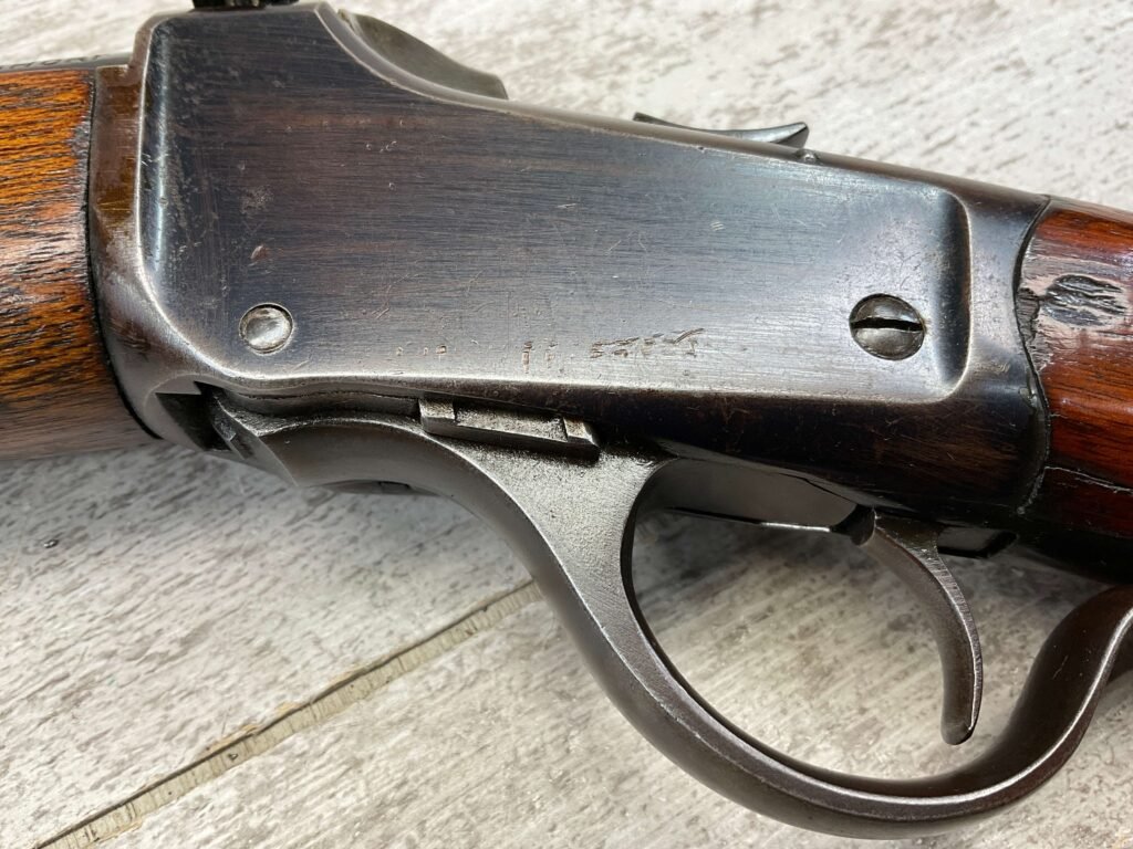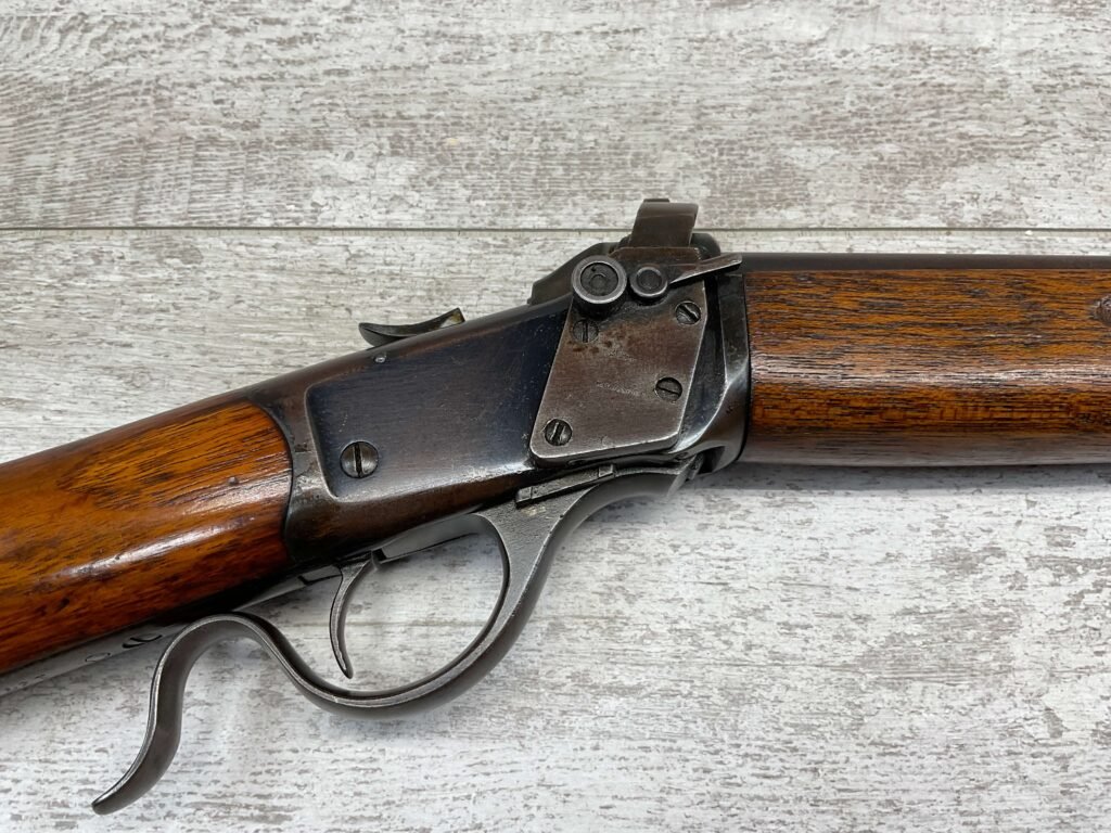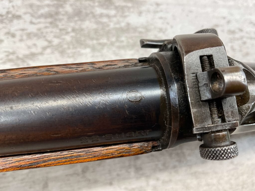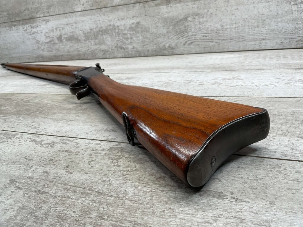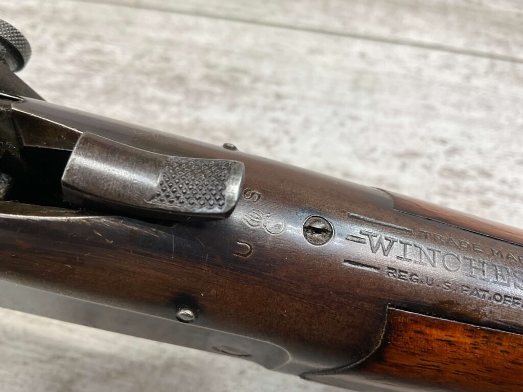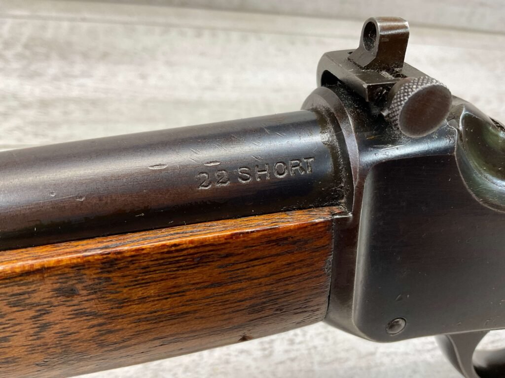 WINCHESTER MODEL 1885 LOW WALL 22 SHORT SINGLE SHOT RIFLE, 1918 MFR #127309, 28″ ROUND BARREL, VG BRIGHT BORE & RIFLING W/ A COUPLE AREAS OF FROSTING, 85% ORIGINAL BLUE FINISH W/ TYPICAL IMPRESSIONS/DINGS FROM AGE & USE TURNING PATINA, ORDINANCE BOMB US TRAINING MOD W/ “US ORDINANCE BOMB” STAMPED BELOW THE HAMMER, EXC WALNUT STOCK W/ CRESCENT BUTT STOCK & METAL PLATE, ADJ REAR PEEP SIGHT & TALL FRONT BLADE, A MUST FOR THE SERIOUS WINCHESTER COLLECTOR!!