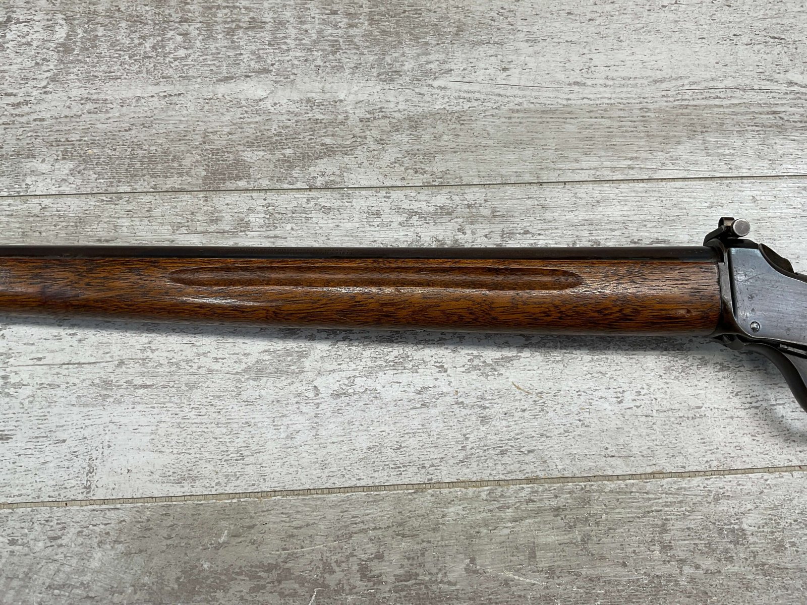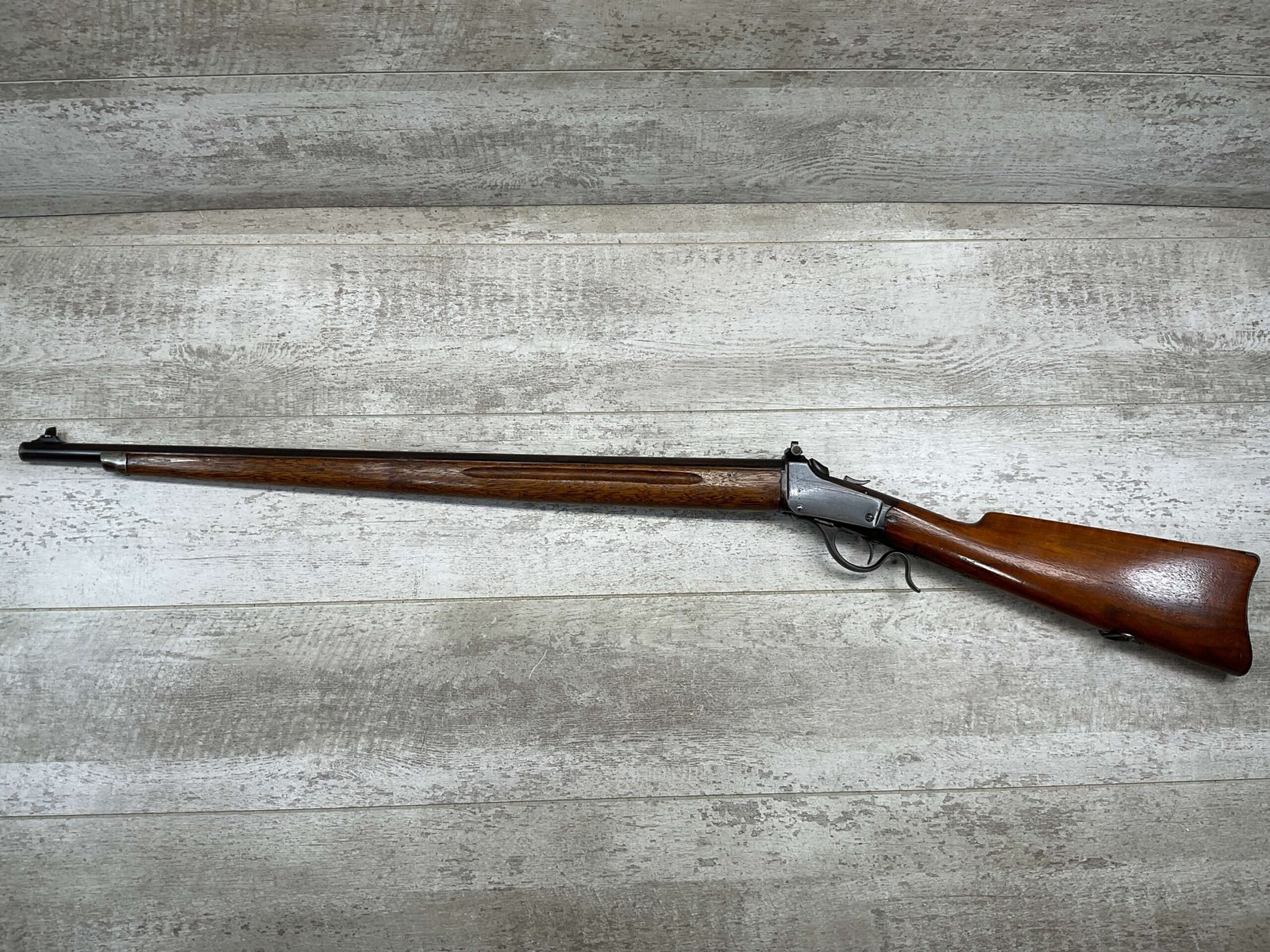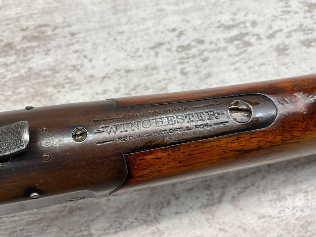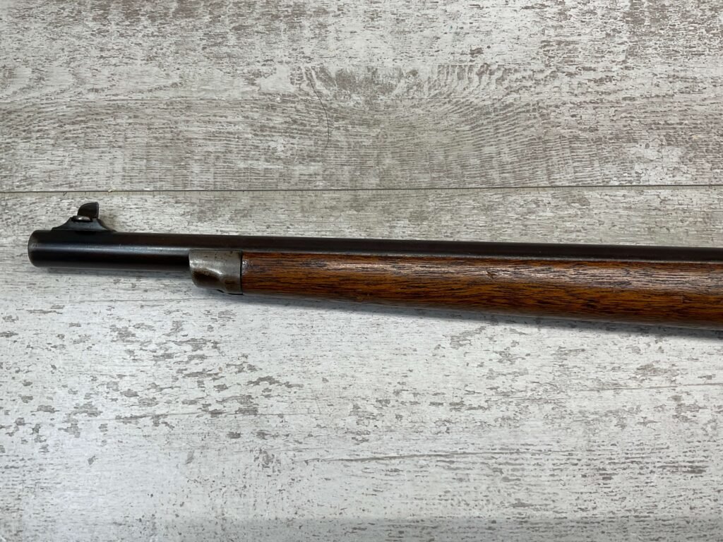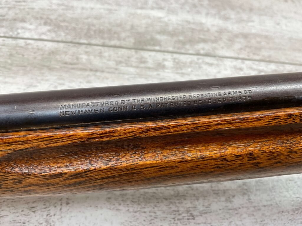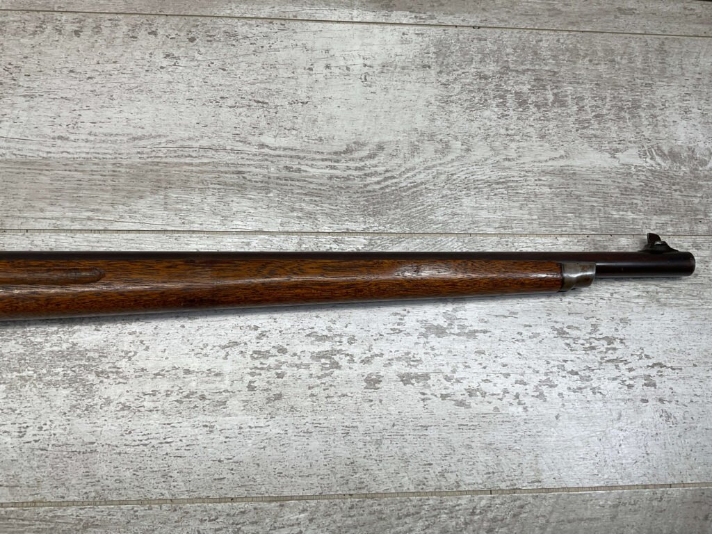 WINCHESTER MODEL 1885 LOW WALL 22 SHORT SINGLE SHOT RIFLE, 1918 MFR #127309, 28″ ROUND BARREL, VG BRIGHT BORE & RIFLING W/ A COUPLE AREAS OF FROSTING, 85% ORIGINAL BLUE FINISH W/ TYPICAL IMPRESSIONS/DINGS FROM AGE & USE TURNING PATINA, ORDINANCE BOMB US TRAINING MOD W/ “US ORDINANCE BOMB” STAMPED BELOW THE HAMMER, EXC WALNUT STOCK W/ CRESCENT BUTT STOCK & METAL PLATE, ADJ REAR PEEP SIGHT & TALL FRONT BLADE, A MUST FOR THE SERIOUS WINCHESTER COLLECTOR!!