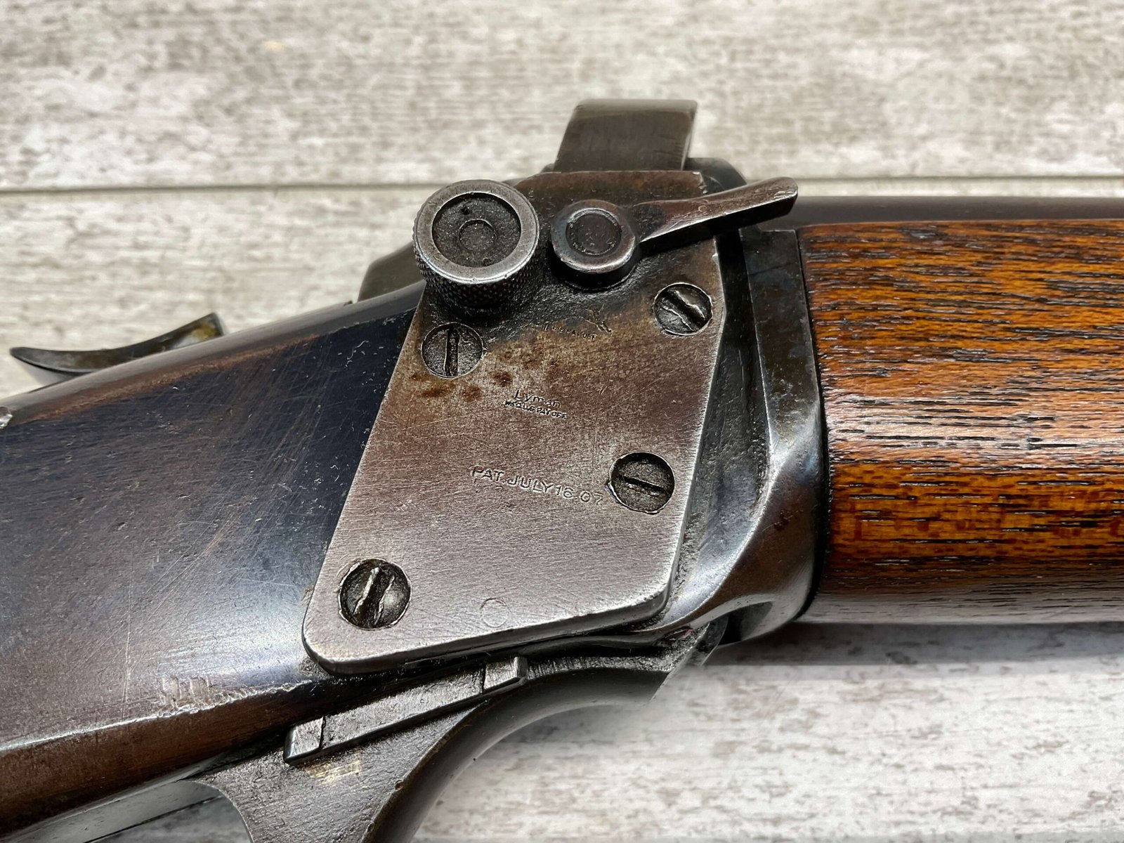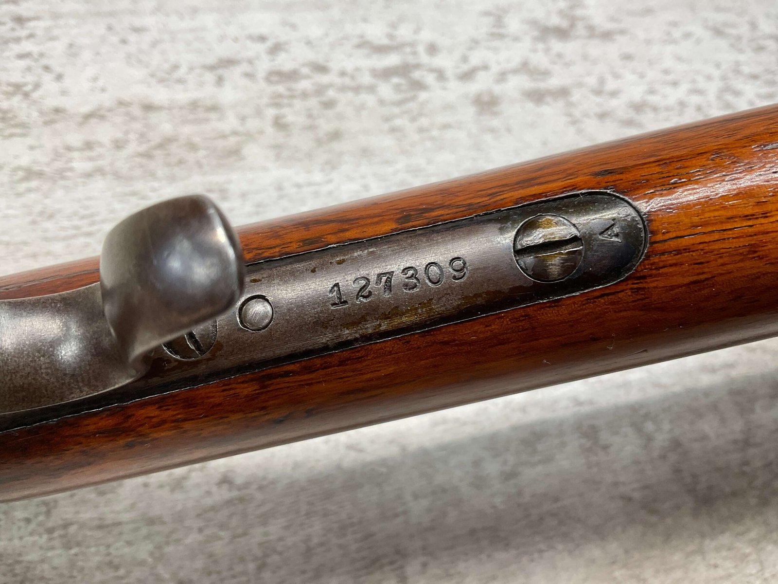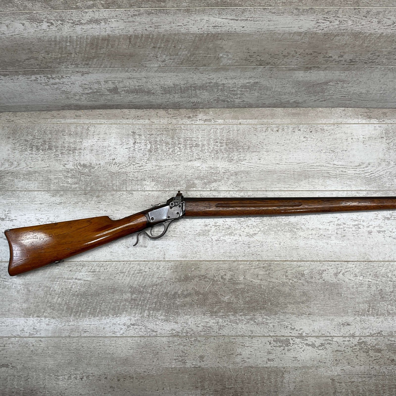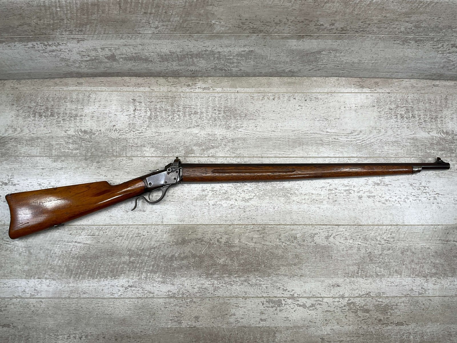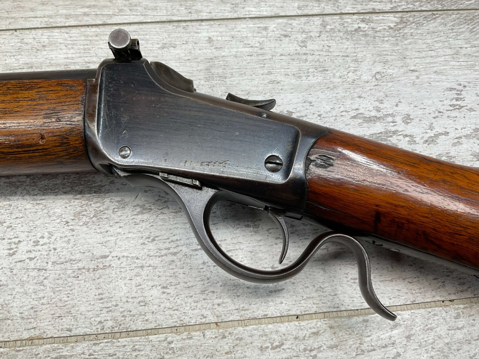 WINCHESTER MODEL 1885 LOW WALL 22 SHORT SINGLE SHOT RIFLE, 1918 MFR #127309, 28″ ROUND BARREL, VG BRIGHT BORE & RIFLING W/ A COUPLE AREAS OF FROSTING, 85% ORIGINAL BLUE FINISH W/ TYPICAL IMPRESSIONS/DINGS FROM AGE & USE TURNING PATINA, ORDINANCE BOMB US TRAINING MOD W/ “US ORDINANCE BOMB” STAMPED BELOW THE HAMMER, EXC WALNUT STOCK W/ CRESCENT BUTT STOCK & METAL PLATE, ADJ REAR PEEP SIGHT & TALL FRONT BLADE, A MUST FOR THE SERIOUS WINCHESTER COLLECTOR!!