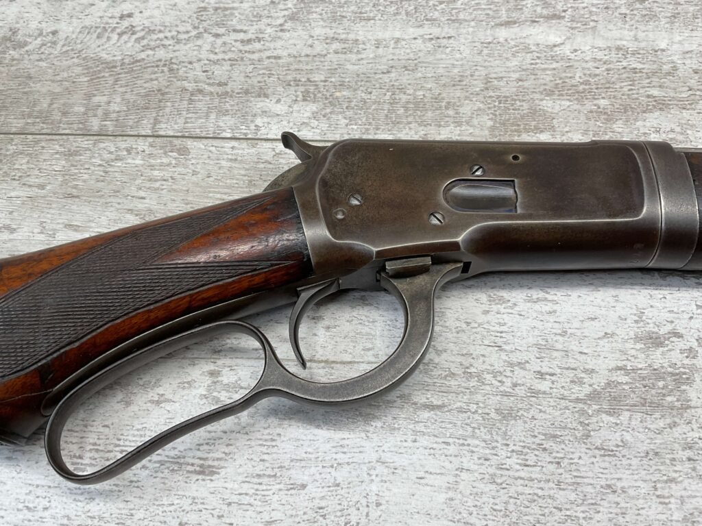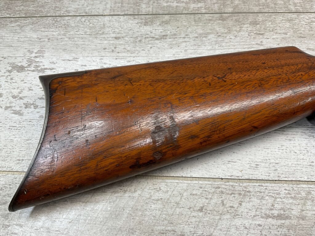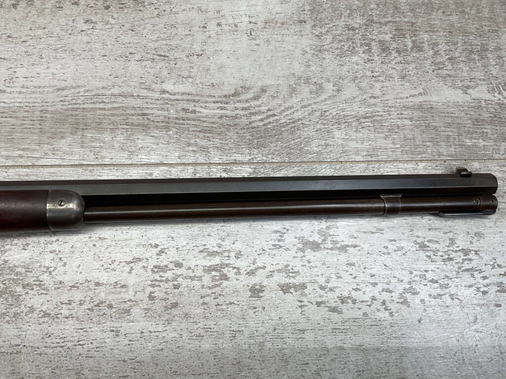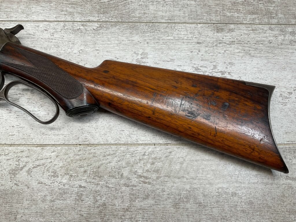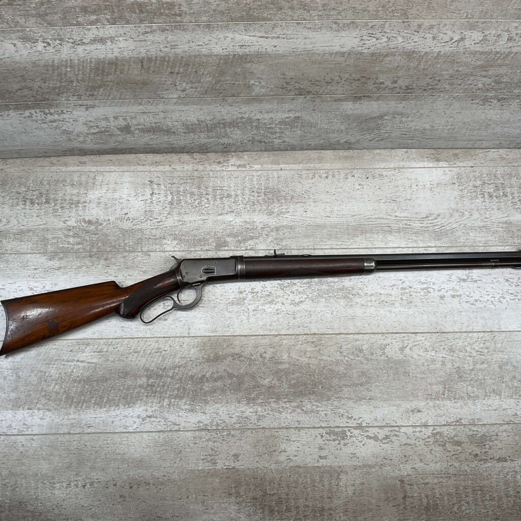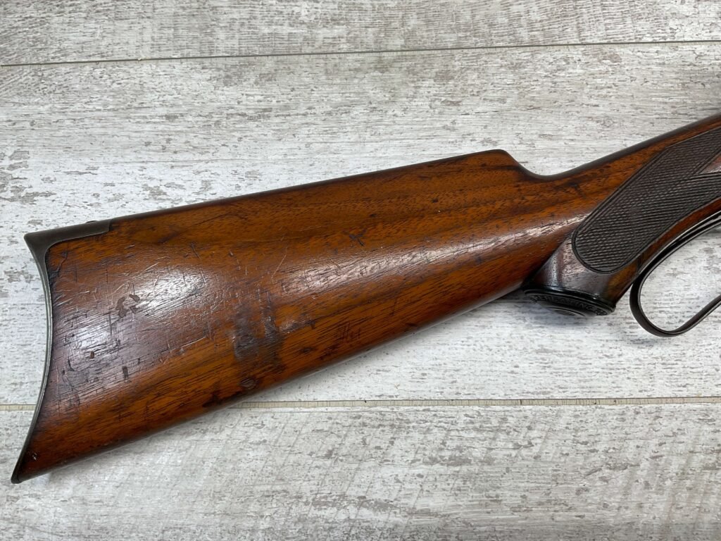 WINCHESTER MODEL 1892 TAKEDOWN 32-20 LEVER ACTION RIFLE, 1901 MFR #177945, 24″ OCTAGON BARREL, EXC BRIGHT BORE & RIFLING, VG PISTOL GRIP WALNUT STOCK W/ CRESCENT BUTT & METAL PLATE (CHECKERING BELIEVED TO BE ADDED LATER) & SHOWING NICKS & DINGS FROM AGE / USE, ORIGINAL FINISH TURNING VERY NICE BROWN PATINA, FULL LENGTH MAGAZINE TUBE W/ TAKEDOWN, BEAUTIFUL FIREARM W/ SMOOTH ACTION!