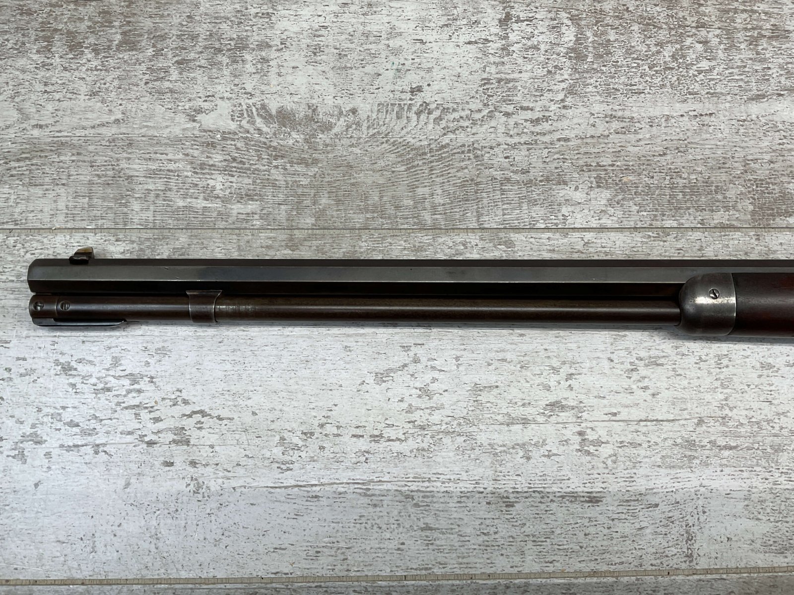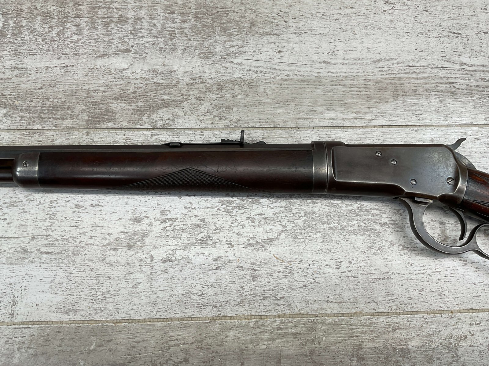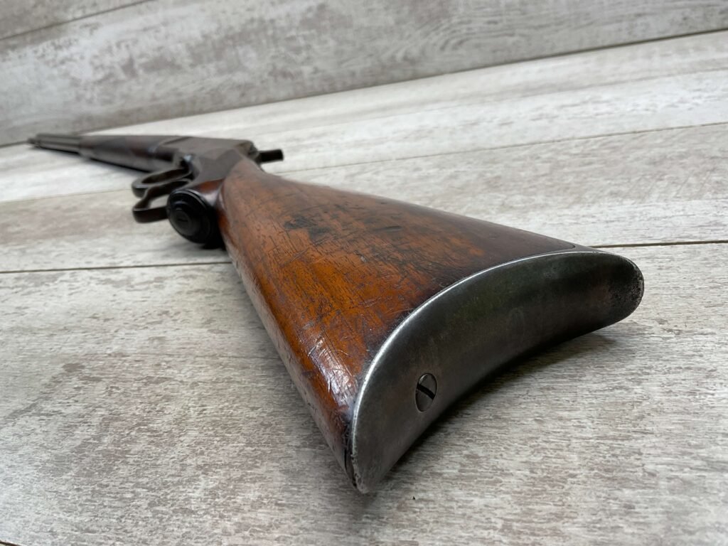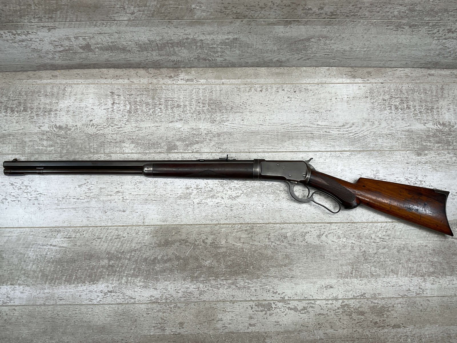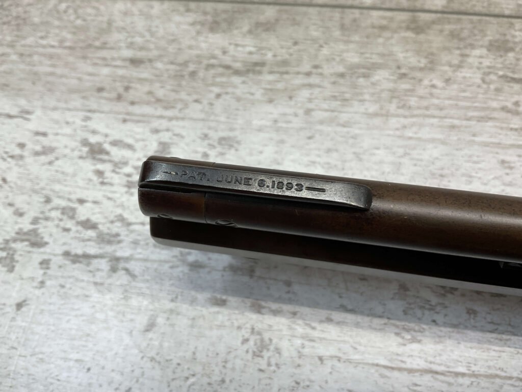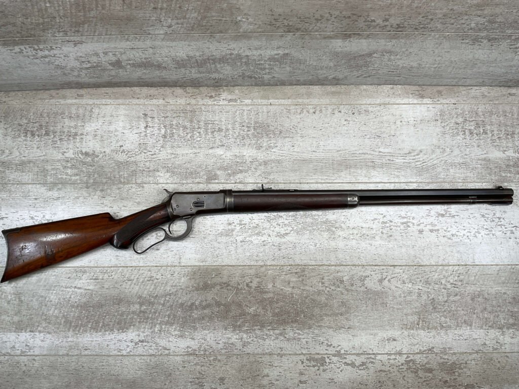 WINCHESTER MODEL 1892 TAKEDOWN 32-20 LEVER ACTION RIFLE, 1901 MFR #177945, 24″ OCTAGON BARREL, EXC BRIGHT BORE & RIFLING, VG PISTOL GRIP WALNUT STOCK W/ CRESCENT BUTT & METAL PLATE (CHECKERING BELIEVED TO BE ADDED LATER) & SHOWING NICKS & DINGS FROM AGE / USE, ORIGINAL FINISH TURNING VERY NICE BROWN PATINA, FULL LENGTH MAGAZINE TUBE W/ TAKEDOWN, BEAUTIFUL FIREARM W/ SMOOTH ACTION!