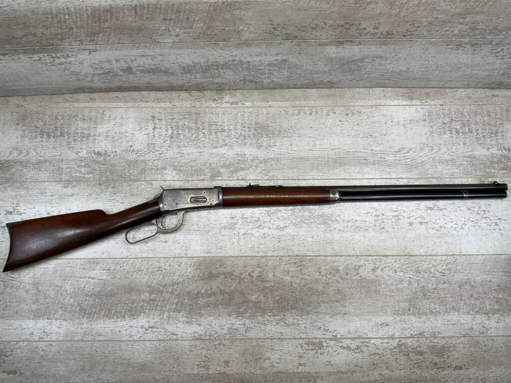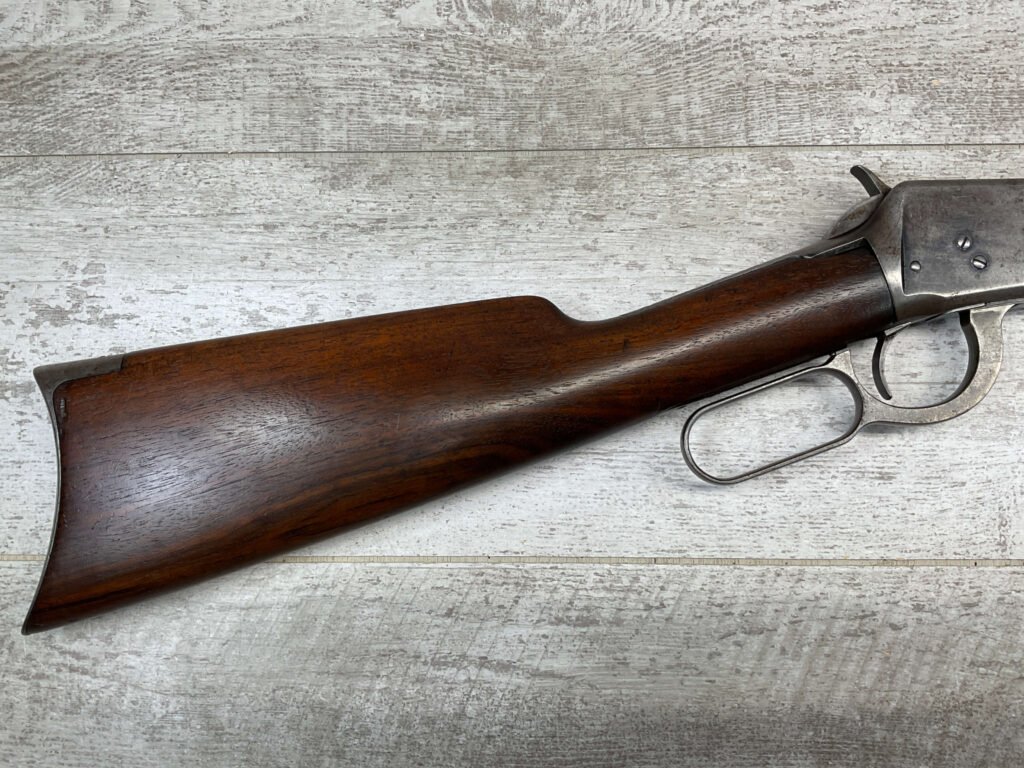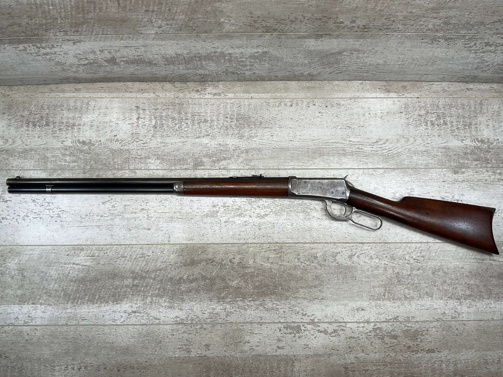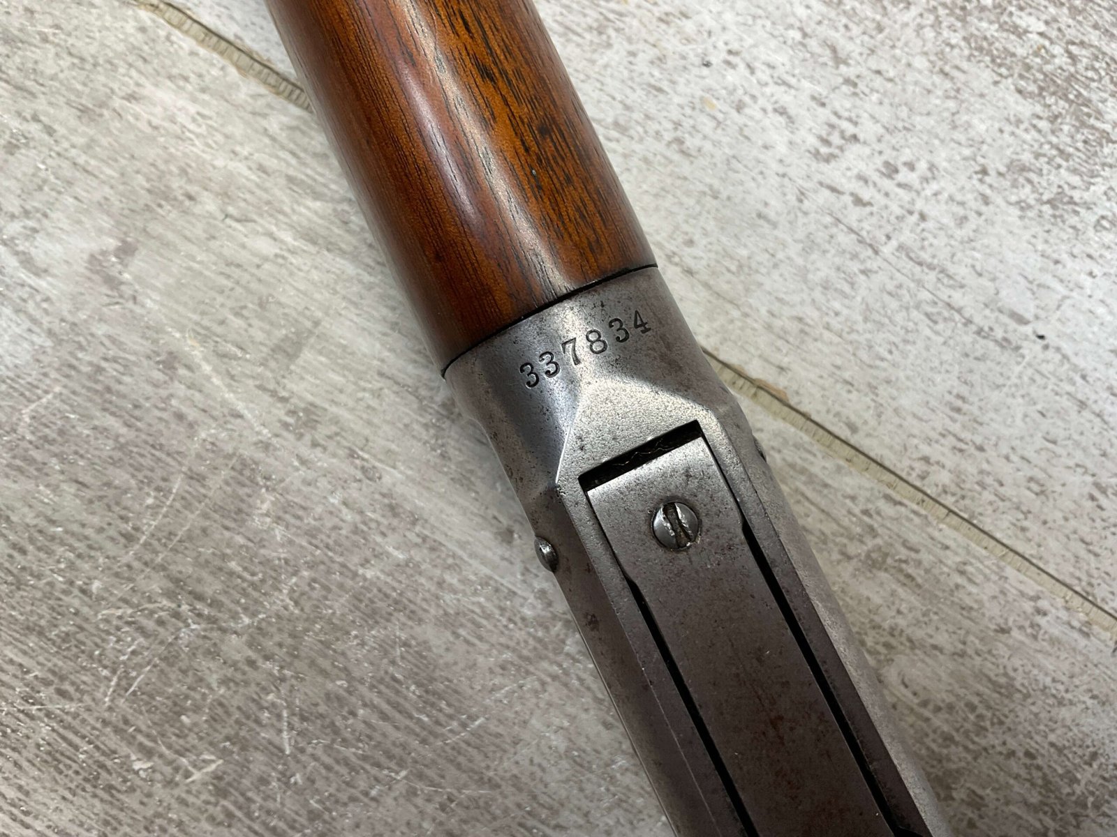 WINCHESTER MODEL 1894 .32-40 LEVER ACTION RIFLE, 1907 MFR #337834, 26″ ROUND BARREL, DARKER POOR BORE W/ GOOD RIFLING, VG WALNUT STOCK W/ CRESCENT BUTT & METAL PLATE, 35% ORIGINAL BLUE FINISH TURNING PATINA W/ VERY LITTLE FINISH REMAINING ON RECEIVER, FULL LENGTH TUBE MAGAZINE, GREAT ACTION & READY TO SHOOT!!