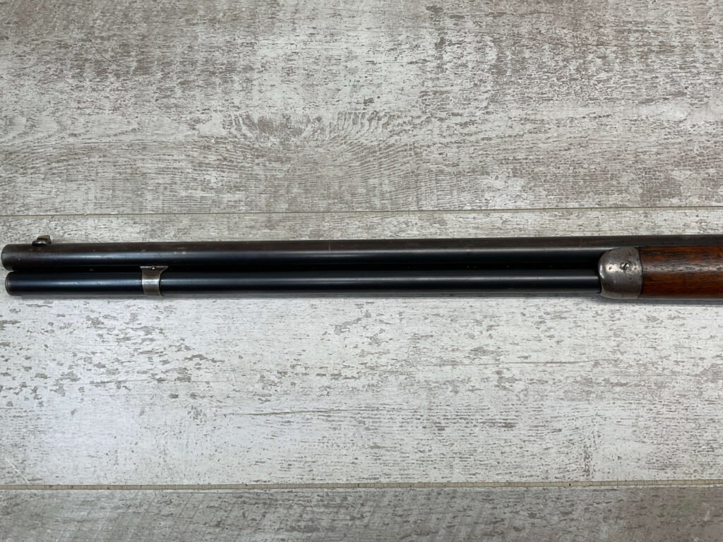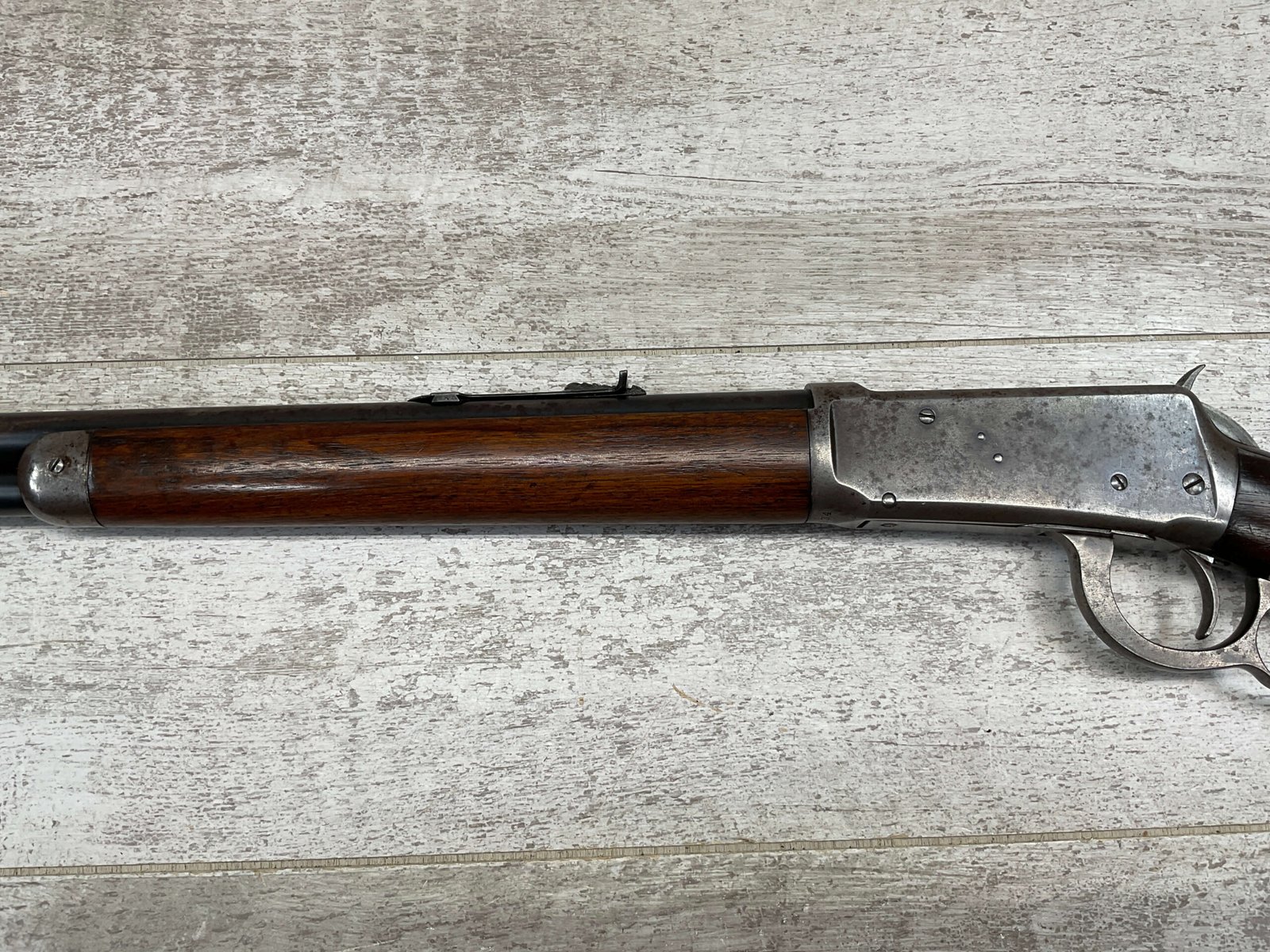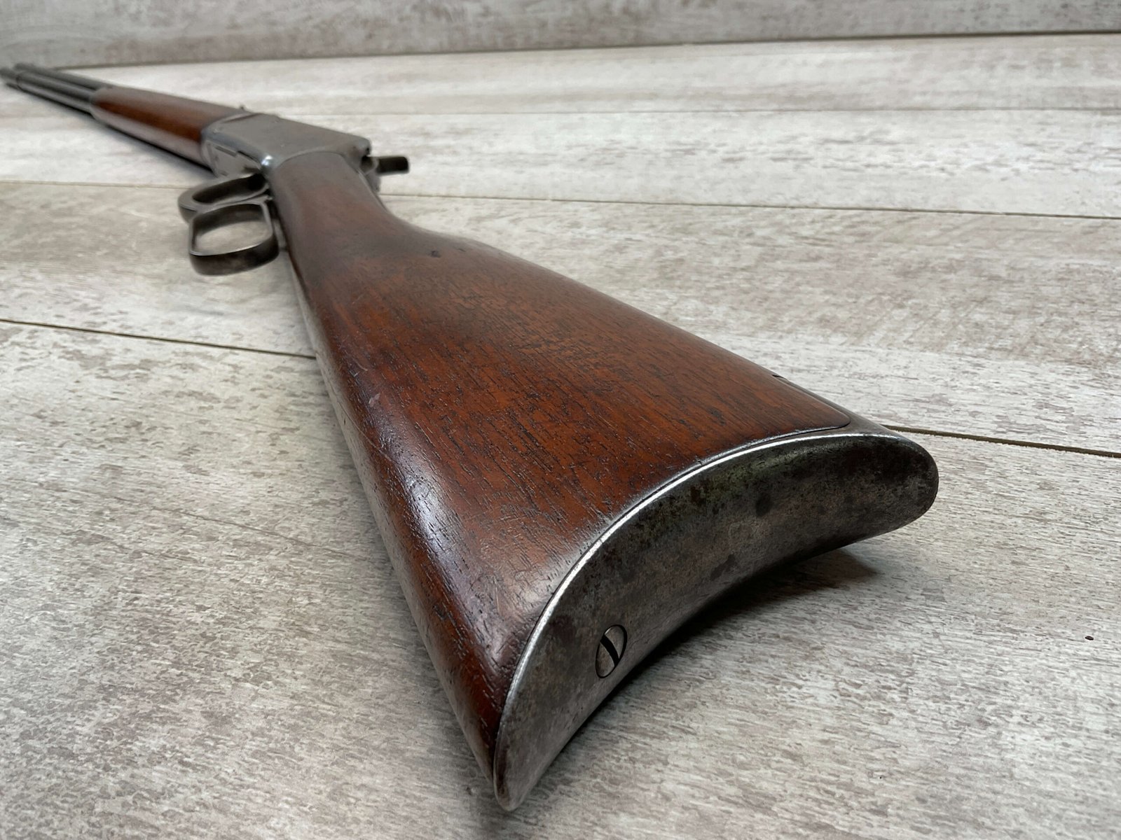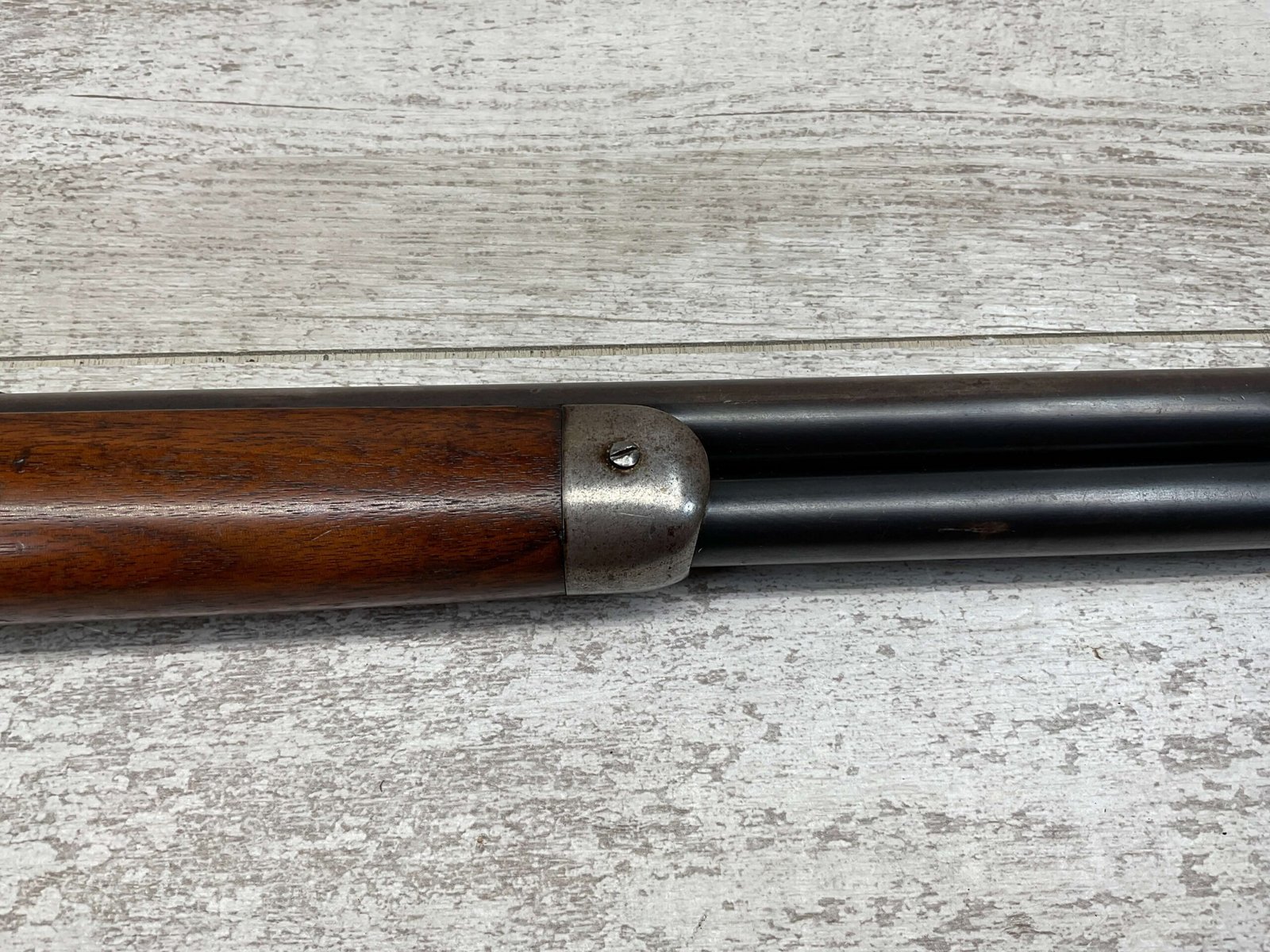 WINCHESTER MODEL 1894 .32-40 LEVER ACTION RIFLE, 1907 MFR #337834, 26″ ROUND BARREL, DARKER POOR BORE W/ GOOD RIFLING, VG WALNUT STOCK W/ CRESCENT BUTT & METAL PLATE, 35% ORIGINAL BLUE FINISH TURNING PATINA W/ VERY LITTLE FINISH REMAINING ON RECEIVER, FULL LENGTH TUBE MAGAZINE, GREAT ACTION & READY TO SHOOT!!
