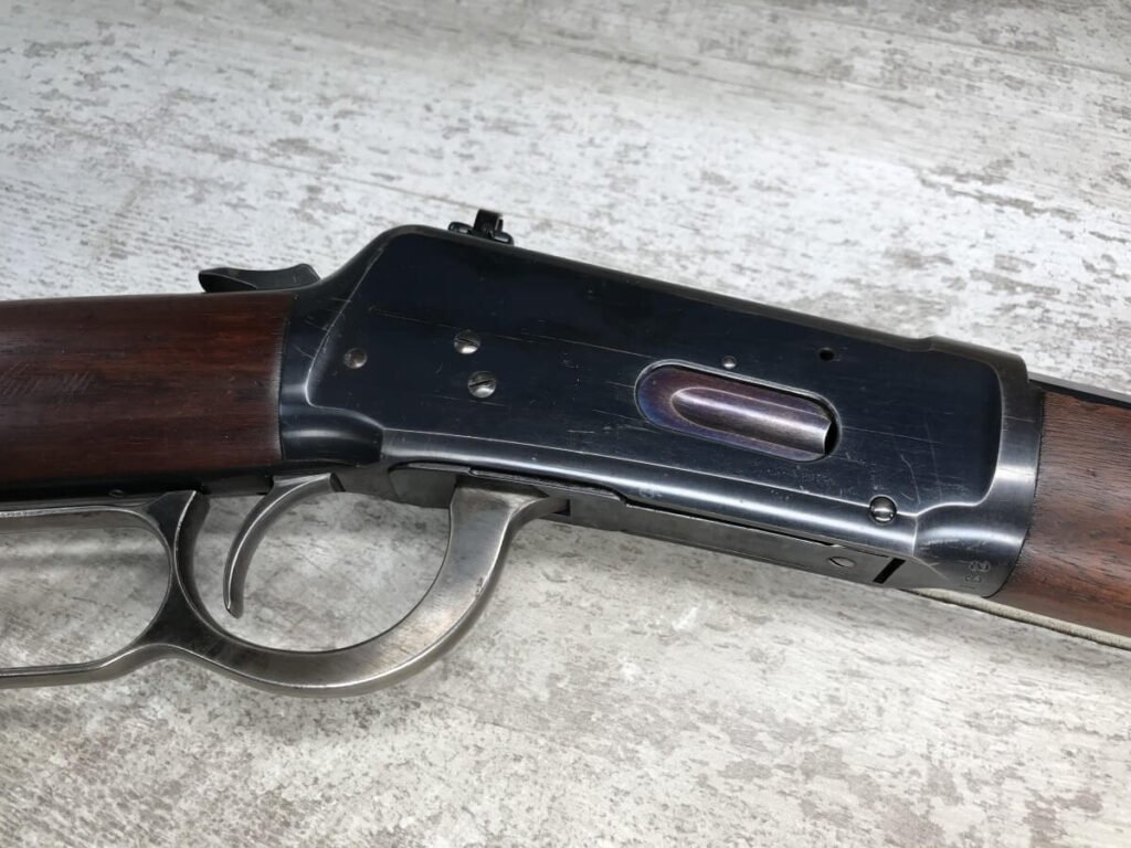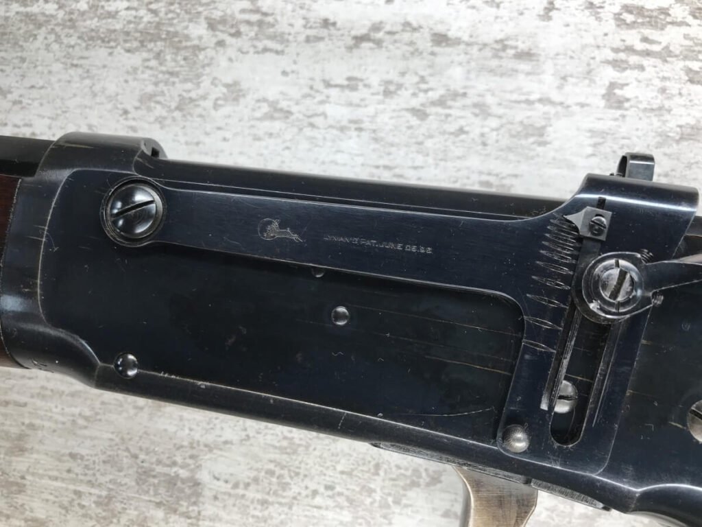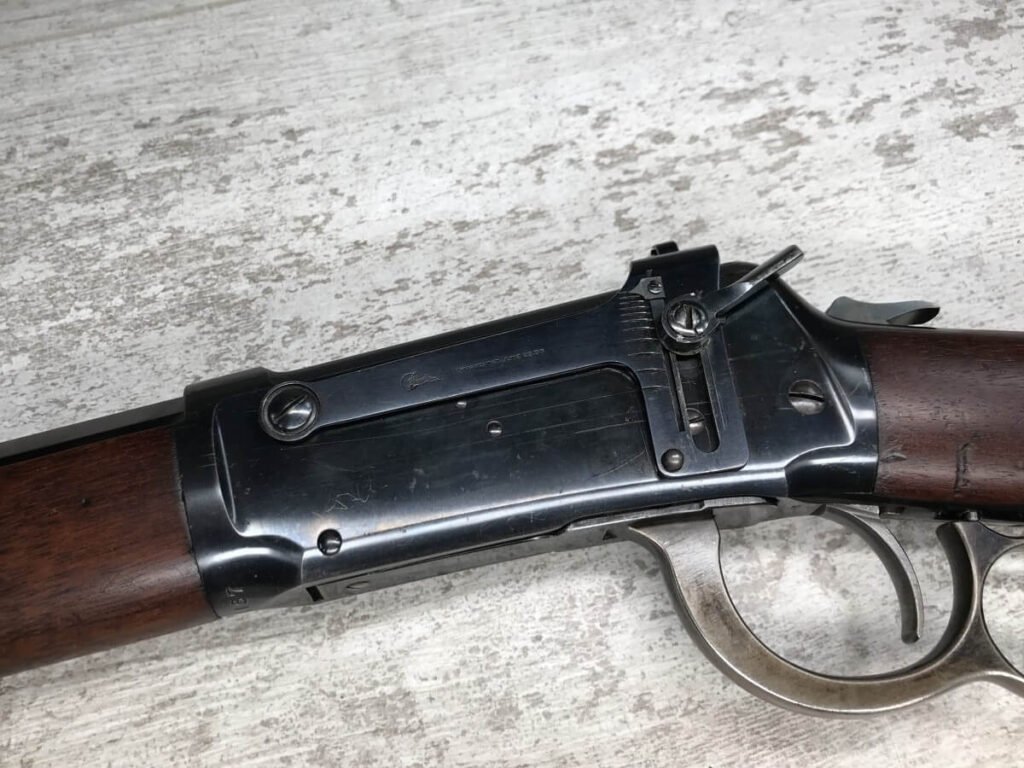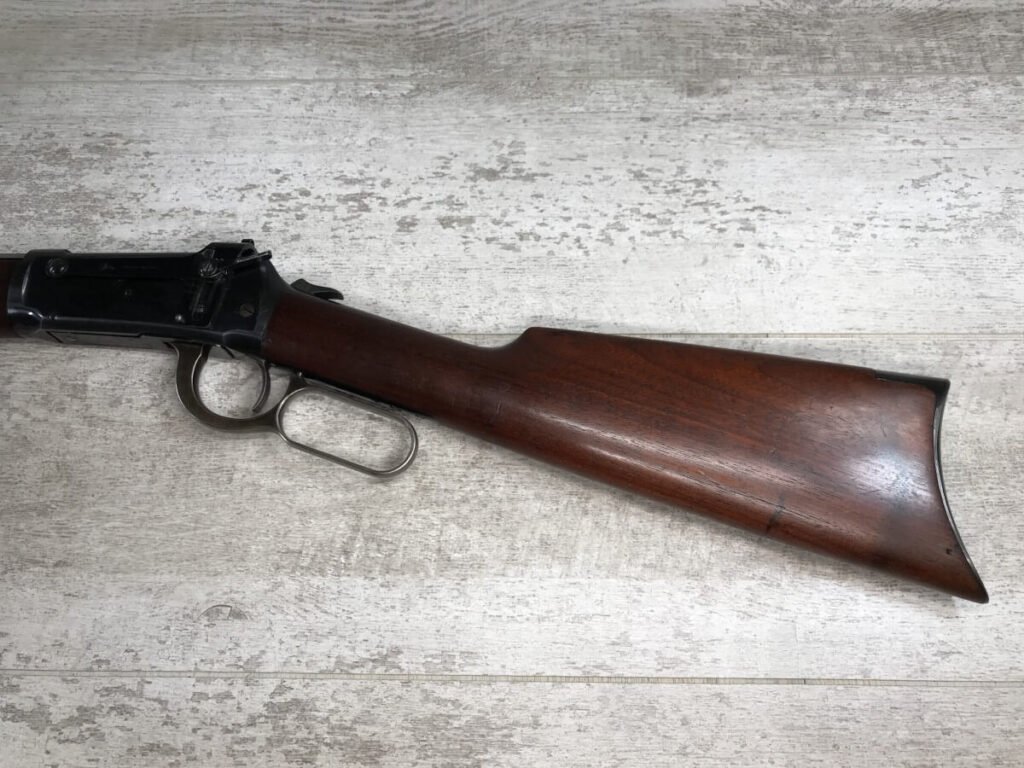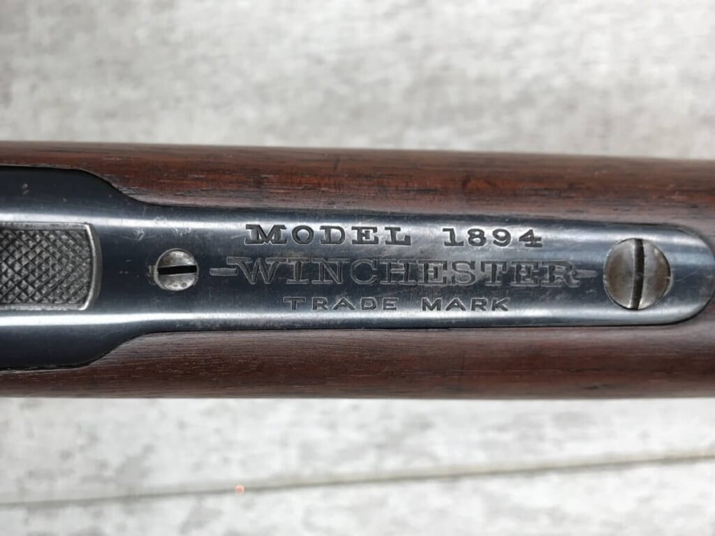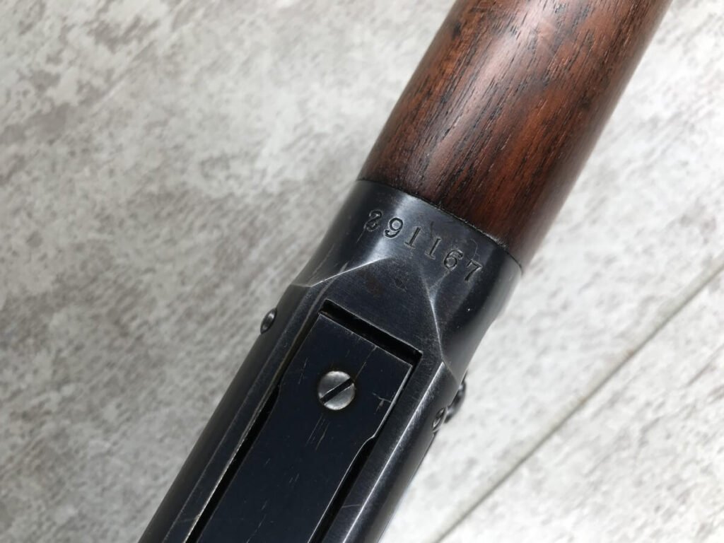 WINCHESTER MODEL 1894 LEVER ACTION RIFLE 1903 MFR #291167 .32WS, 25″ OCTAGON BARREL, 9 ROUND TUBE MAG, EXC WALNUT FOREARM AND BUTT STOCK W/SOME NICKS AND INDENTATIONS, SMOOTH BUTTPLATE, LYMAN’S 21 ADJUSTABLE SIGHT W/”DA” STAMPED ON BACK (BELIEVED TO BE ORIGINAL FROM WINCHESTER), 95% BLUE REMAINING, SOME HANDLING MARKS, LEVER HAS TURNED GREY/BROWN PATINA, BRIGHT BORE WITH EXC RIFLING, STRONG ACTION, 95% OVERALL