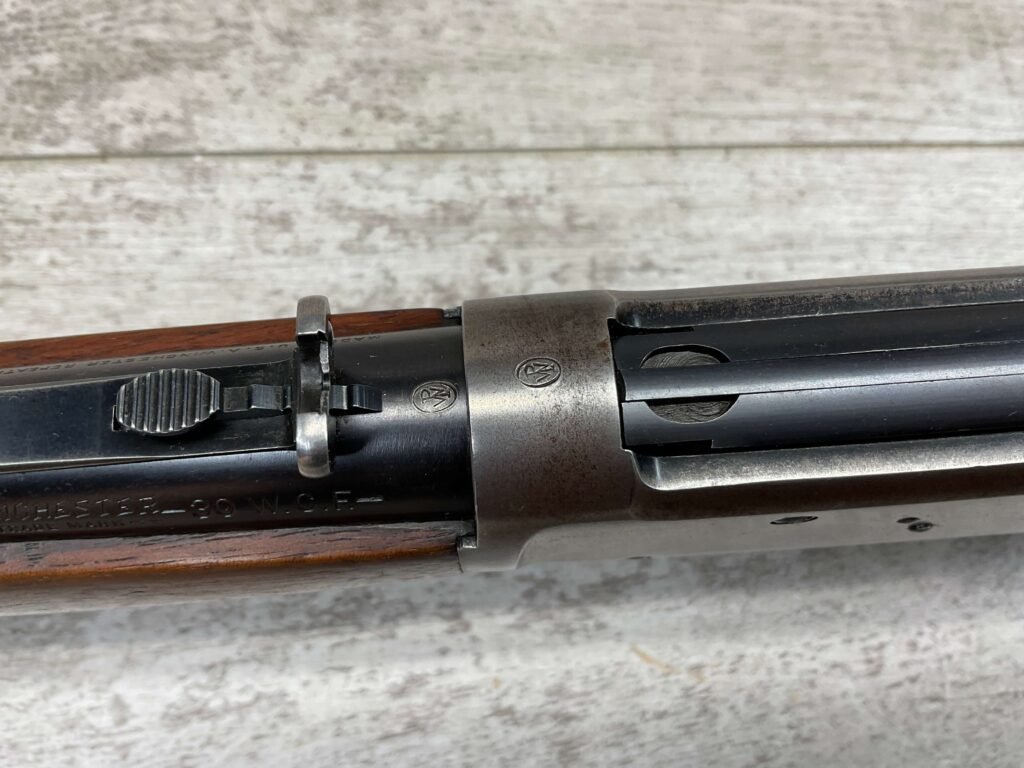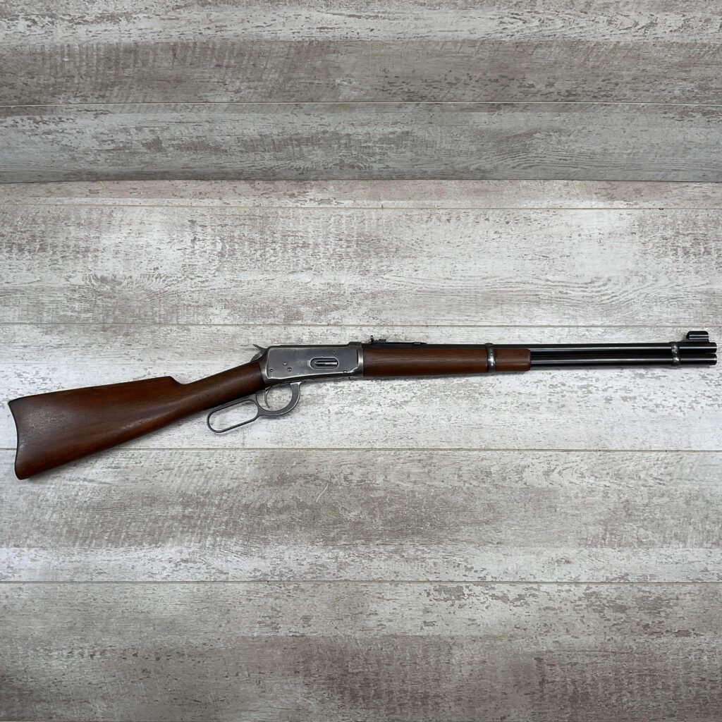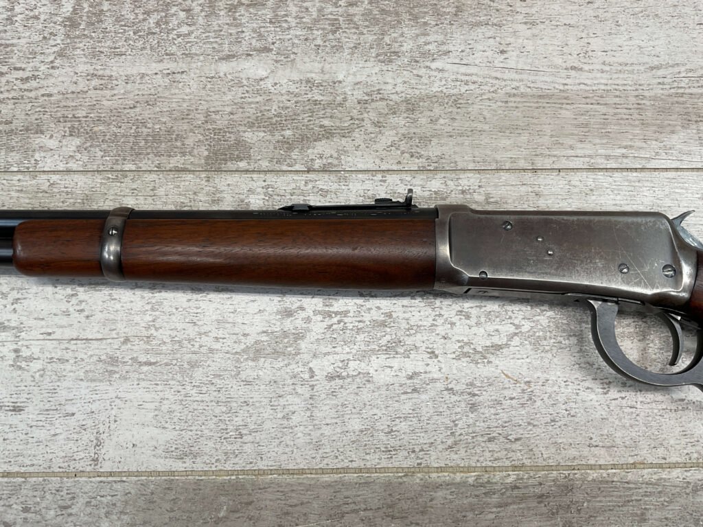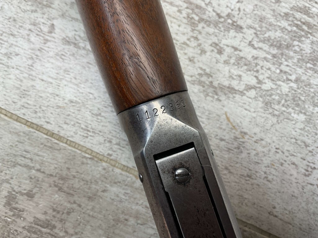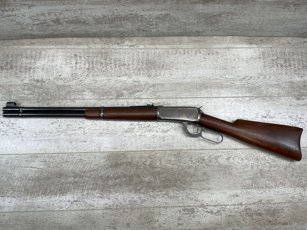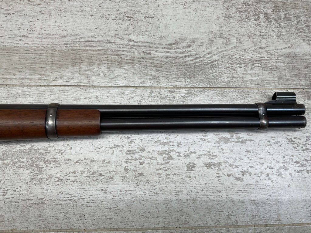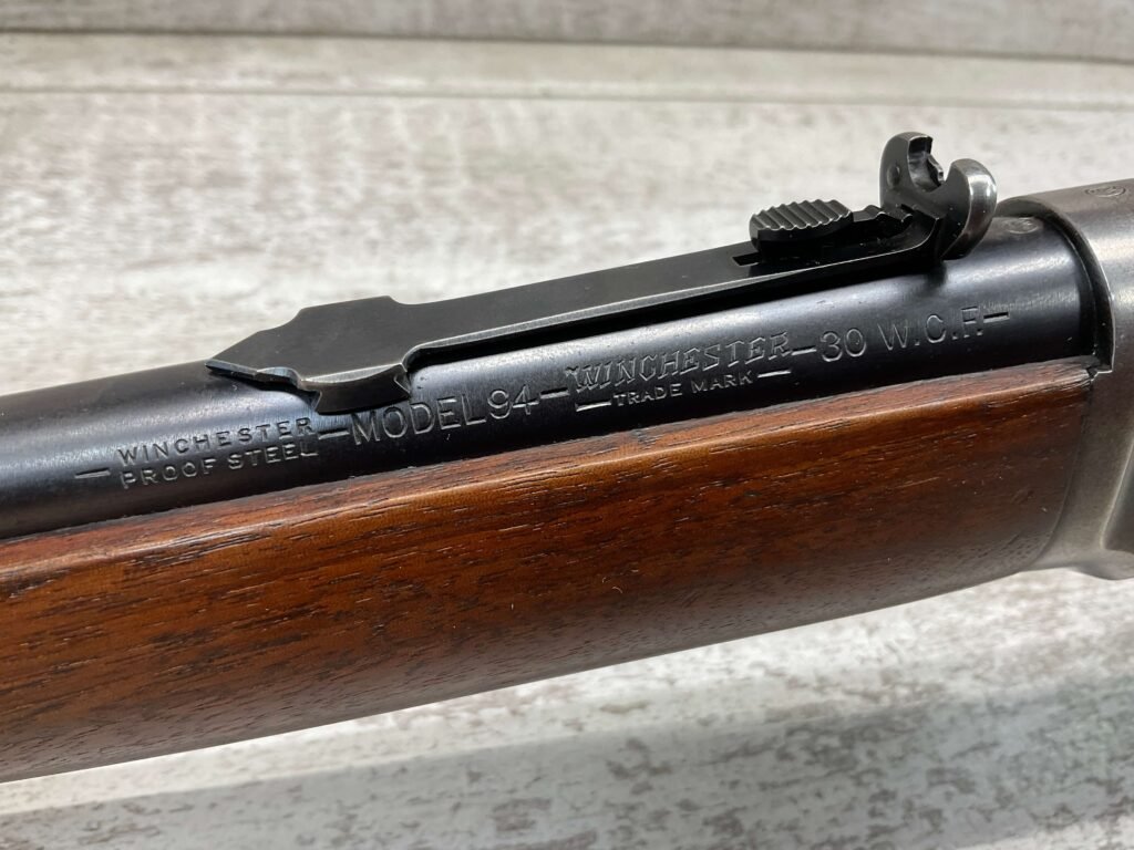 WINCHESTER MODEL 94 30 WCF LEVER ACTION CARBINE RIFLE, 1937 MFR #1122360, 20″ ROUND BARREL, EXC MINTY BORE & RIFLING, 80-85% ORIGINAL FINISH W/ LIGHT WEAR & RECEIVER TURNING BROWN PATINA, EXC STOCK W/ LIGHT IMPRESSIONS FROM AGE/USE & CRESCENT BUTTSTOCK W/ METAL PLATE, 100% CORRECT, BLADE FRONT SIGHT W/ HOOD & SPORTING 22-F REAR SIGHT, FULL LENGTH MAGAZINE TUBE, VERY NICE!!