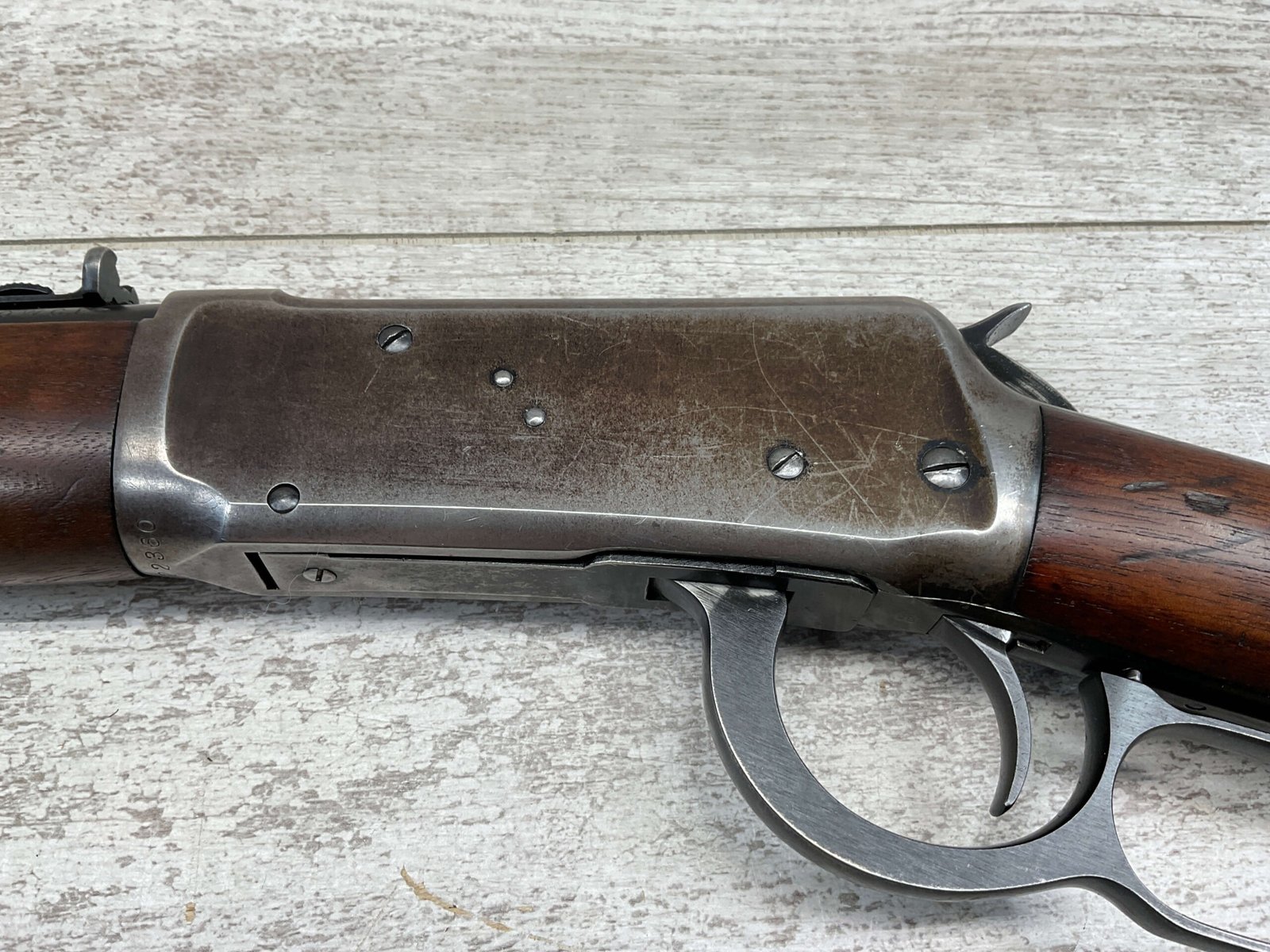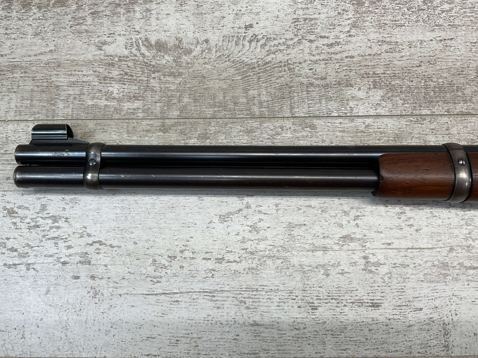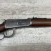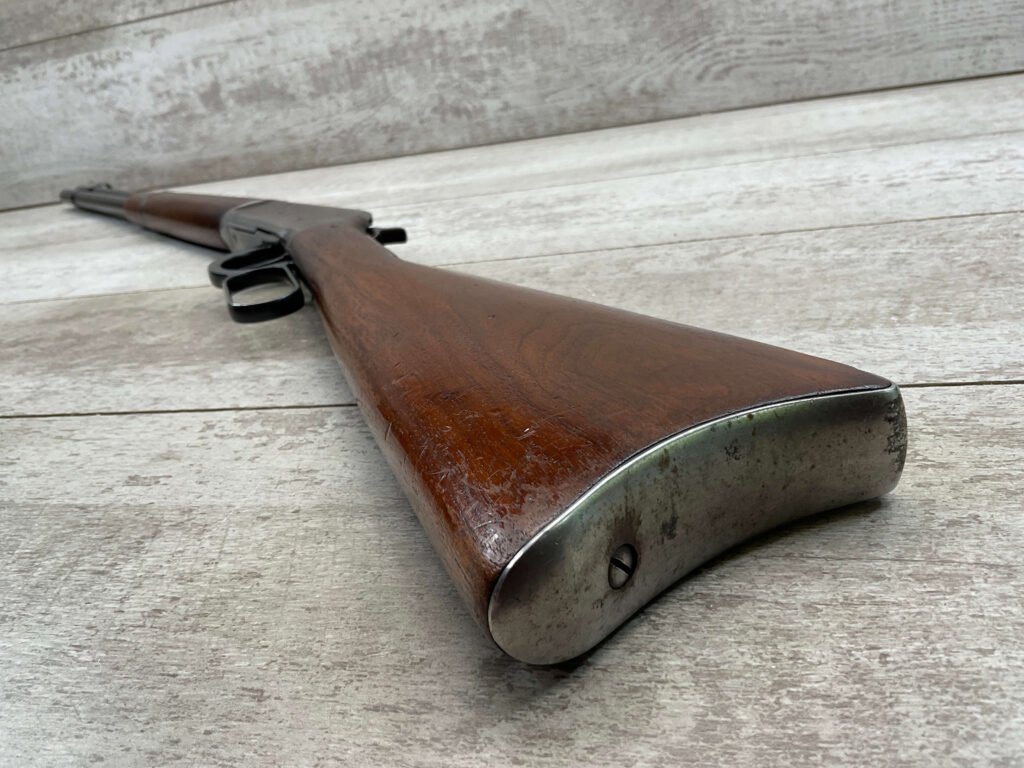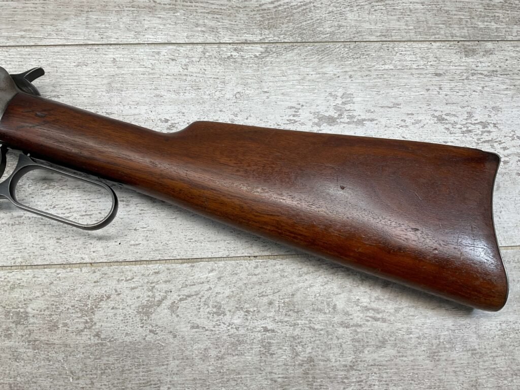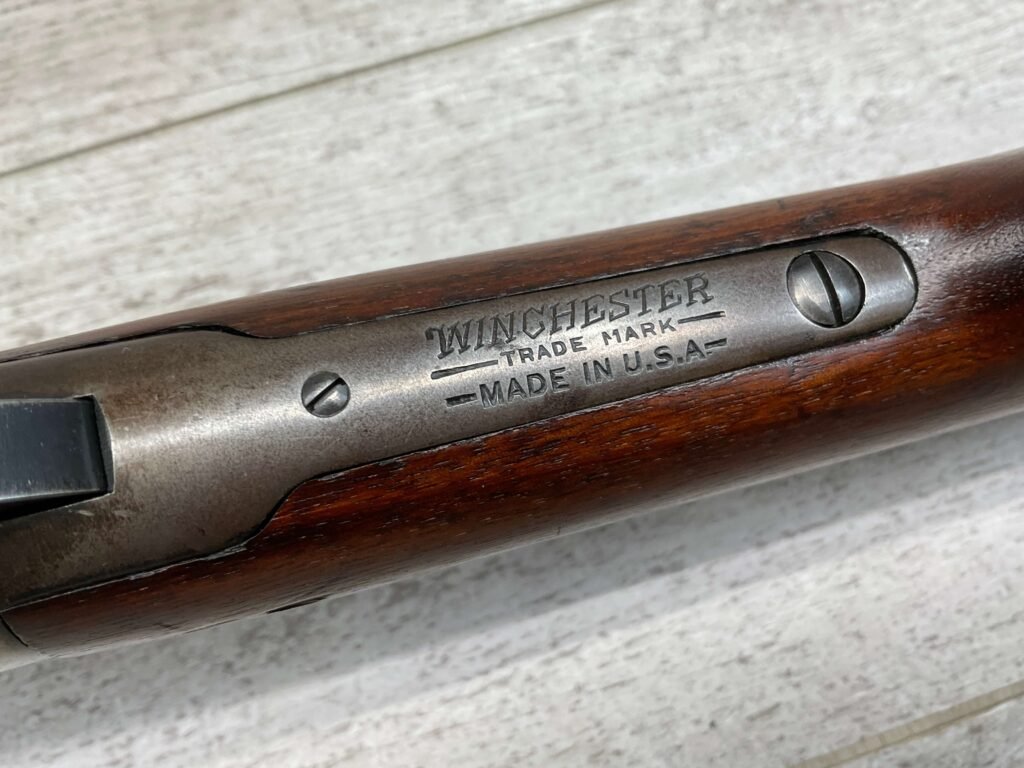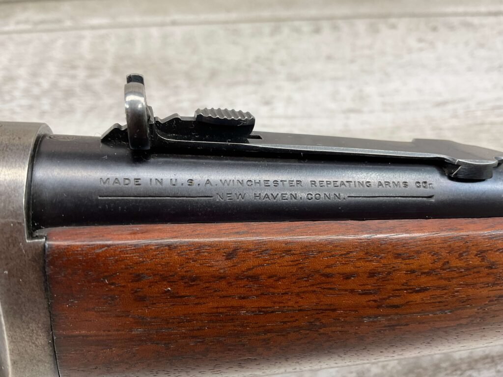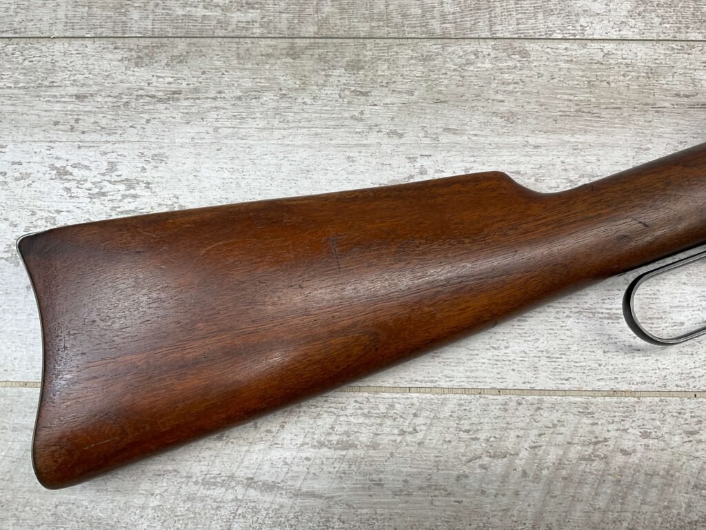 WINCHESTER MODEL 94 30 WCF LEVER ACTION CARBINE RIFLE, 1937 MFR #1122360, 20″ ROUND BARREL, EXC MINTY BORE & RIFLING, 80-85% ORIGINAL FINISH W/ LIGHT WEAR & RECEIVER TURNING BROWN PATINA, EXC STOCK W/ LIGHT IMPRESSIONS FROM AGE/USE & CRESCENT BUTTSTOCK W/ METAL PLATE, 100% CORRECT, BLADE FRONT SIGHT W/ HOOD & SPORTING 22-F REAR SIGHT, FULL LENGTH MAGAZINE TUBE, VERY NICE!!