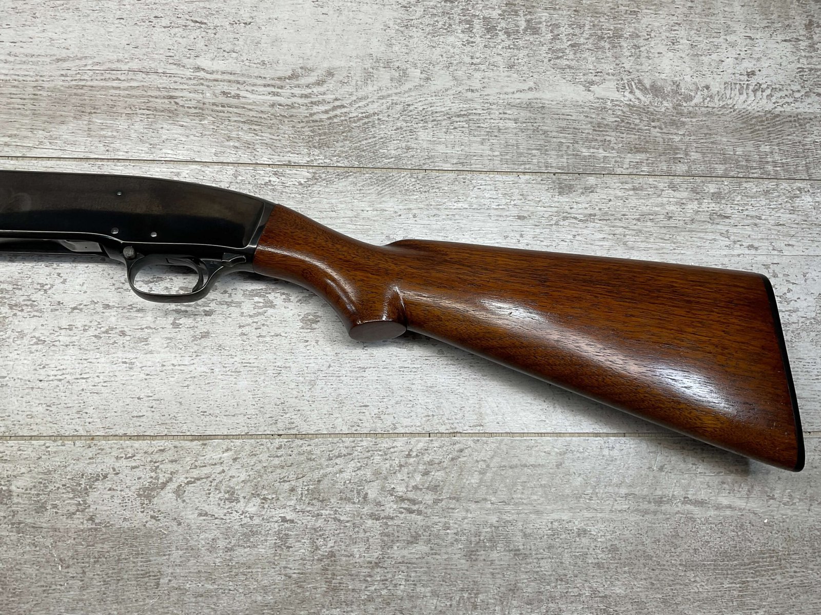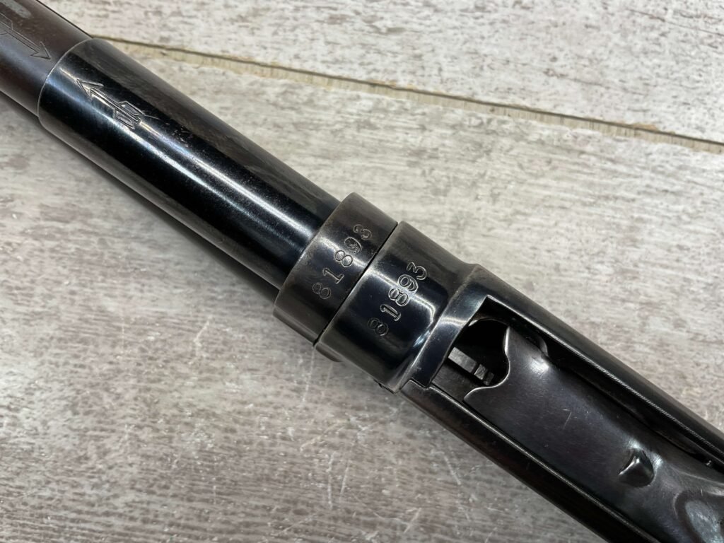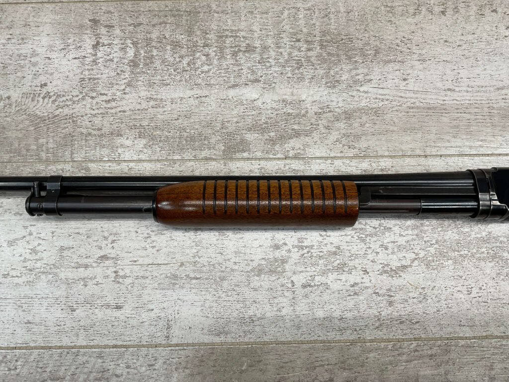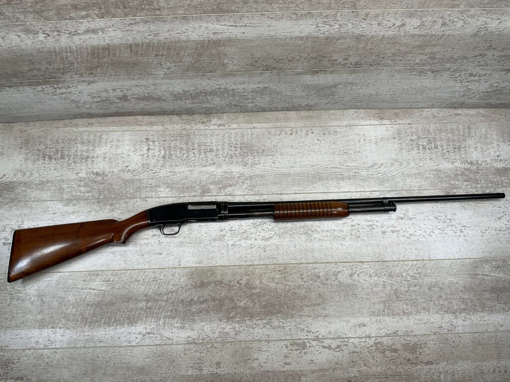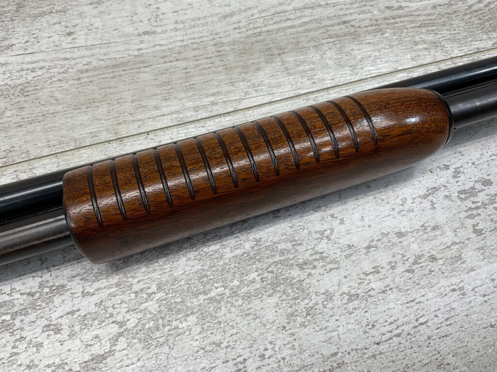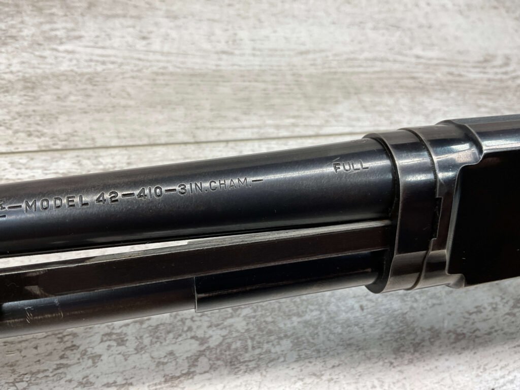 WINCHESTER MODEL 42 .410 PUMP SHOTGUN #81893, 1950 MFR, 28″ BARREL, 98%+ ORIGINAL BLUE FINISH W/ VERY LIGHT HIGH EDGE WEAR, EXC PISTOL GRIP BEAUTIFUL WALNUT STOCK W/ VERY LIGHT HANDLING MARKS & BLACK PLASTIC BUTT PLATE, NEAR MINT BORE, FULL CHOKE, 1/2 TUBE MAGAZINE, NOT SURE YOU’LL FIND ONE NICER!! 98%+ OVERALL