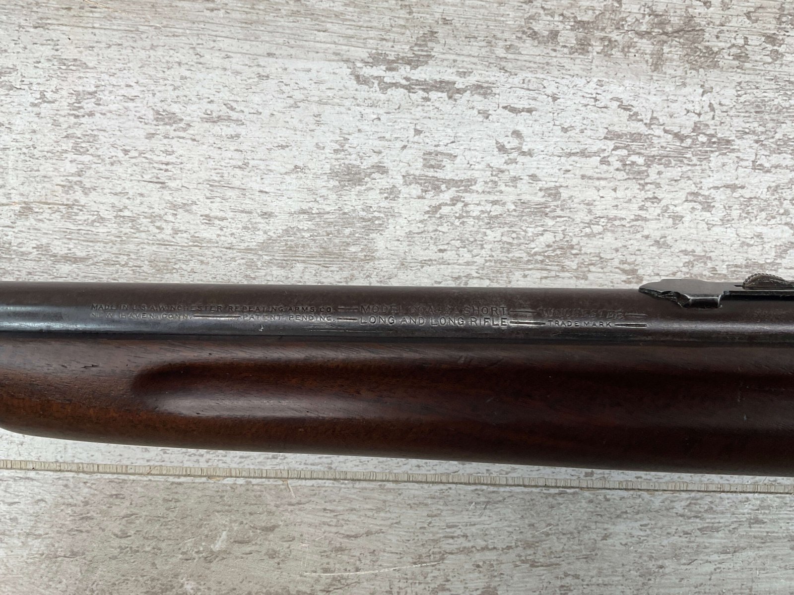 WINCHESTER MODEL 60A .22LR BOLT ACTION RIFLE, #NSN, 27″ BARREL W/EXC BORE & RIFLING, POSSIBLE REBLUED W/RUST BLUING FINISH & ACCENT SWIRLS, STOCK HAS BEEN REFINISHED, WEAR & USE SCRATCHES AND BLEMISHES PRESENT, RIGHT SIDE OF THE FOREARM GRIP HAS SOME DEEP SCRATCHING THAT HAS BEEN REFINISHED BUT STILL PRESENT, OVERALL 85+%