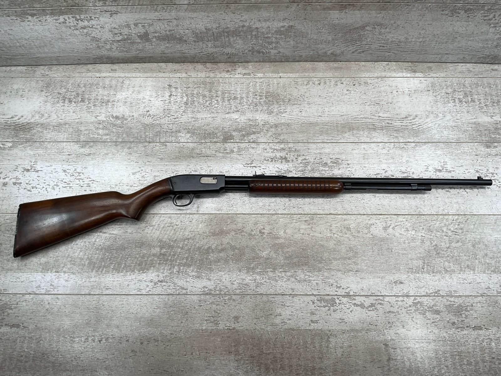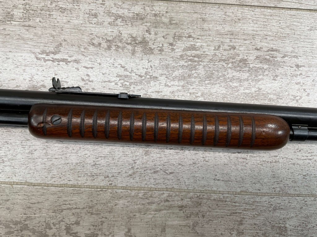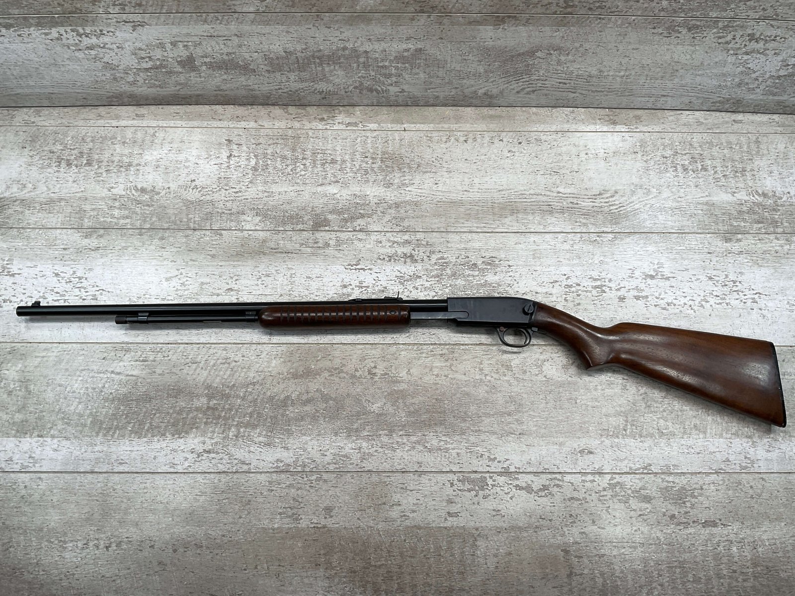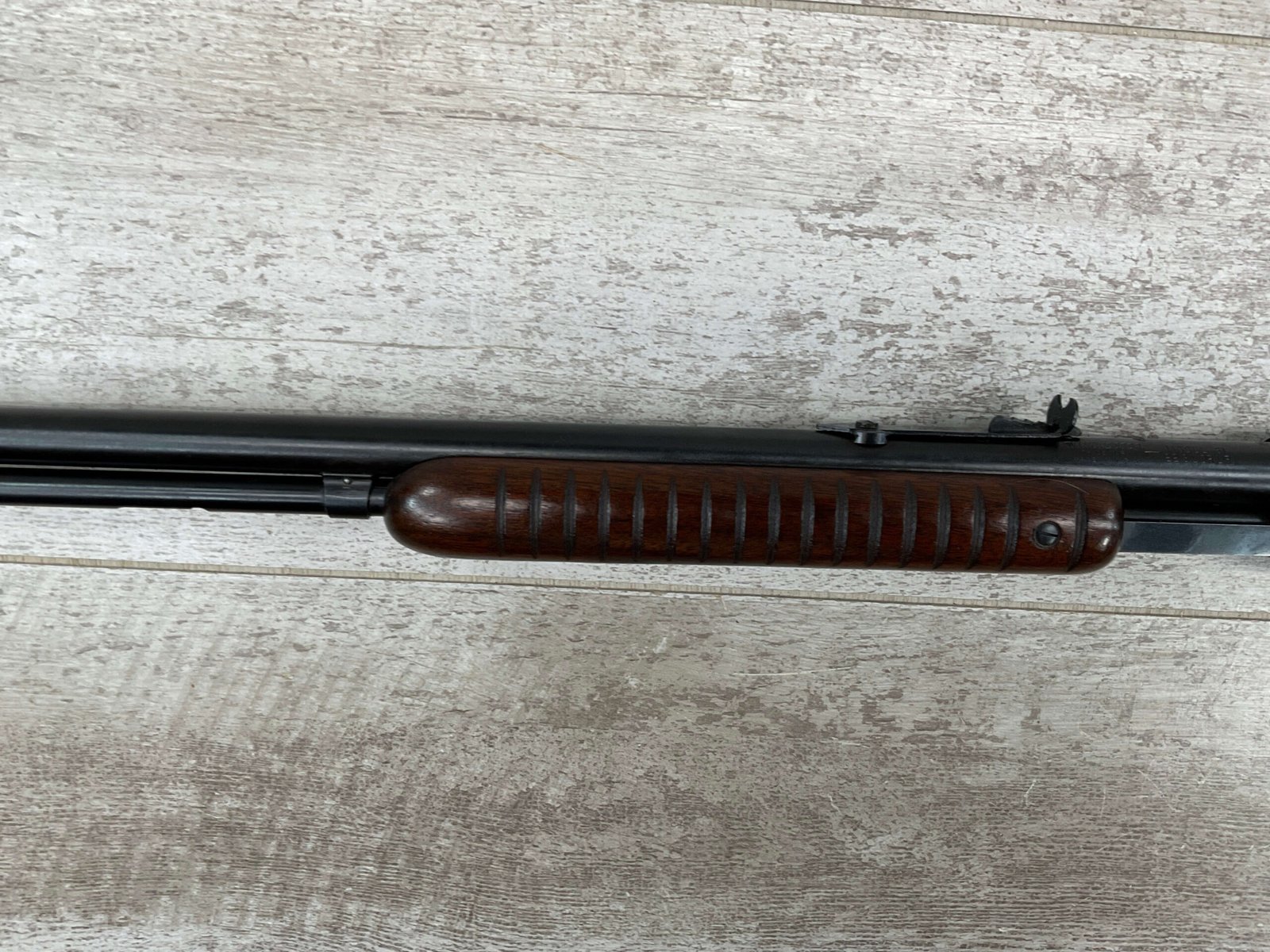 WINCHESTER MODEL 61 .22 CALIBER PUMP ACTION RIFLE, 1958 MFR #262683 98% ORIGINAL BLUE, VERY LIGHT PIN PRICKING ON LEFT SIDE OF RECEIVER, EXC 24″ BARREL, EXC BRIGHT BORE & RIFLING (9.5/10), EXC WALNUT STOCK W/VIRTUALLY NO HANDLING MARKS & ONE MINOR NICK ON LEFT SIDE OF FOREGRIP, VERY SMOOTH ACTION, THIS ONE WON’T LAST LONG!