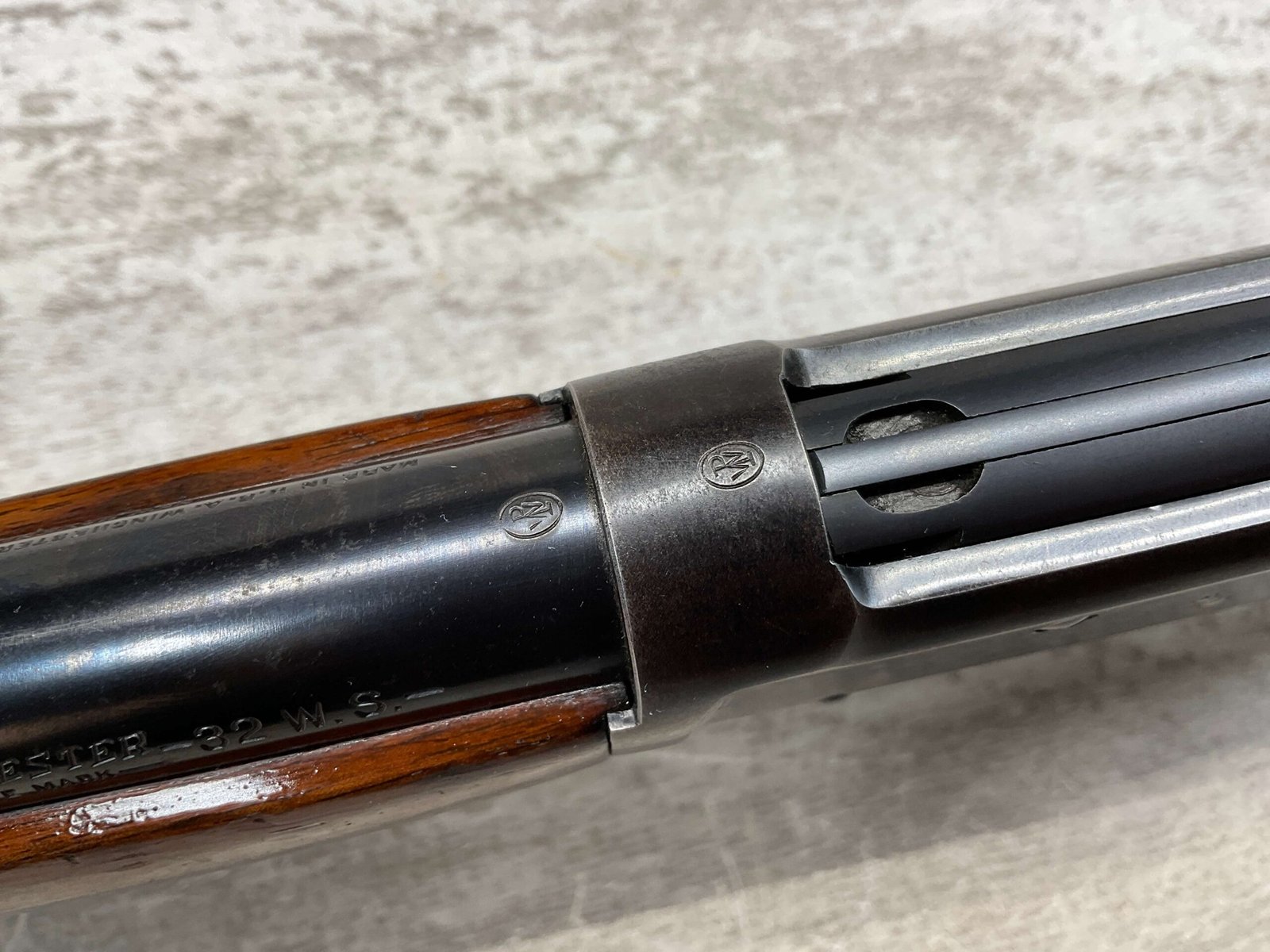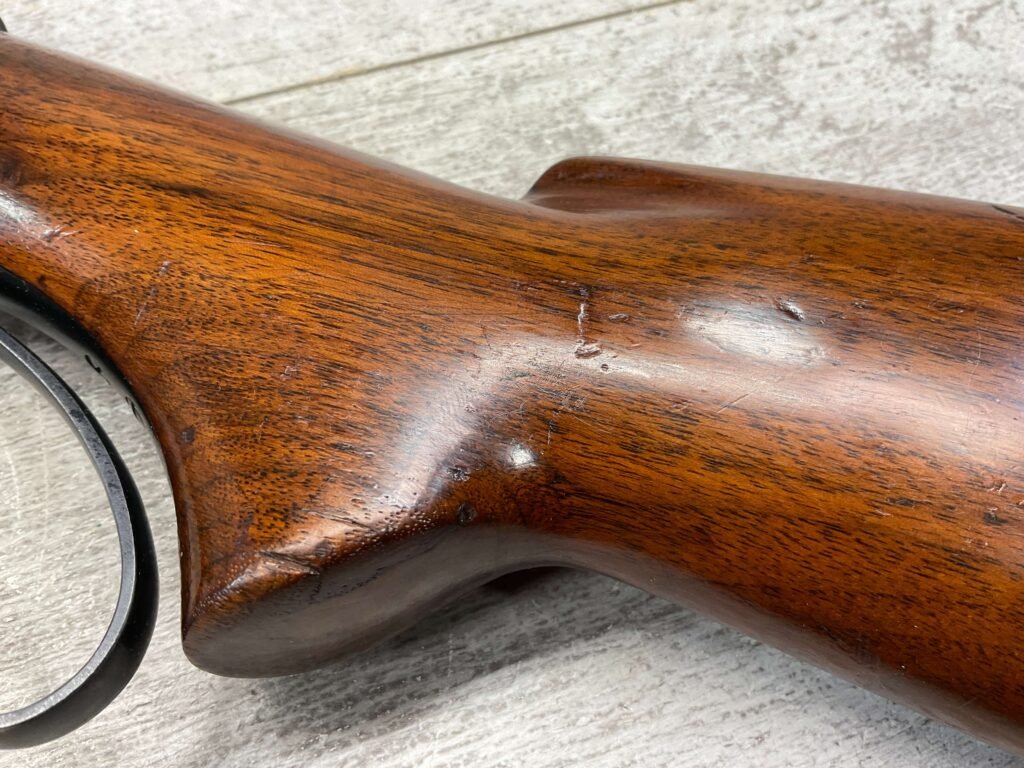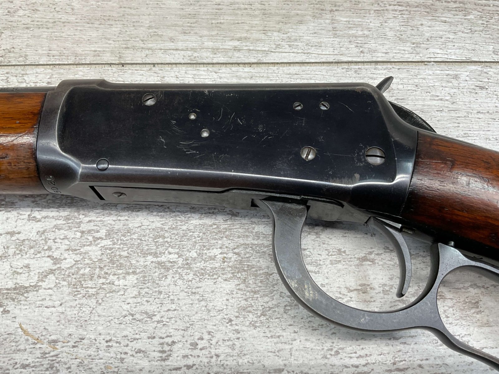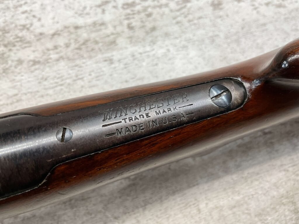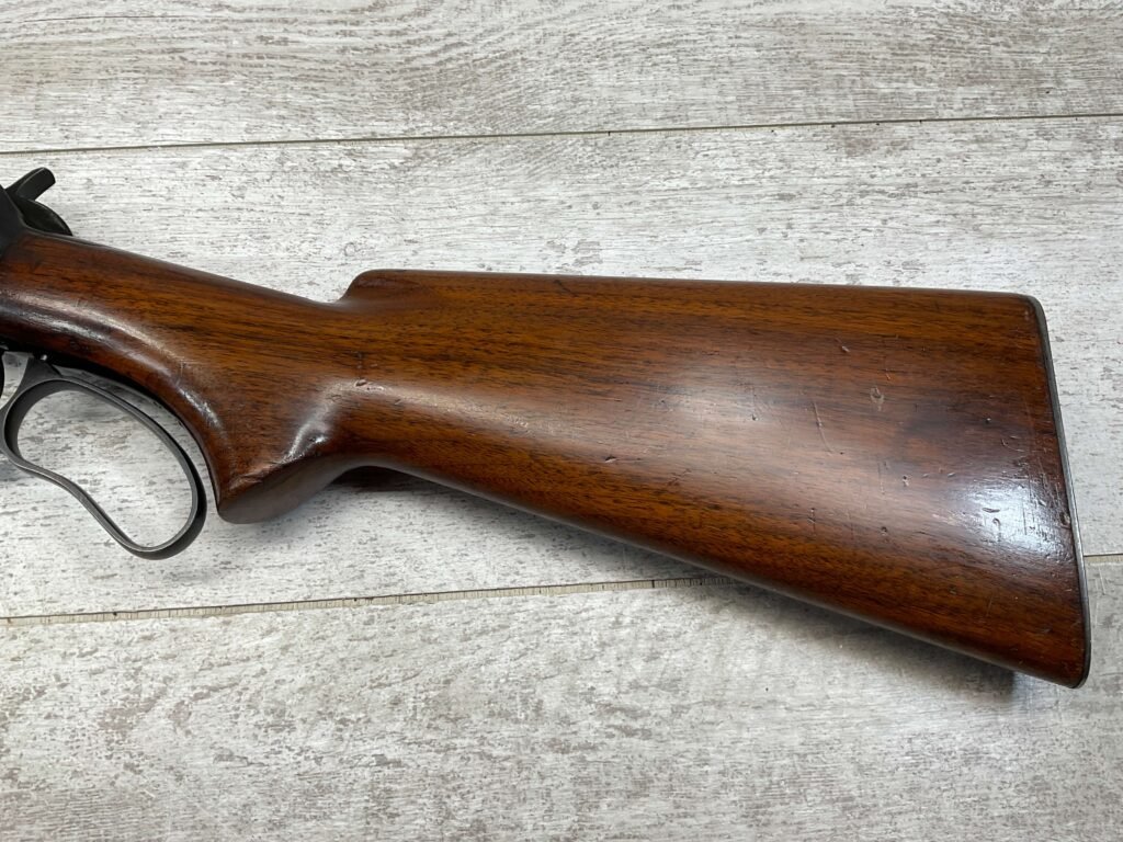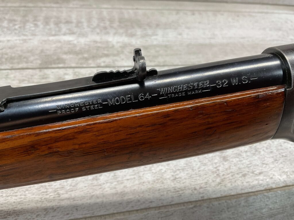WINCHESTER MODEL 64 32 WS LEVER ACTION RIFLE, 1936 MFR #115025, 24″ ROUND BARREL, 95% ORIGINAL BLUE FINISH W/ LIGHT WEAR ON RECEIVER, EXC WALNUT STOCK W/ PISTOL GRIP & SHOTGUN BUTT STOCK & METAL PLATE, SEMI BUCKHORN REAR SIGHT & BLADE FRONT, 1/2 MAGAZINE TUBE, TYPICAL SMOOTH LEVER ACTION, C&R FFL TRANSFER