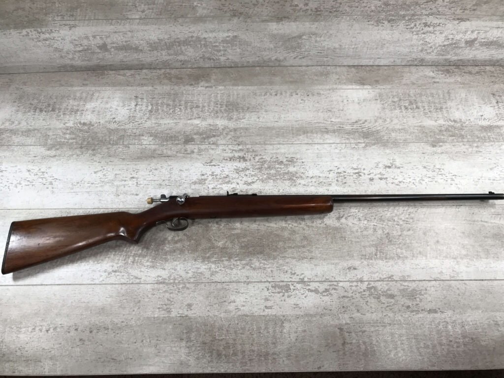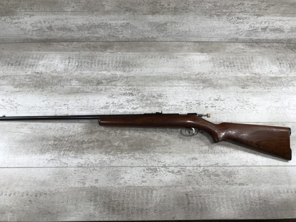 WINCHESTER MODEL 67-22 SHORT SINGLE SHOT BOLT ACTION RIFLE #NSN, 27″BBL, GOOD WOOD W/MINOR HANDLING MARKS, LIGHT FRECKLING/PETINA THROUGHOUT, GOOD BORE W/STRONG RIFLING, “MNO 2718 052 28 JV” ELECTRO PENCILED LEFT RECEIVER BY BOLT (SEE PICS), PLASTIC BUTT PLATE CRACKED AND MISSING SMALL PIECE, FIRING PIN COCKER MISSING, 75% OVERALL