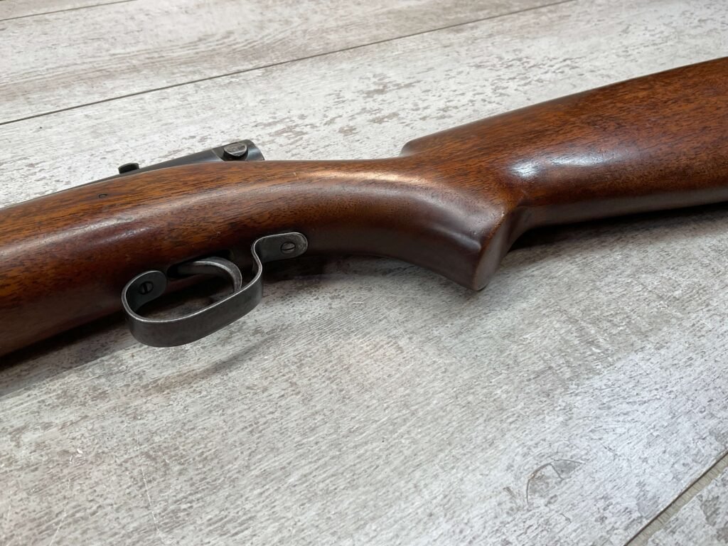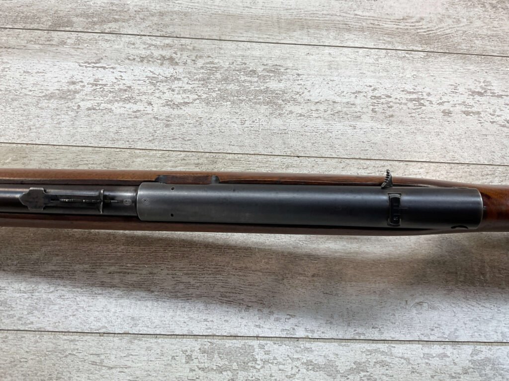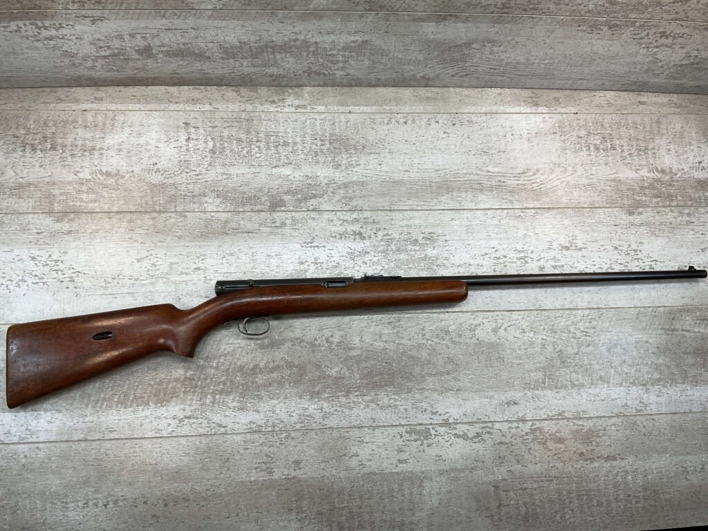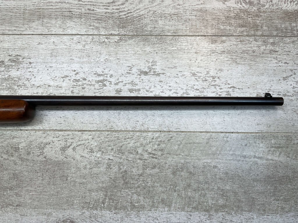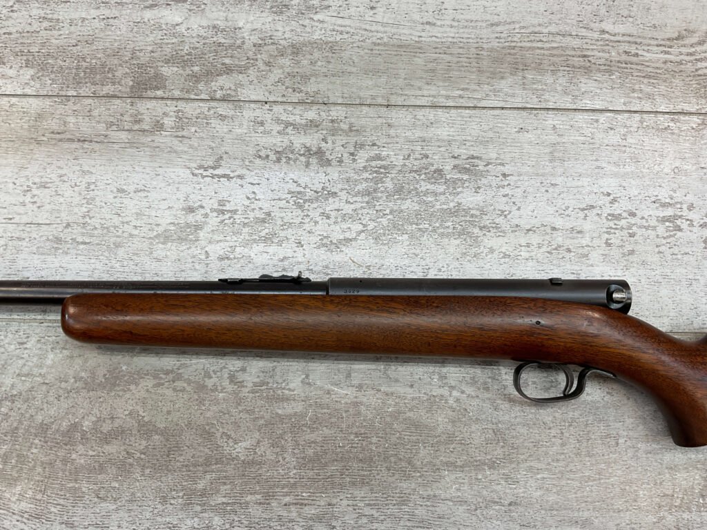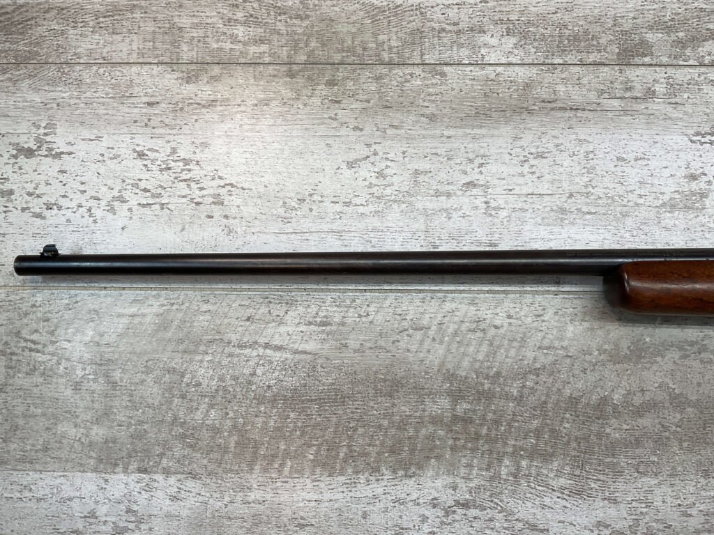 WINCHESTER MODEL 74 .22 SHORT SEMI AUTO RIFLE #3429, 24″ BBL, TUBULAR MAGAZINE IN STOCK (HOLDS 20 SHORTS), POP-OUT BOLT ASSEMBLY, 1939 MFR (FIRST YEAR PRODUCTION, VERY EARLY), VG BLUE W/RECEIVER TURNING GREY PATINA & BBL TURNING BROWN PATINA W/AREAS OF WEAR, EXC BORE & RIFLING, VG WALNUT STOCK W/DINGS & IMPRESSIONS FROM AGE/USE, CRISP TRIGGER & SMOOTH BOLT ACTION.  ONE HECK OF A GREAT PLINKING GUN!!