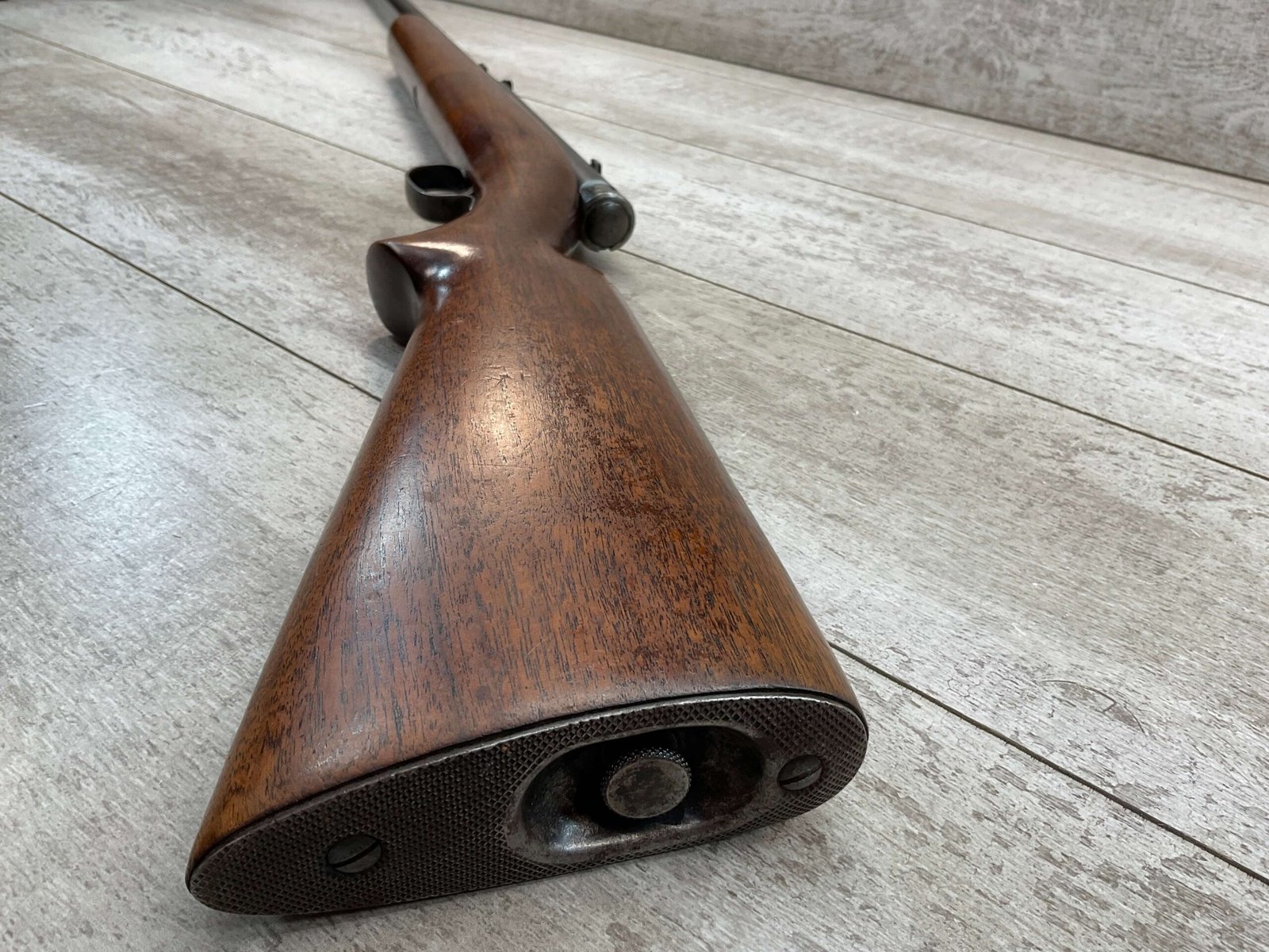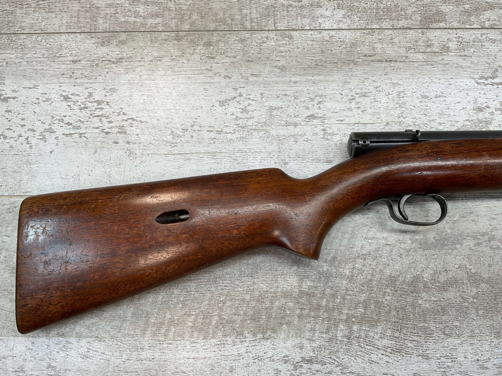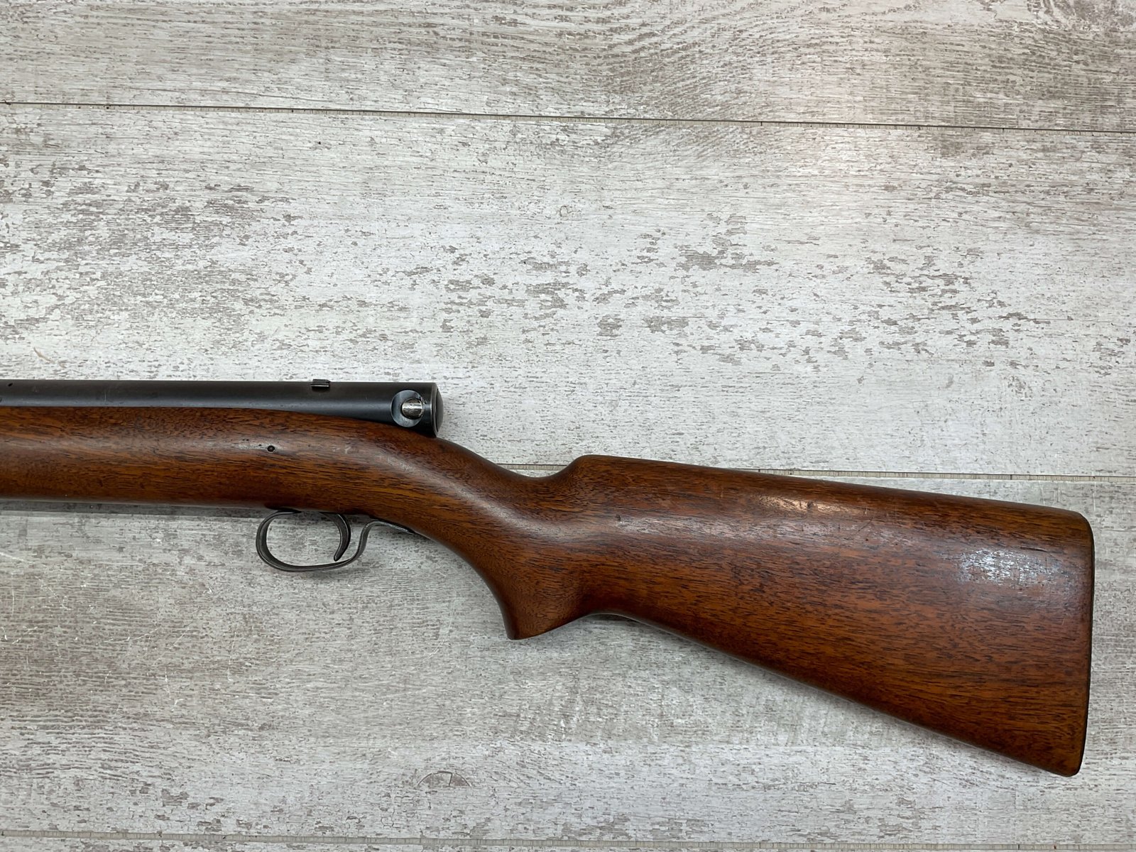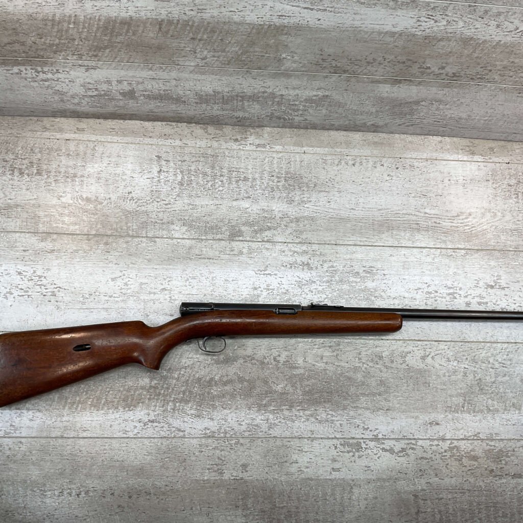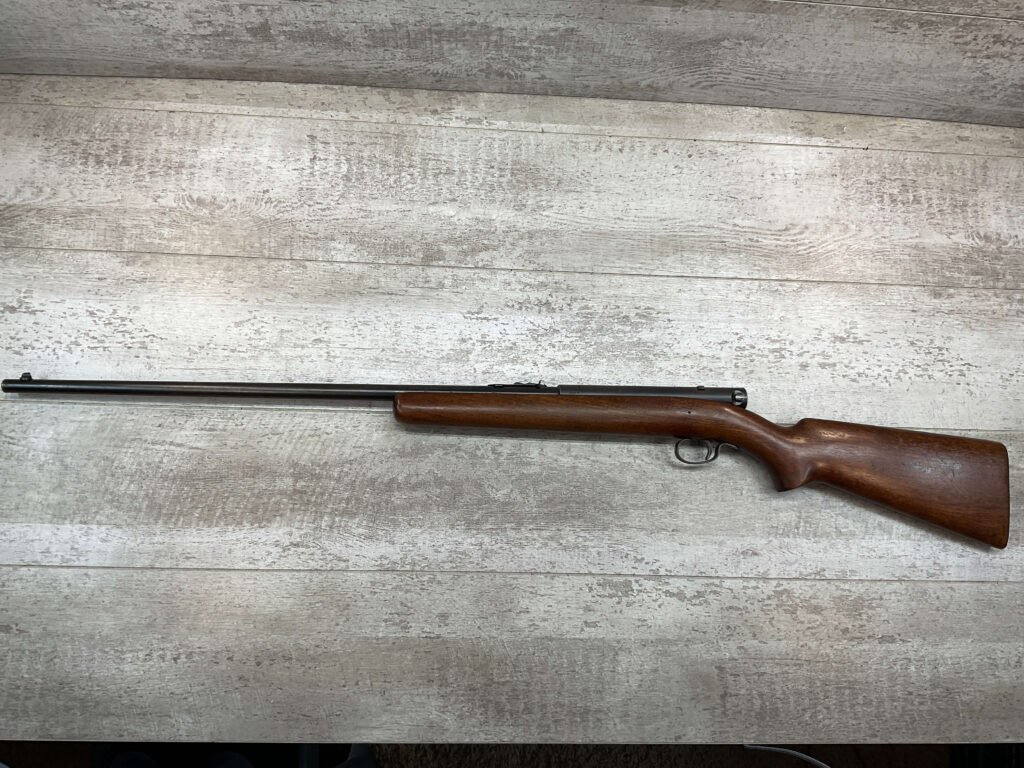 WINCHESTER MODEL 74 .22 SHORT SEMI AUTO RIFLE #3429, 24″ BBL, TUBULAR MAGAZINE IN STOCK (HOLDS 20 SHORTS), POP-OUT BOLT ASSEMBLY, 1939 MFR (FIRST YEAR PRODUCTION, VERY EARLY), VG BLUE W/RECEIVER TURNING GREY PATINA & BBL TURNING BROWN PATINA W/AREAS OF WEAR, EXC BORE & RIFLING, VG WALNUT STOCK W/DINGS & IMPRESSIONS FROM AGE/USE, CRISP TRIGGER & SMOOTH BOLT ACTION.  ONE HECK OF A GREAT PLINKING GUN!!