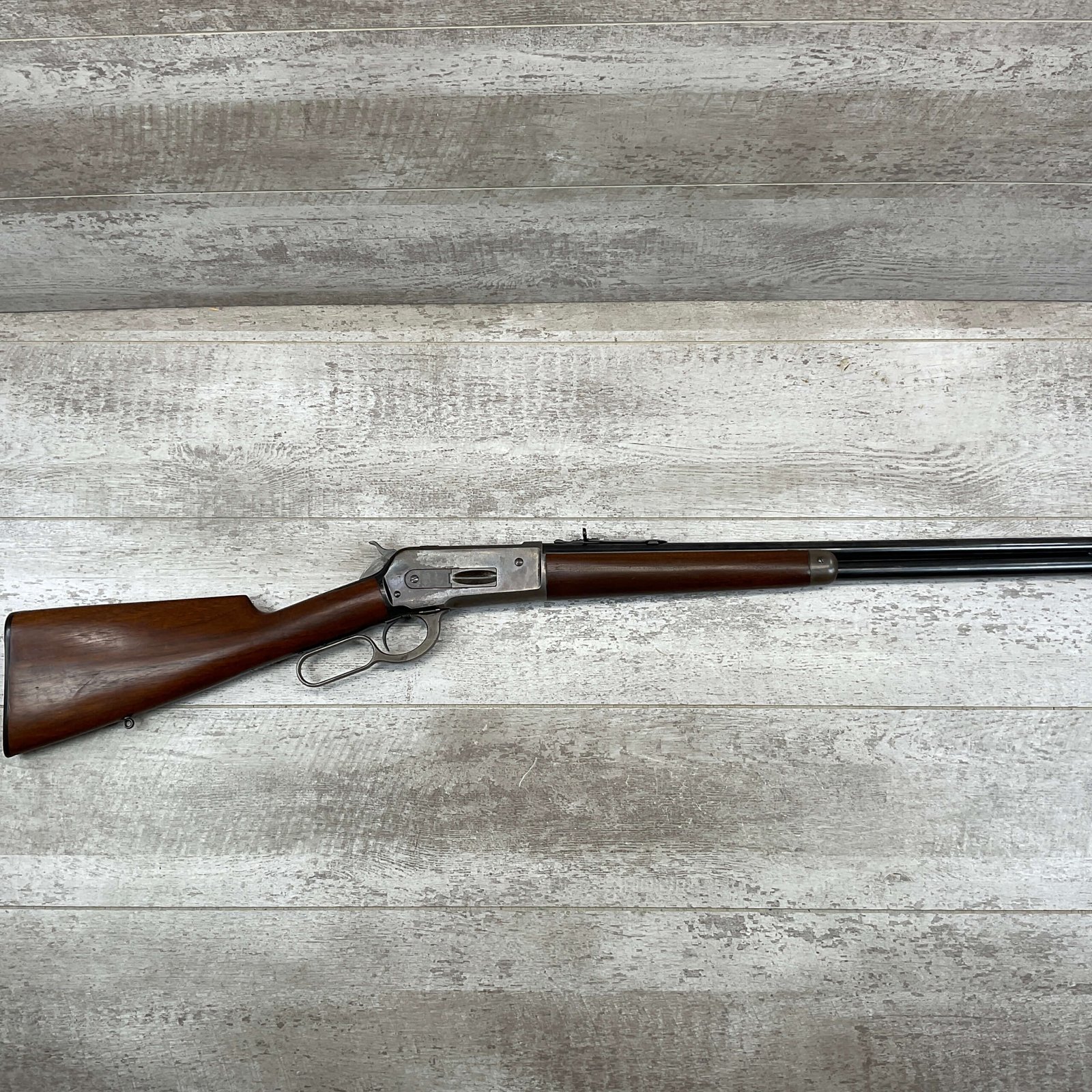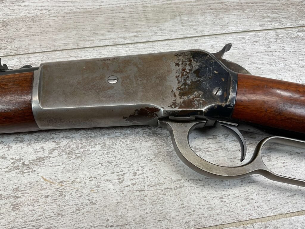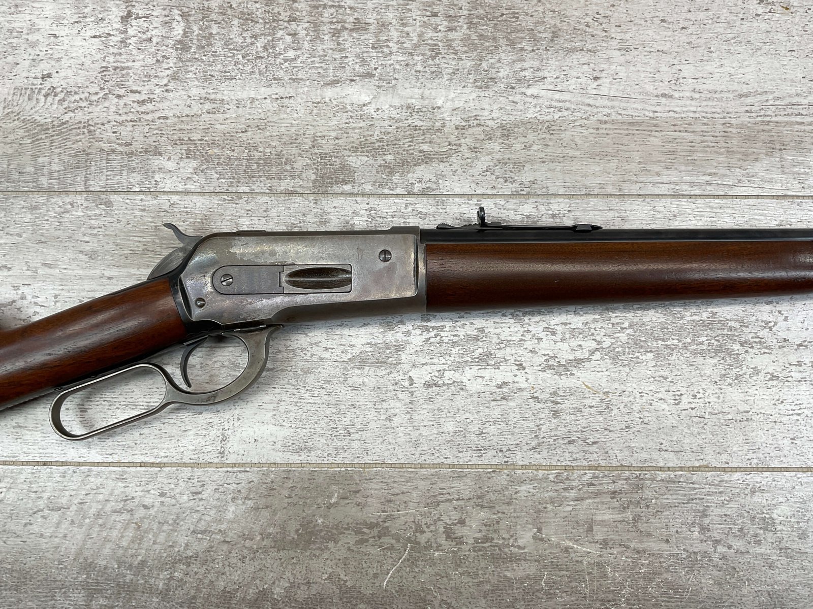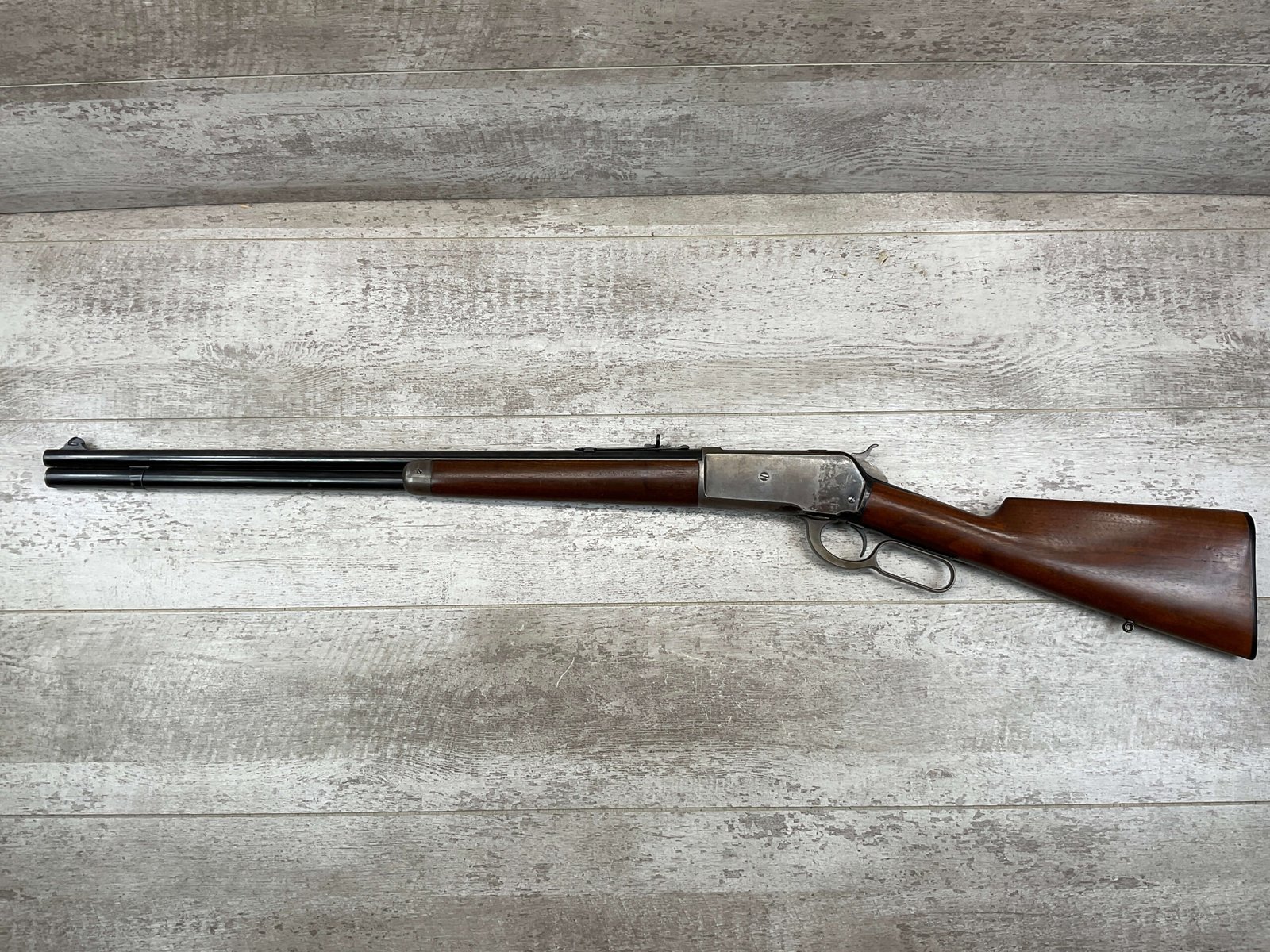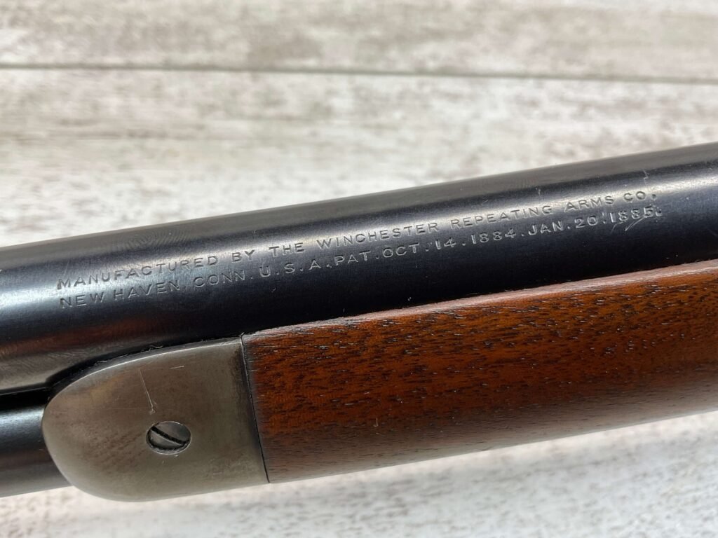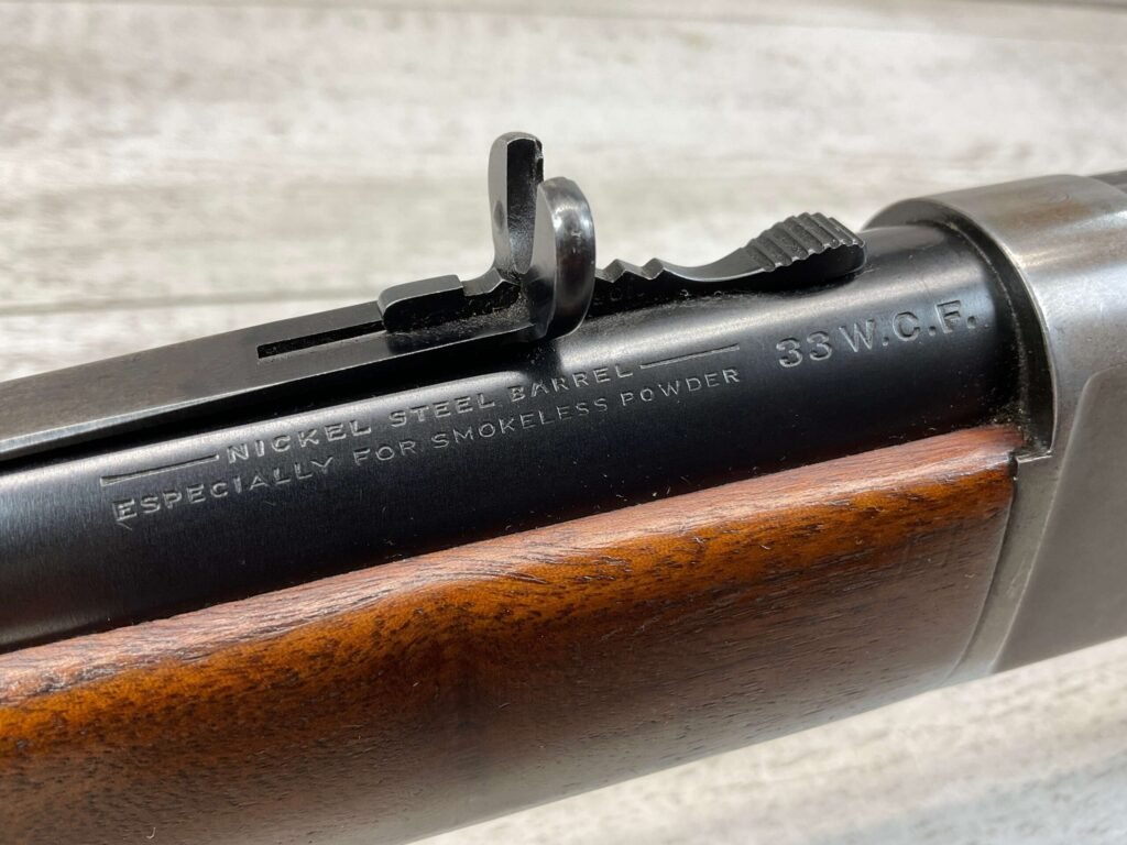 WINCHESTER MODEL 86 33WCF LEVER ACTION RIFLE, 1910 MFR #149323A, 24″ ROUND BARREL, EXC BORE & RIFLING, EXC WALNUT STOCK W/ SHOTGUN BUTT & PLASTIC BUTT PLATE, 90%+ ORIGINAL BLUE FINISH ON BARREL & RECEIVED RETAINS BOUT 15-20% BLUE FINISH, REAR SLING SWIVEL, FULL LENGTH MAGAZINE TUBE, FRONT BLADE & REAR RAMP SIGHT, VERY NICE OVERALL