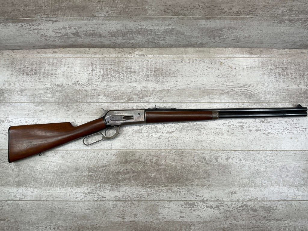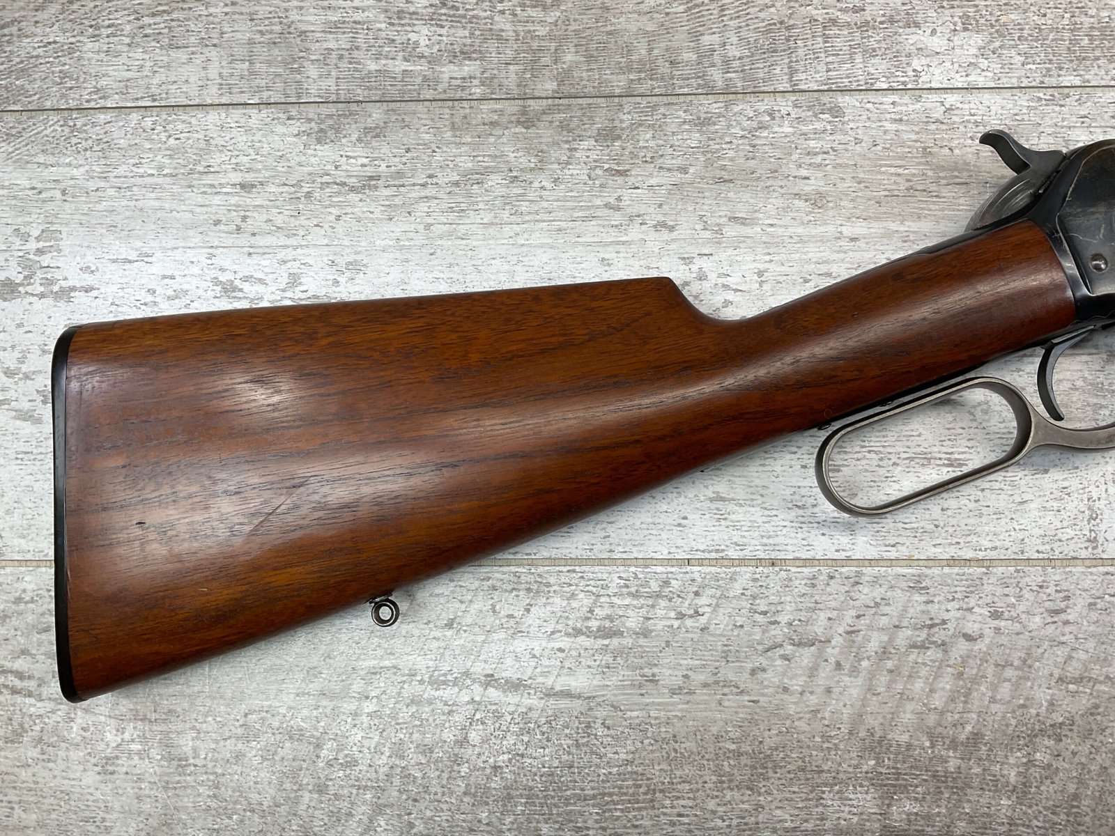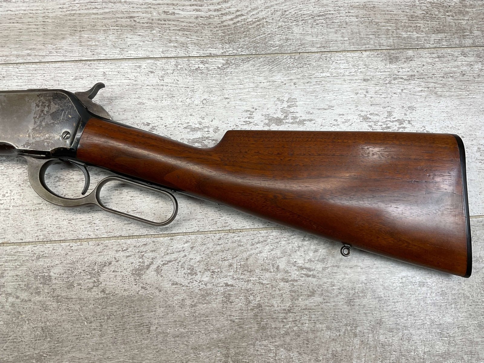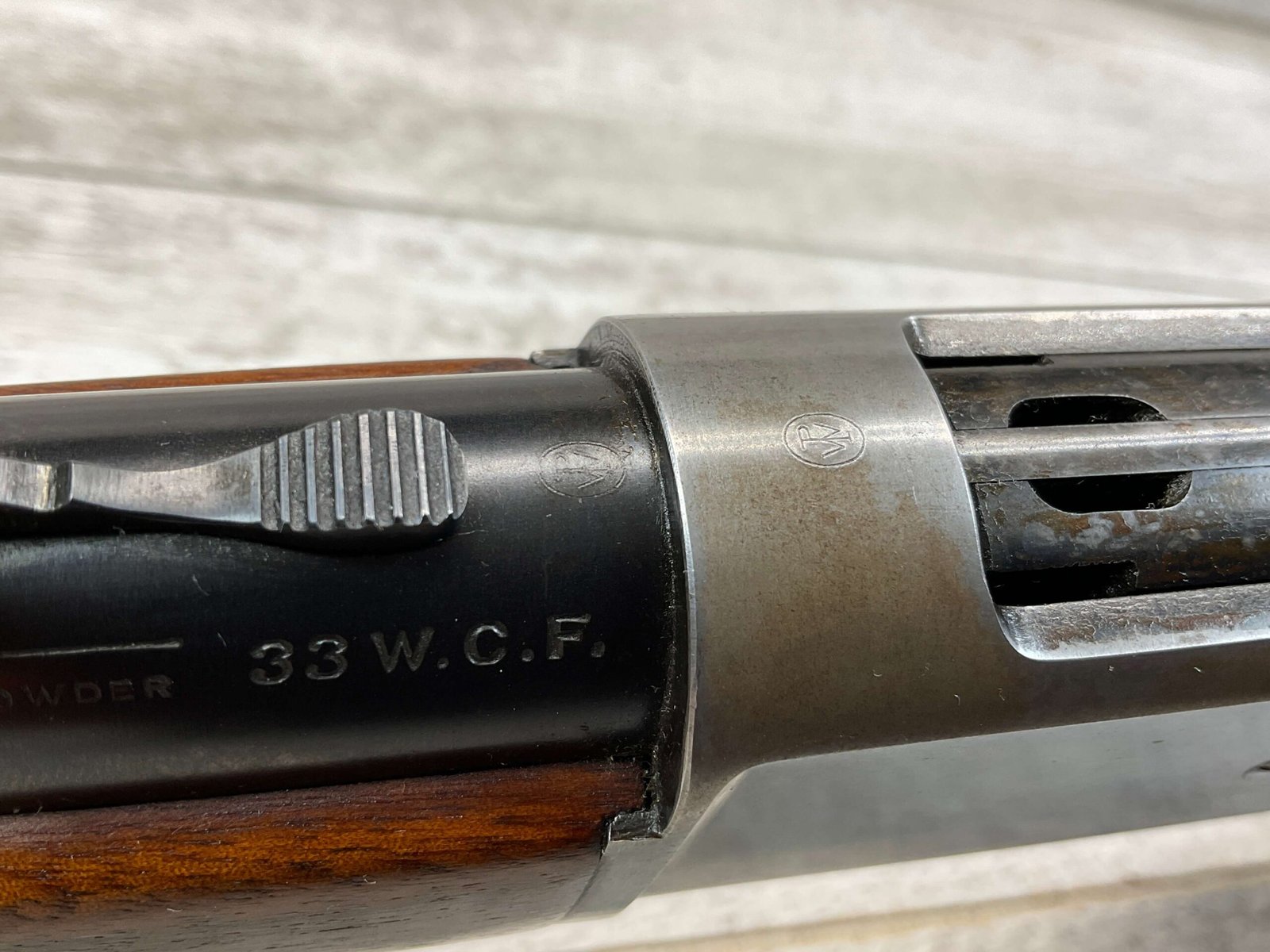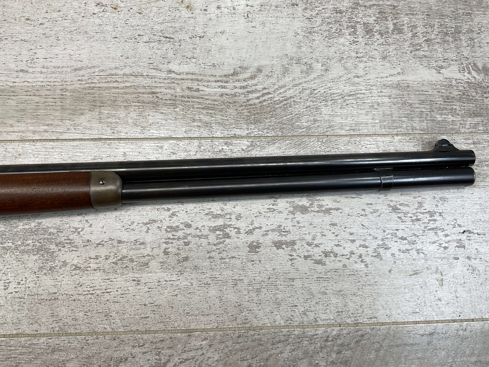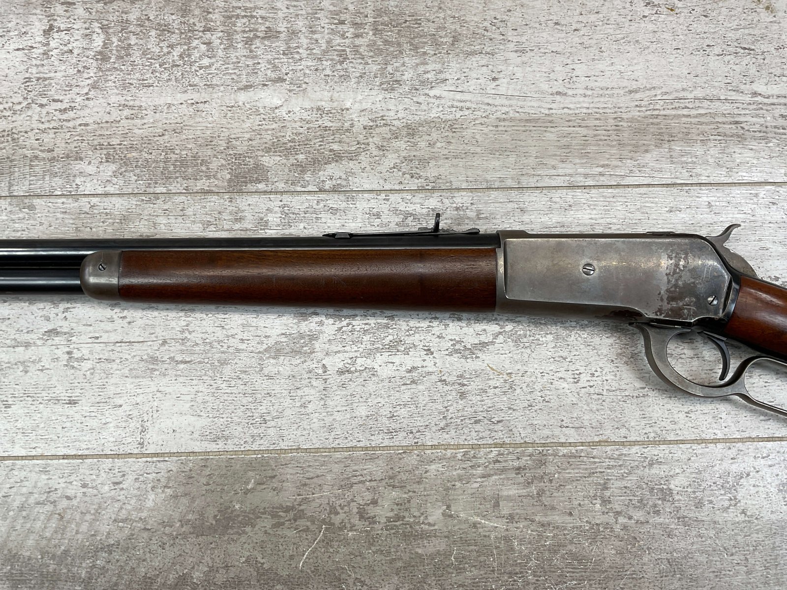WINCHESTER MODEL 86 33WCF LEVER ACTION RIFLE, 1910 MFR #149323A, 24″ ROUND BARREL, EXC BORE & RIFLING, EXC WALNUT STOCK W/ SHOTGUN BUTT & PLASTIC BUTT PLATE, 90%+ ORIGINAL BLUE FINISH ON BARREL & RECEIVED RETAINS BOUT 15-20% BLUE FINISH, REAR SLING SWIVEL, FULL LENGTH MAGAZINE TUBE, FRONT BLADE & REAR RAMP SIGHT, VERY NICE OVERALL