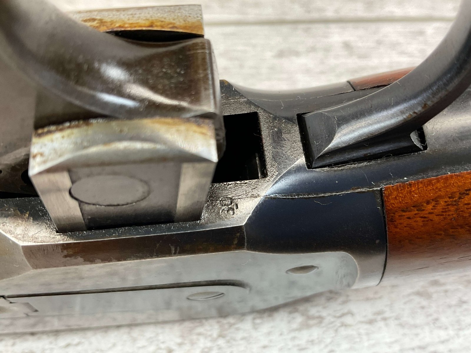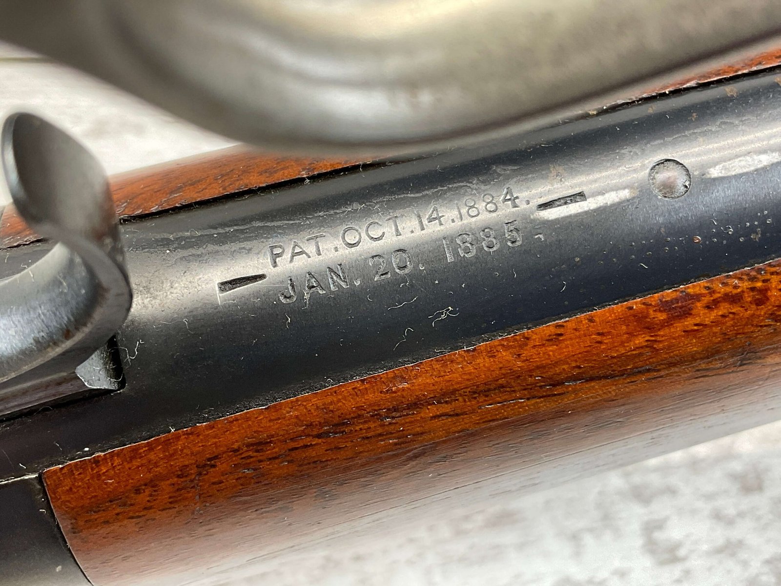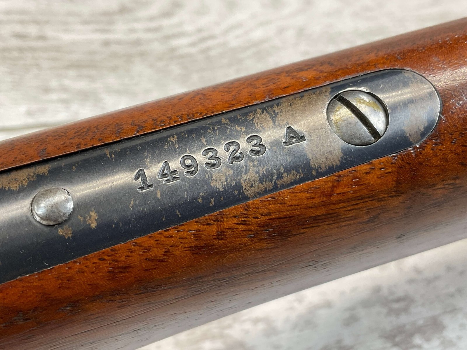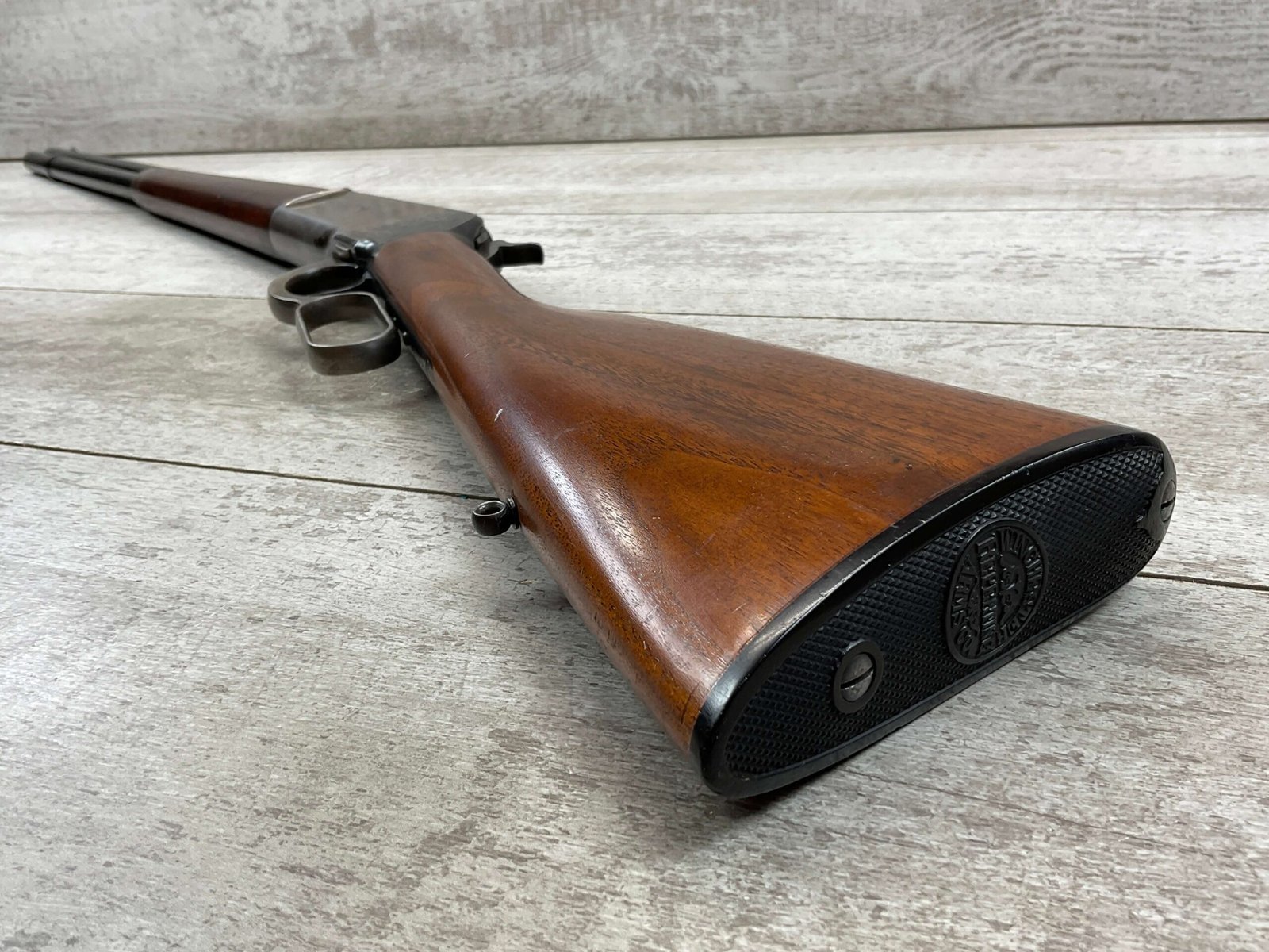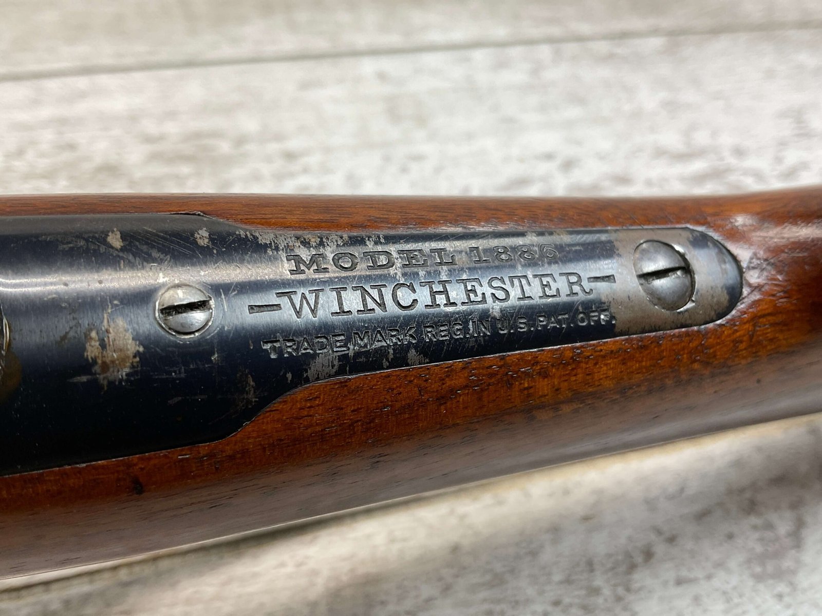 WINCHESTER MODEL 86 33WCF LEVER ACTION RIFLE, 1910 MFR #149323A, 24″ ROUND BARREL, EXC BORE & RIFLING, EXC WALNUT STOCK W/ SHOTGUN BUTT & PLASTIC BUTT PLATE, 90%+ ORIGINAL BLUE FINISH ON BARREL & RECEIVED RETAINS BOUT 15-20% BLUE FINISH, REAR SLING SWIVEL, FULL LENGTH MAGAZINE TUBE, FRONT BLADE & REAR RAMP SIGHT, VERY NICE OVERALL