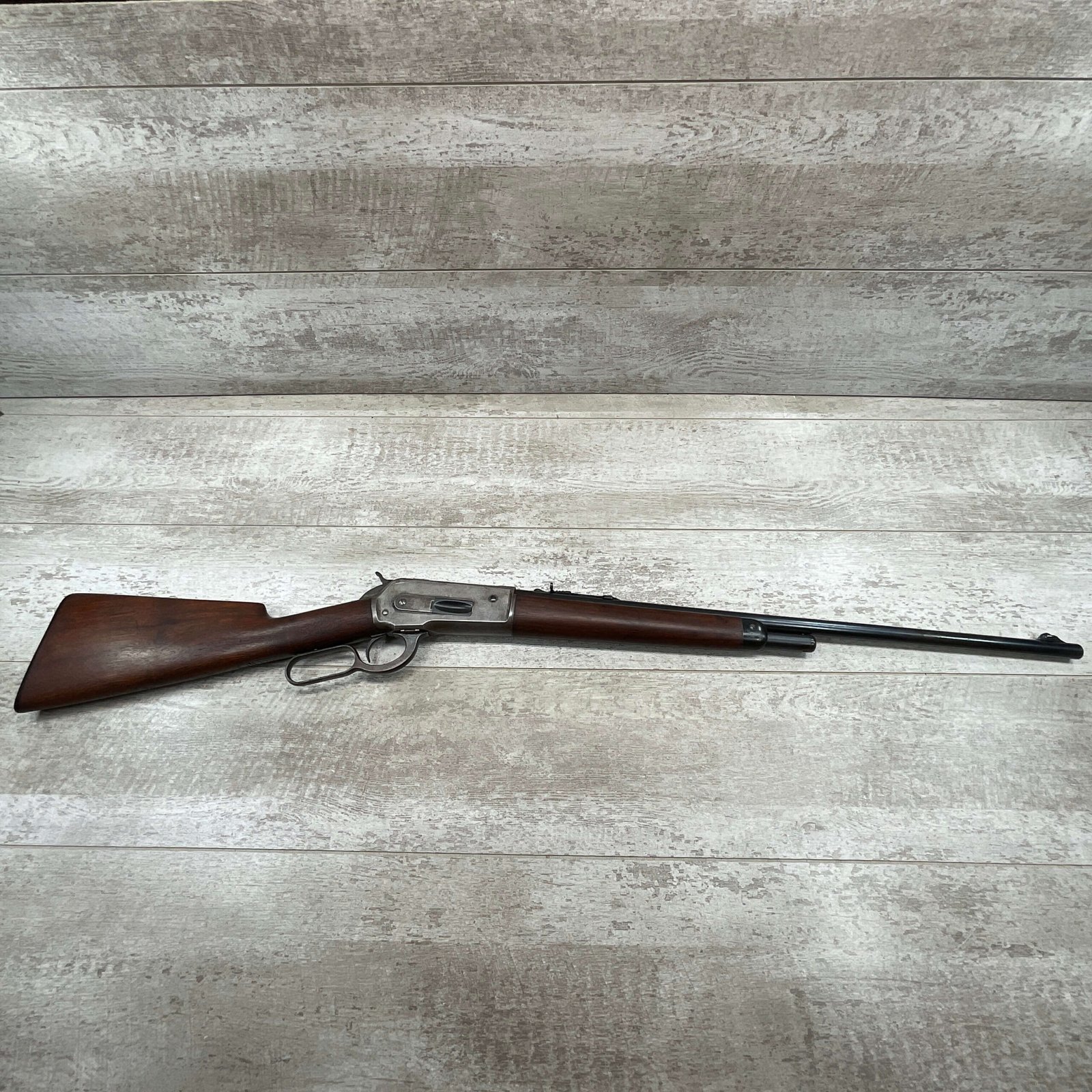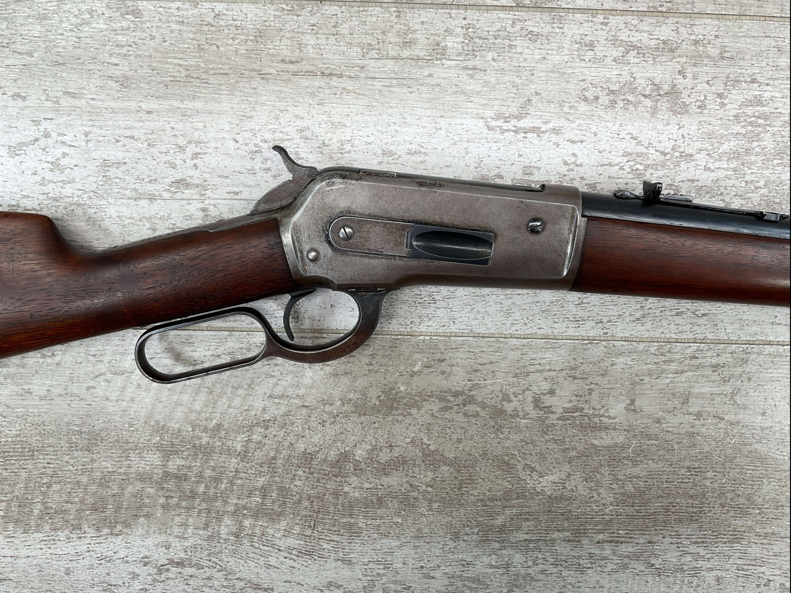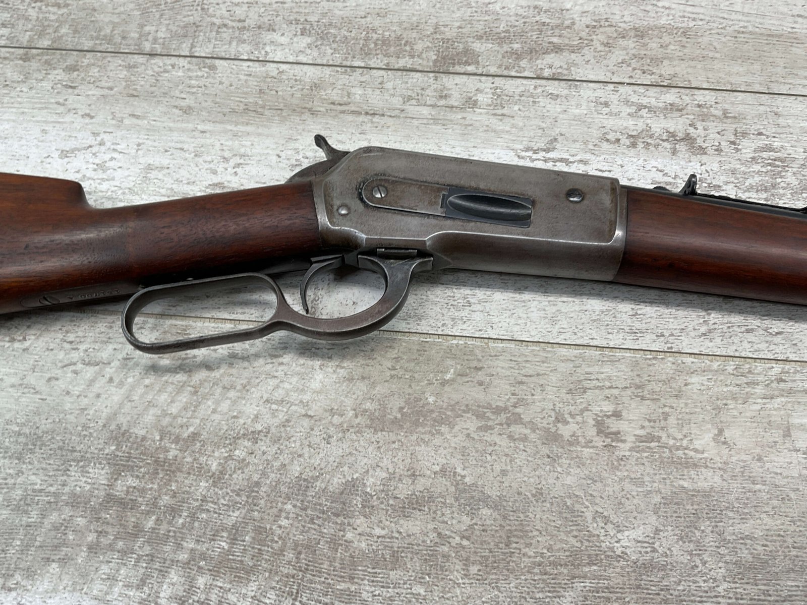 WINCHESTER MODEL 86 .33WCF LEVER ACTION RIFLE, 1911 MFR #151700A, 24″ NICKEL STEEL BARREL, GOOD BORE & RIFLING W/FROSTING IN THE GROOVES, RAISED BLADE FRONT SIGHT, ADJ LADDER REAR SIGHT, EXC WALNUT STOCK, RECEIVER HAS LOST ALL BLUE, BARREL HAS SOME TOUCH UP DONE NEAR FRONT SIGHT AS DID THE END OF THE MAGAZINE TUBE & FRONT CAP, SHOTGUN BUTT PLATE, SMOOTH ACTION