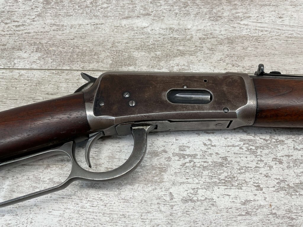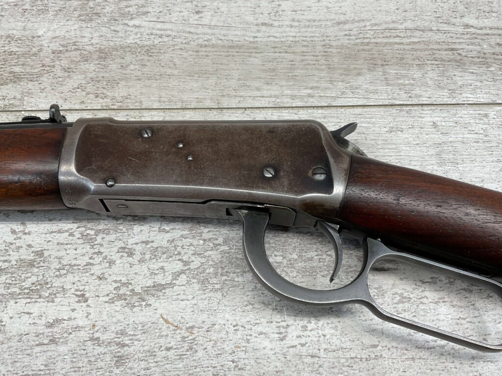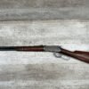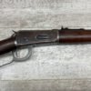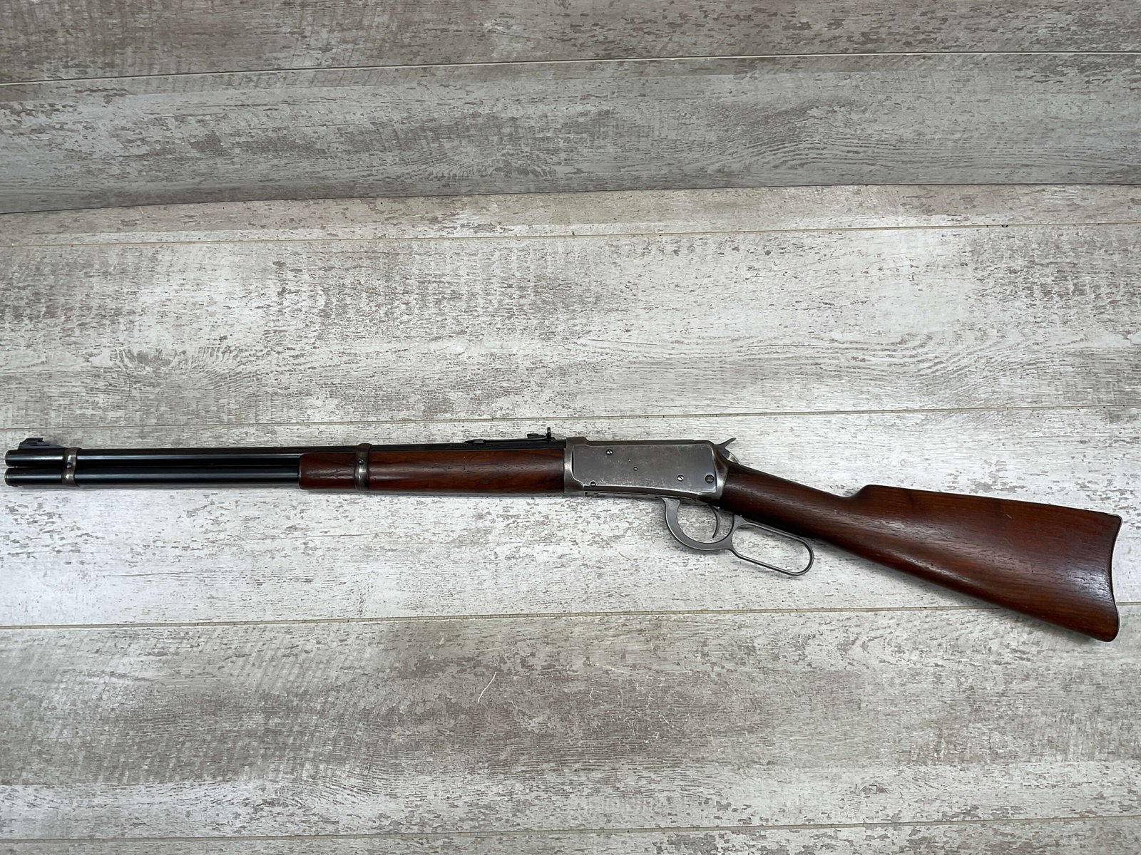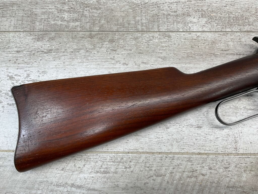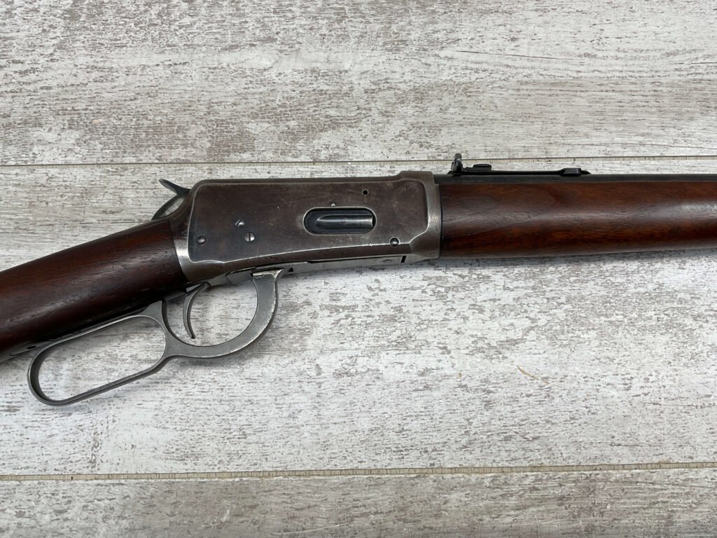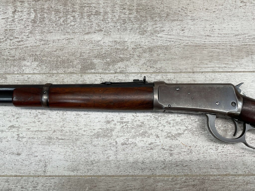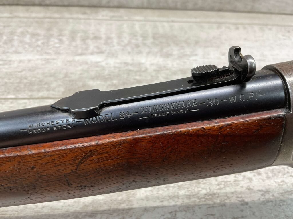 WINCHESTER MODEL 94 30 WCF CARBINE LEVER ACTION RIFLE, 1937 MFR #1125632, 20″ ROUND BARREL, EXC BORE & RIFLING, 80% ORIGINAL BLUE FINISH W/ RECEIVER TURNING BROWN PATINA, FULL LENGTH MAGAZINE TUBE, VG WALNUT STOCK W/ CRESCENT BUTTSTOCK & METAL PLATE, FRONT BLADE & REAR SPORTING ELEVATOR SIGHTS, WRONG PLUG SCREW IN TANG OTHERWISE ALL ORIGINAL, VERY NICE!!