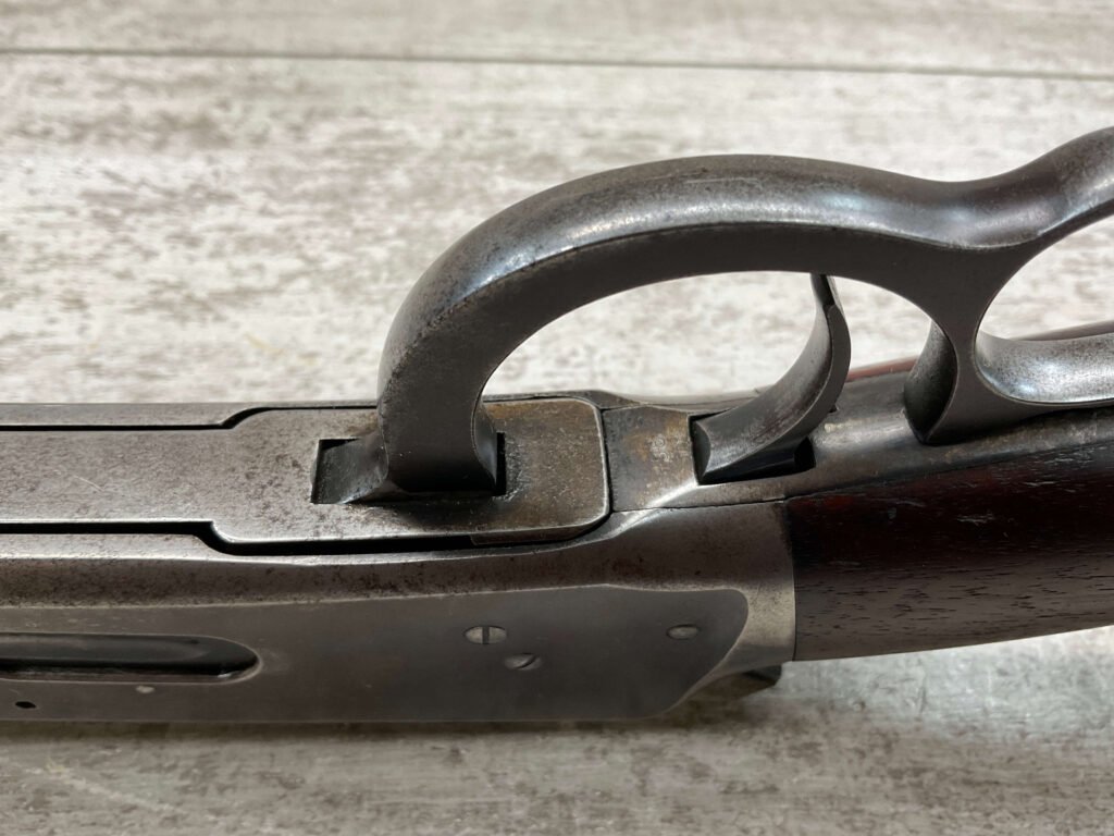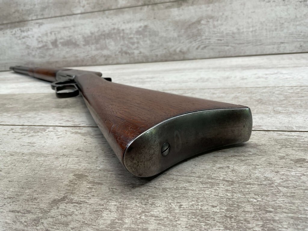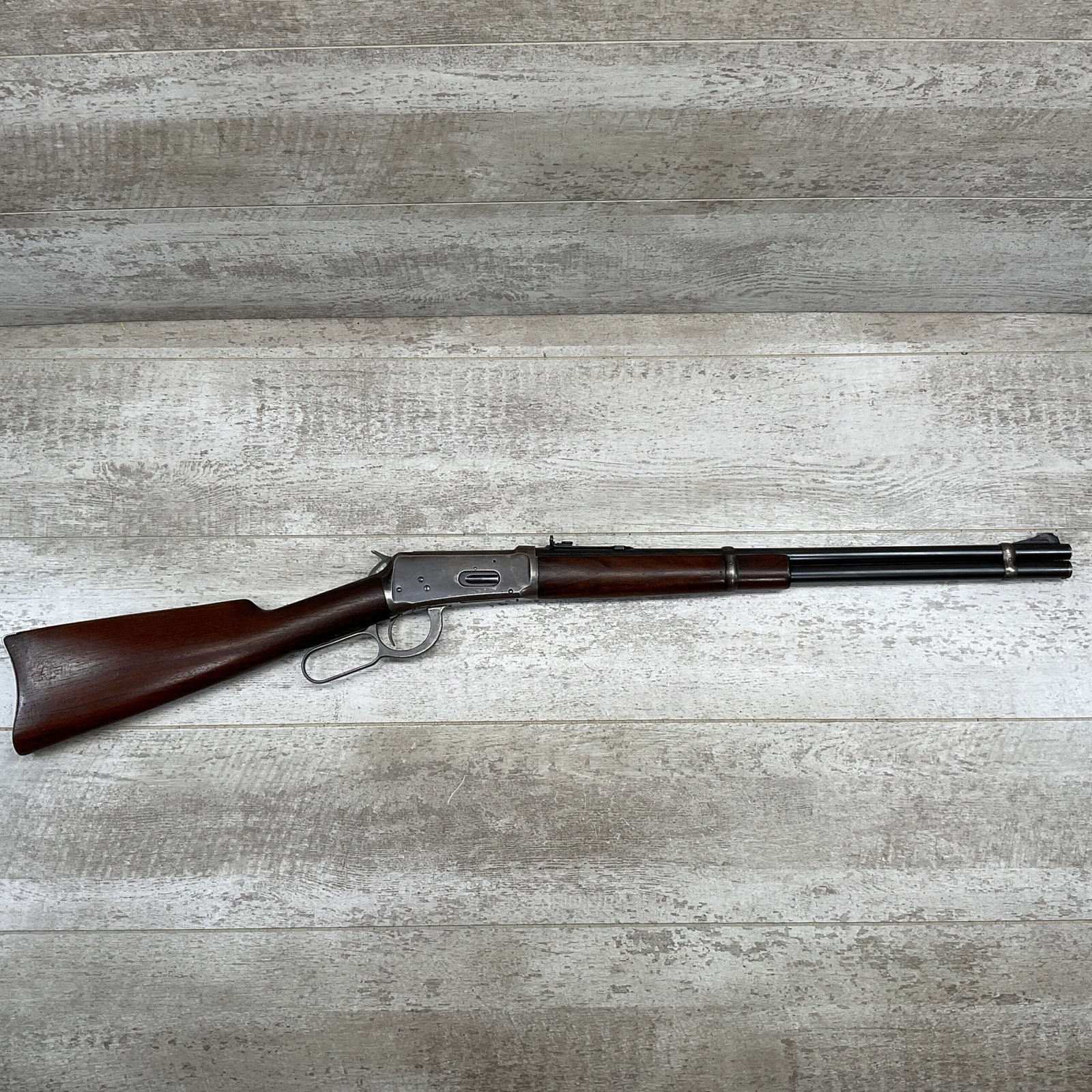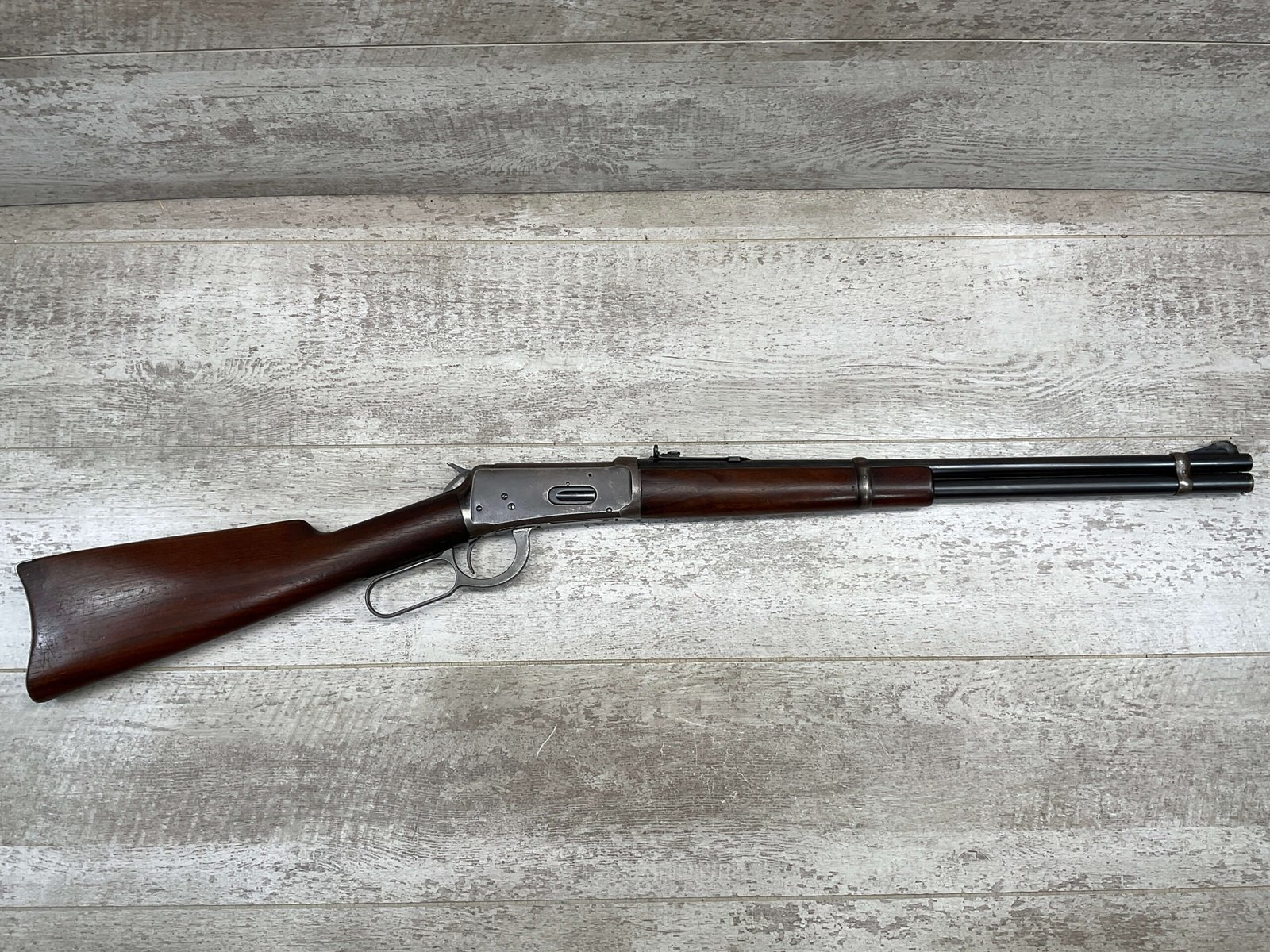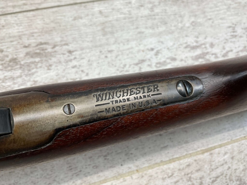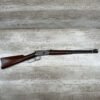 WINCHESTER MODEL 94 30 WCF CARBINE LEVER ACTION RIFLE, 1937 MFR #1125632, 20″ ROUND BARREL, EXC BORE & RIFLING, 80% ORIGINAL BLUE FINISH W/ RECEIVER TURNING BROWN PATINA, FULL LENGTH MAGAZINE TUBE, VG WALNUT STOCK W/ CRESCENT BUTTSTOCK & METAL PLATE, FRONT BLADE & REAR SPORTING ELEVATOR SIGHTS, WRONG PLUG SCREW IN TANG OTHERWISE ALL ORIGINAL, VERY NICE!!