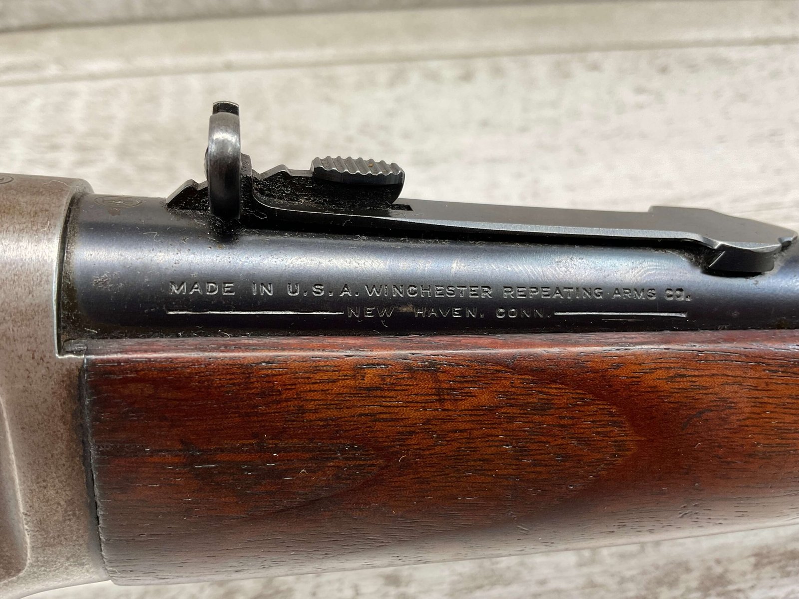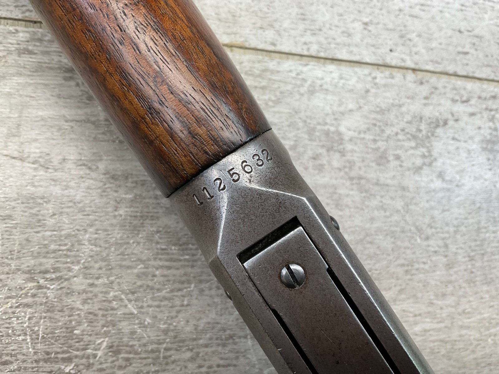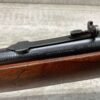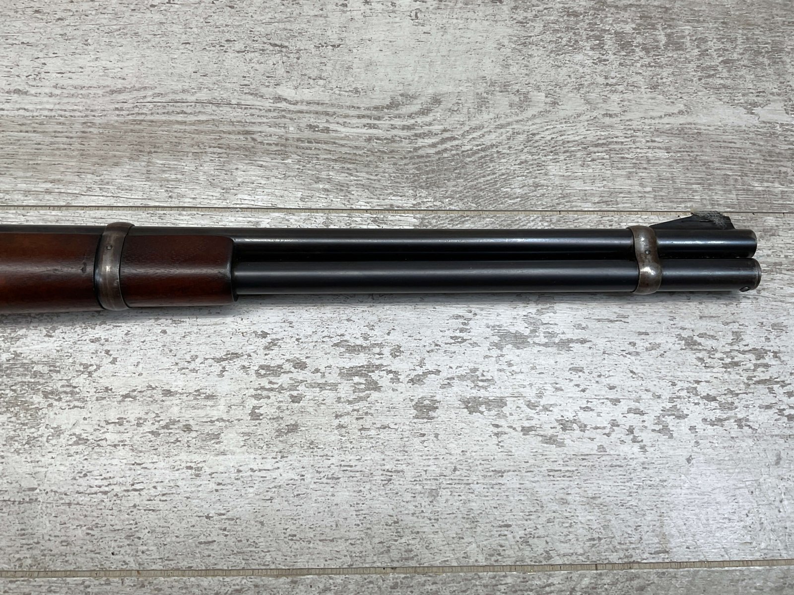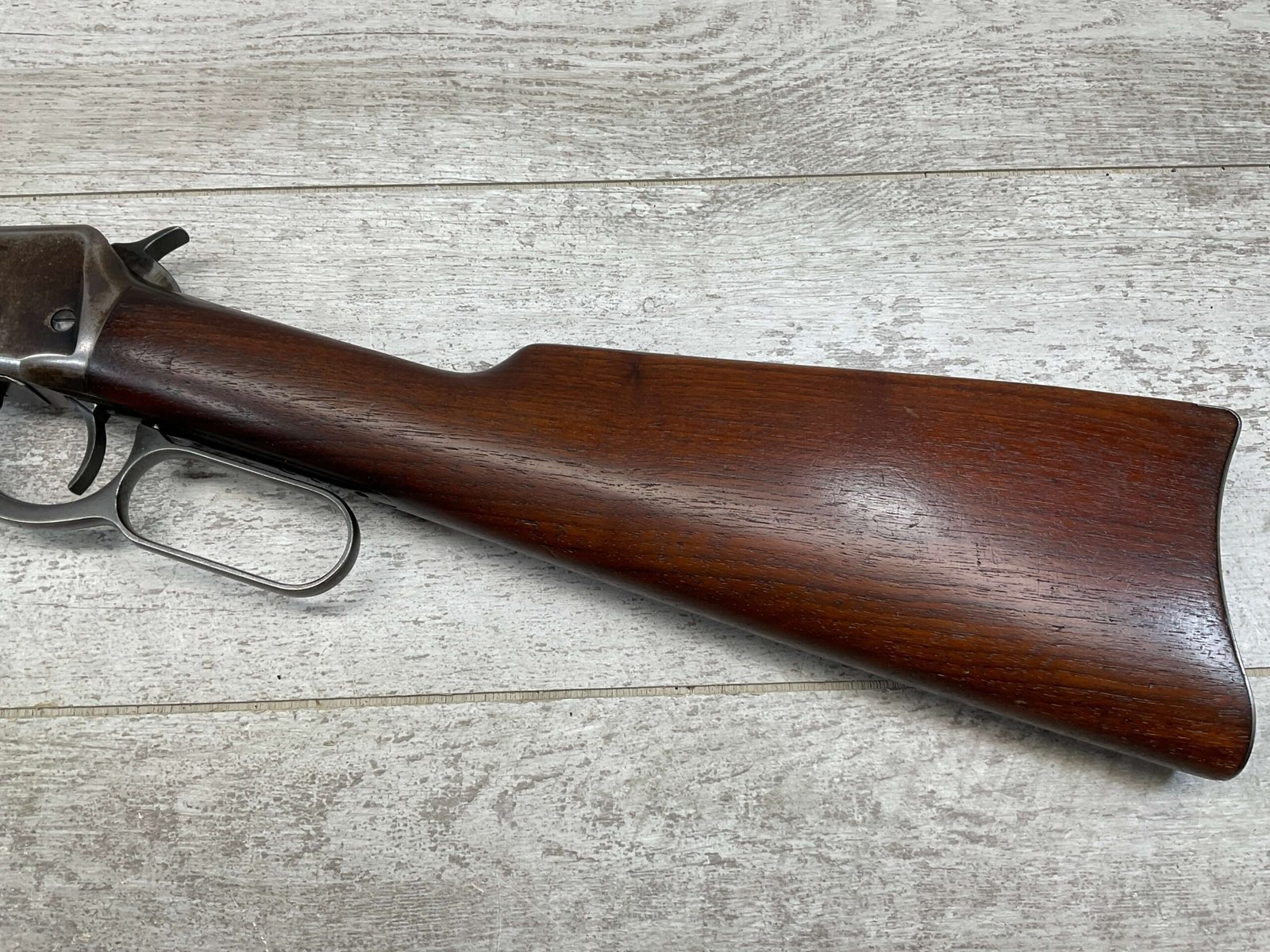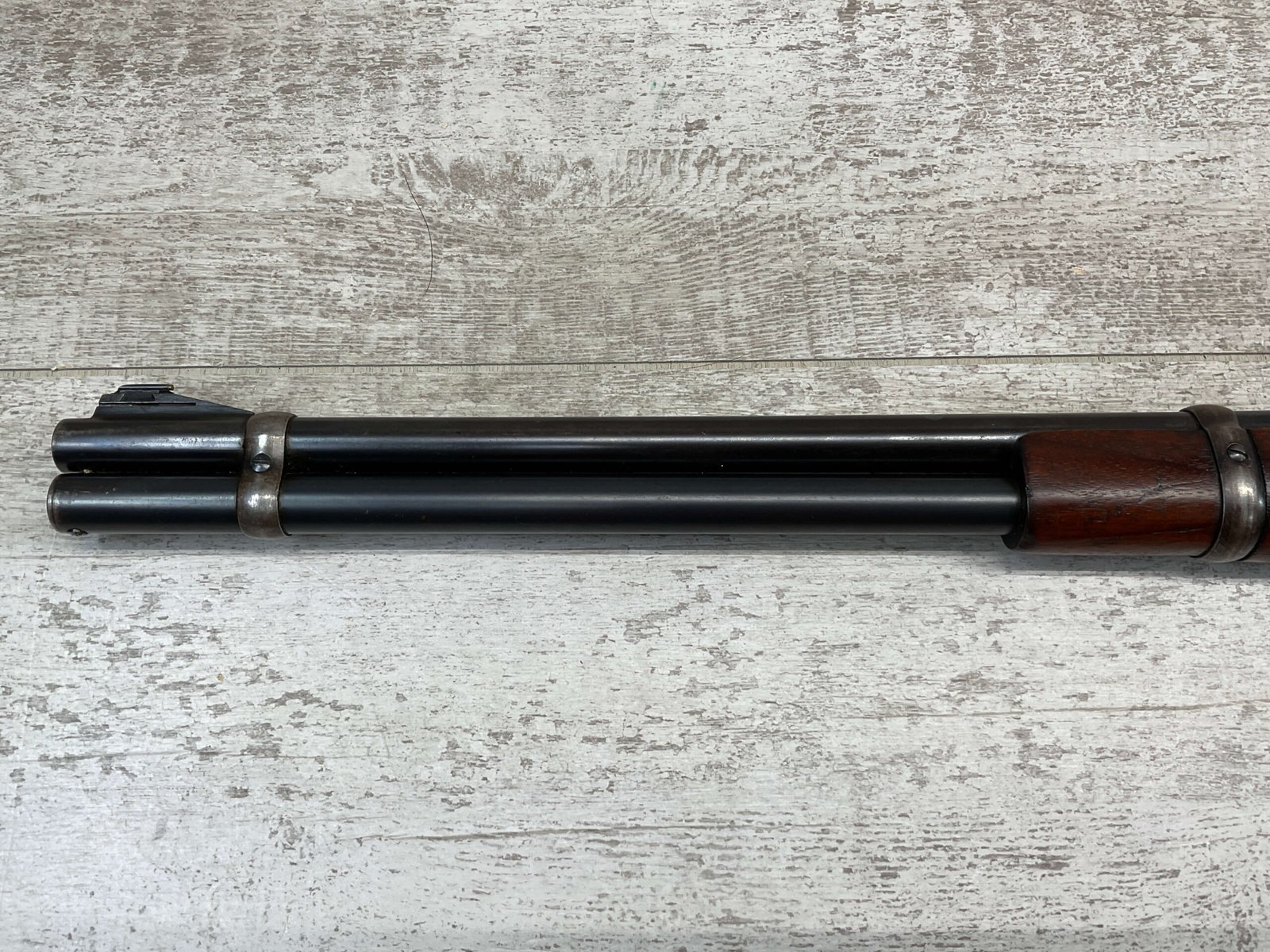 WINCHESTER MODEL 94 30 WCF CARBINE LEVER ACTION RIFLE, 1937 MFR #1125632, 20″ ROUND BARREL, EXC BORE & RIFLING, 80% ORIGINAL BLUE FINISH W/ RECEIVER TURNING BROWN PATINA, FULL LENGTH MAGAZINE TUBE, VG WALNUT STOCK W/ CRESCENT BUTTSTOCK & METAL PLATE, FRONT BLADE & REAR SPORTING ELEVATOR SIGHTS, WRONG PLUG SCREW IN TANG OTHERWISE ALL ORIGINAL, VERY NICE!!