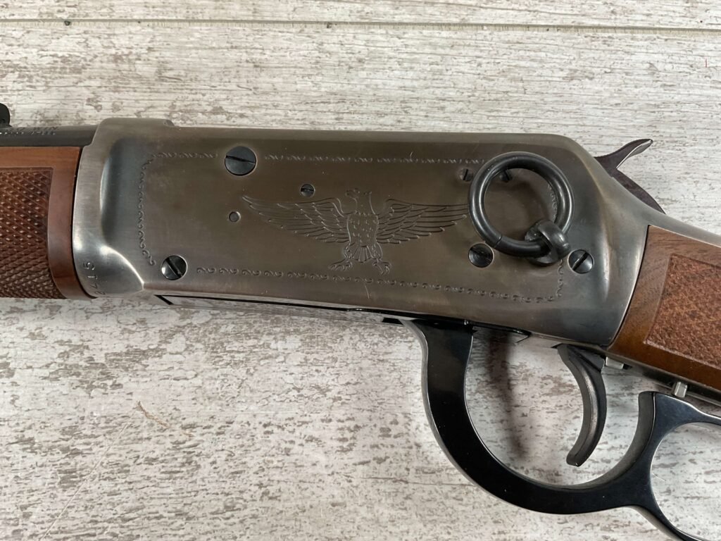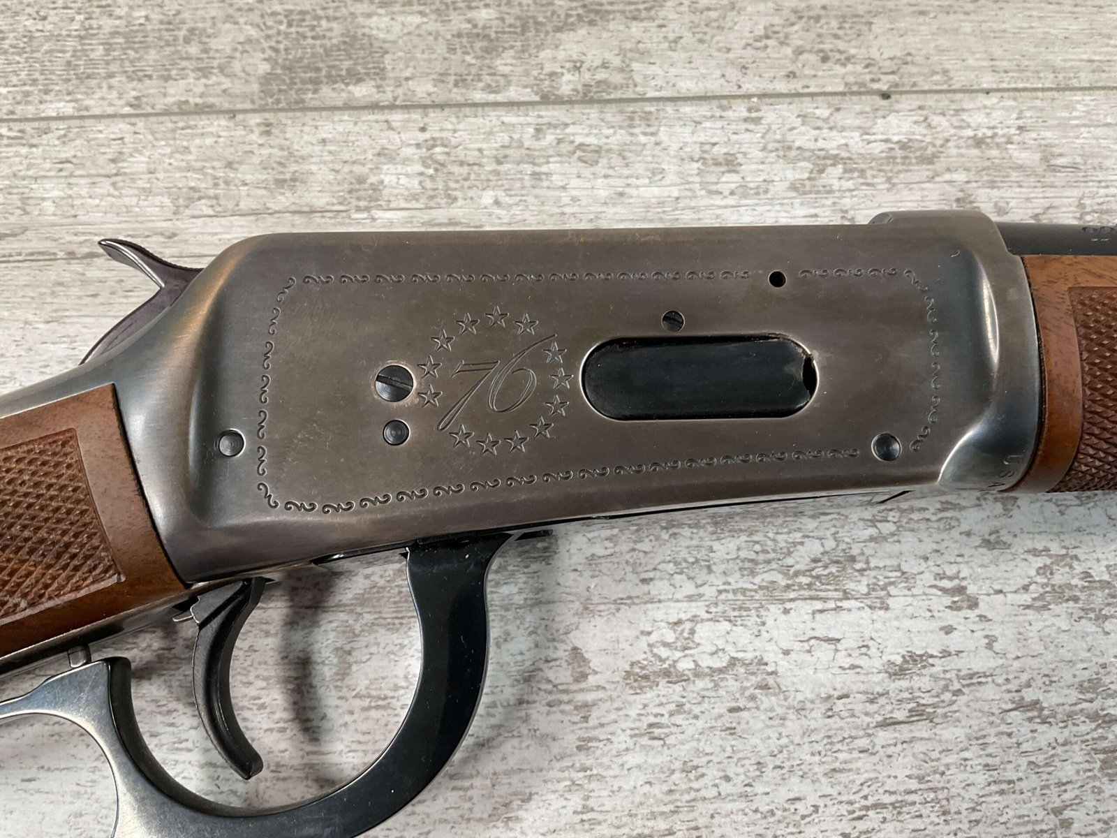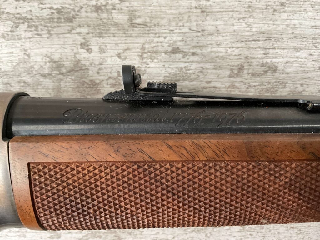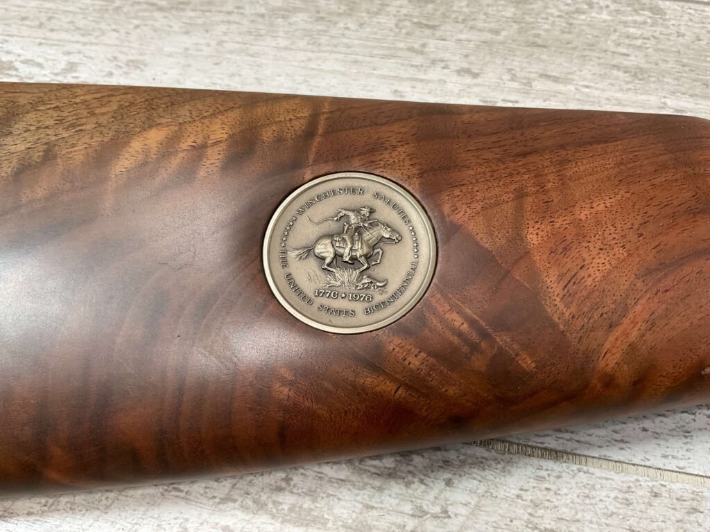 THE FIREARM IS IN A SADDLE RING CARBINE CONFIGURATION AND SHOWS A DELUXE WALNUT CHECKERED WOOD STOCK WITH INLAID SILVER COIN MARKED, “WINCHESTER SALUTES THE UNITED STATES BICENTENNIAL 1776-1976.” THE RECEIVER SHOWS A SILVER FINISH WITH FACTORY ENGRAVING. LEFT SIDE MARKED WITH AN ENGRAVED BORDER AND US BALD EAGLE. THE RIGHT SIDE IS MARKED WITH AN ENGRAVED BORDER AND 76 SURROUNDED BY 13 STARS. IN ORIGINAL SHIPPING BOX WITH WINCHESTER CUSTOM DESIGN WALL RACK TO DISPLAY THE RIFLE.
